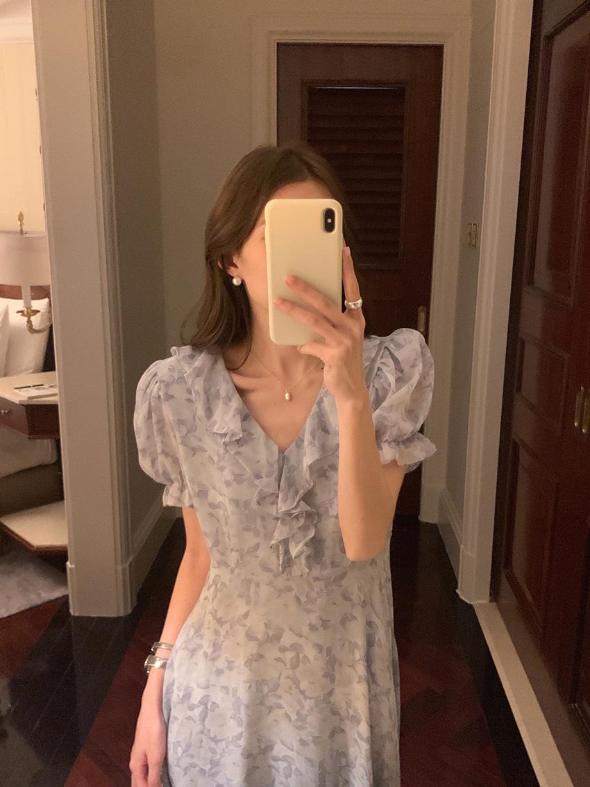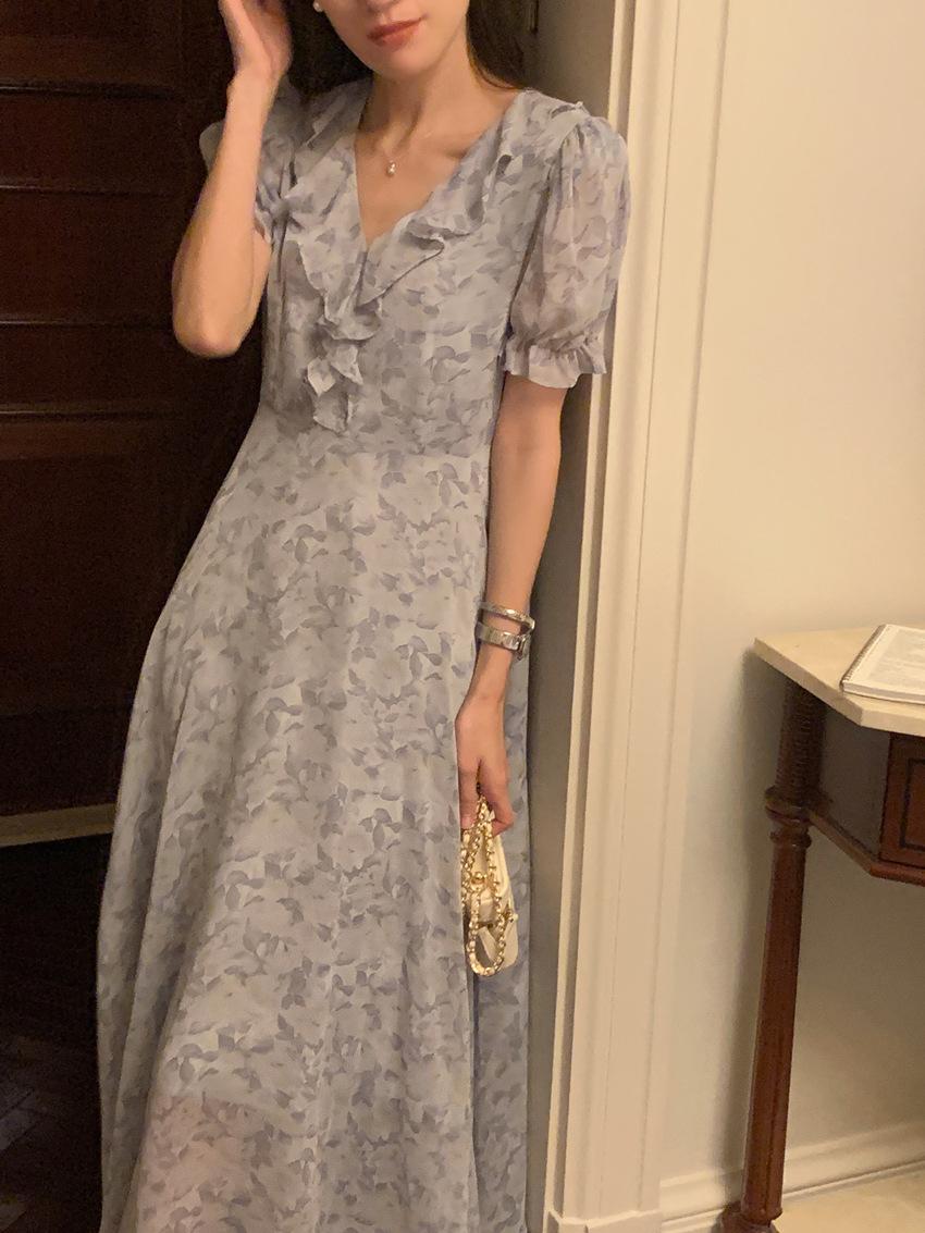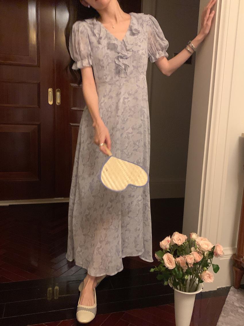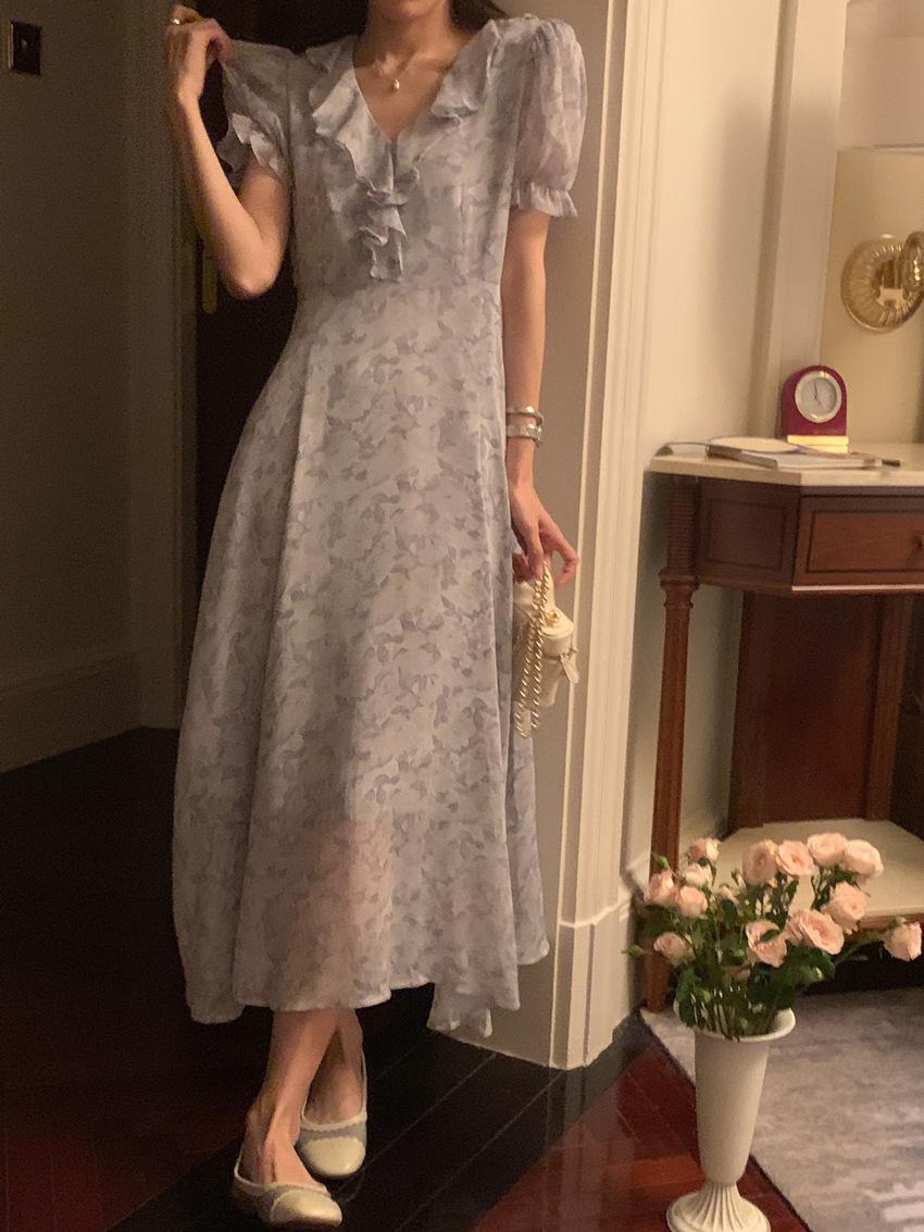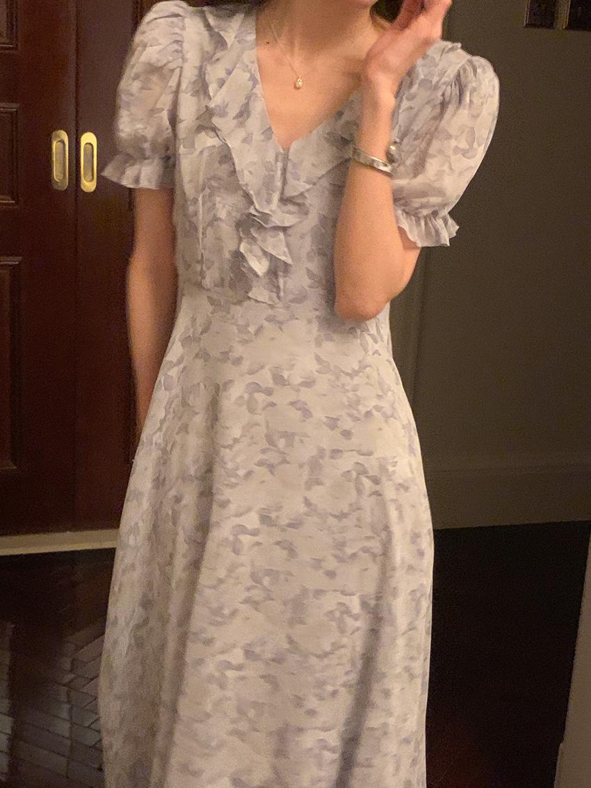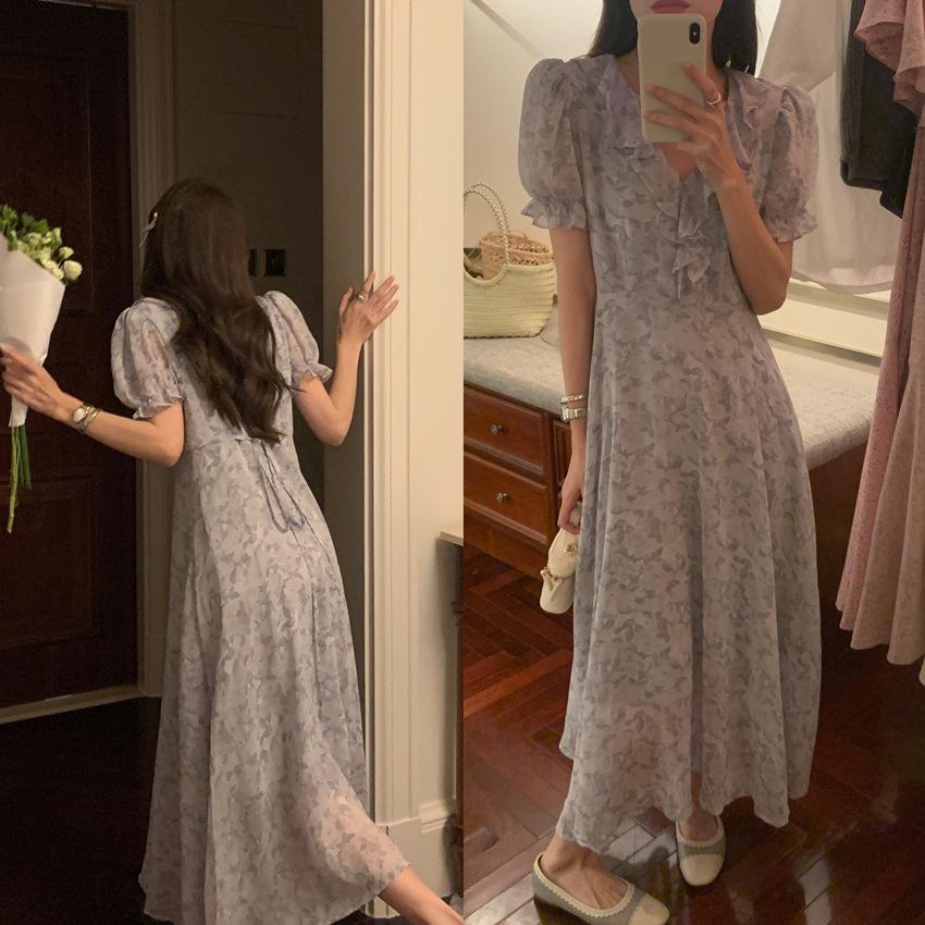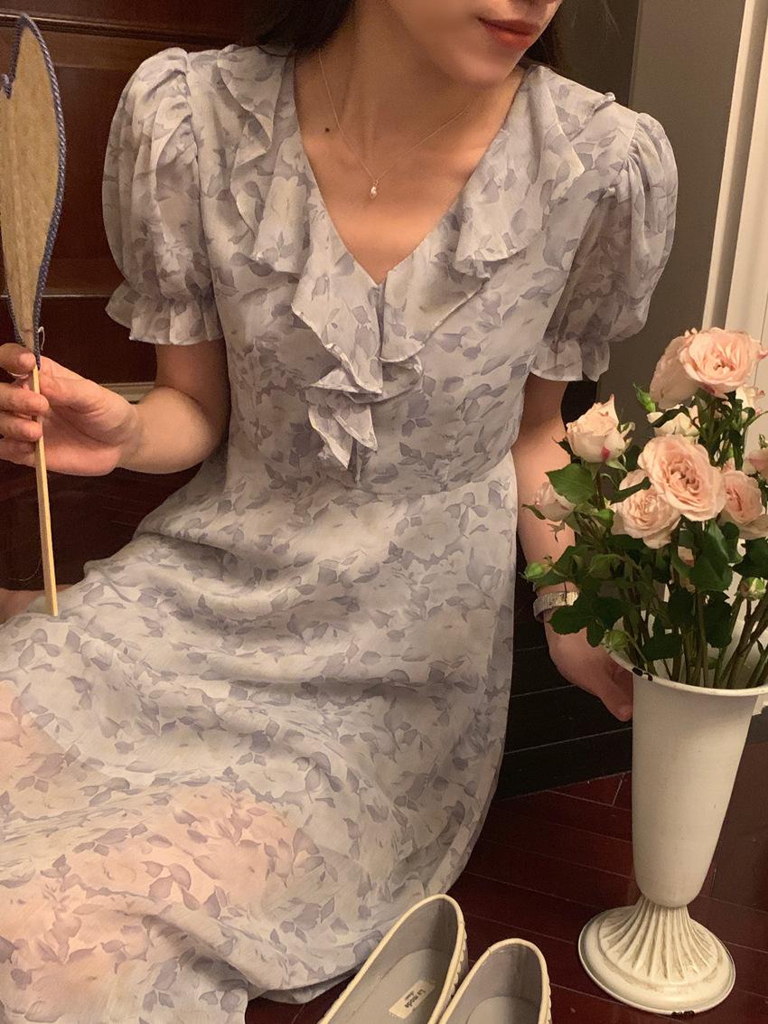 Vestido de gasa con cordones y mangas abullonadas con cuello en V y estampado floral retro francés suave de tiro real, ropa de mujer nueva