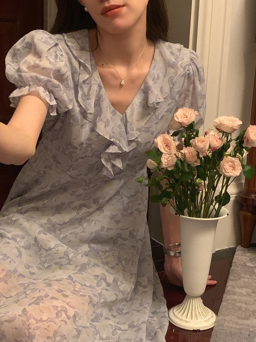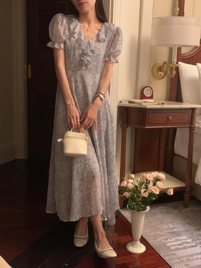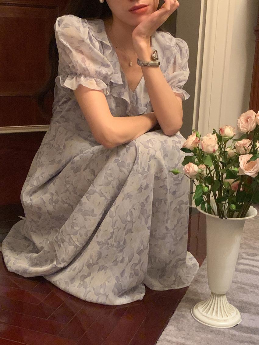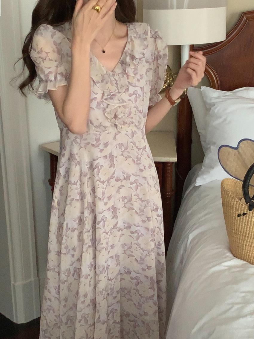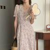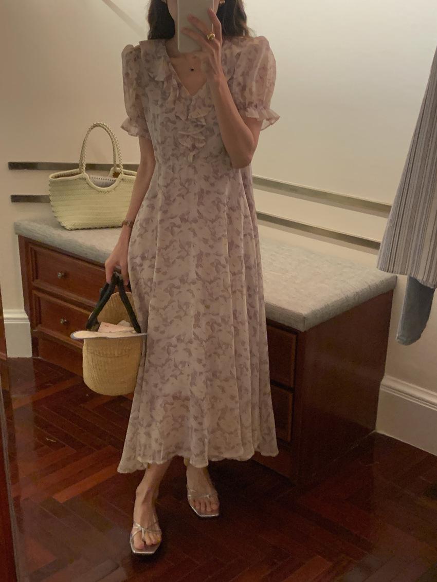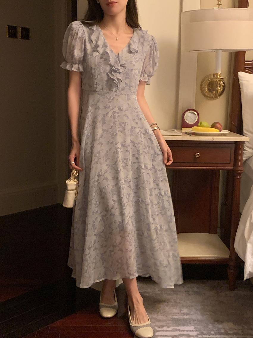 Vestido de gasa con cordones y mangas abullonadas con cuello en V y estampado floral retro francés suave de tiro real, ropa de mujer nueva
