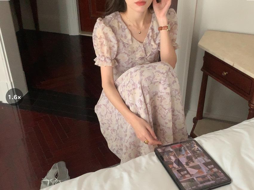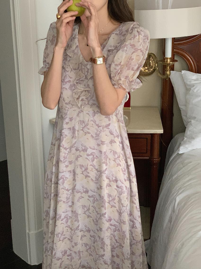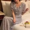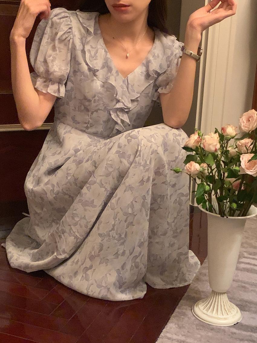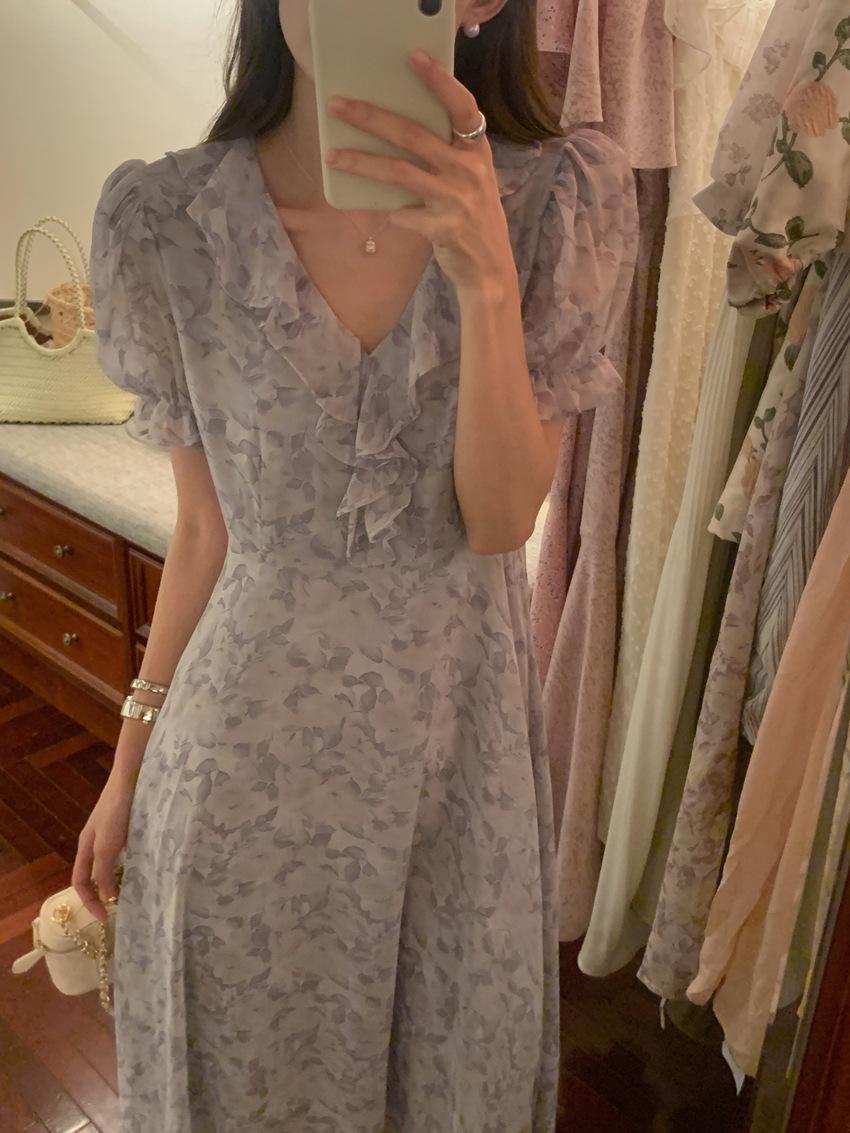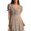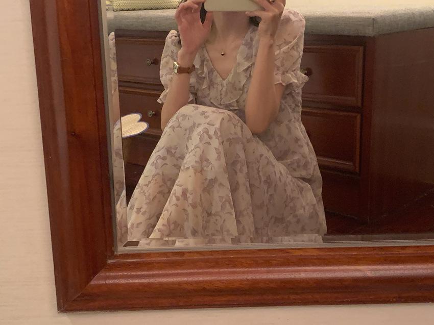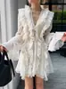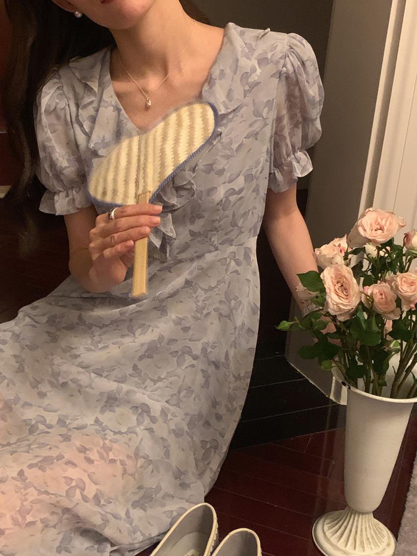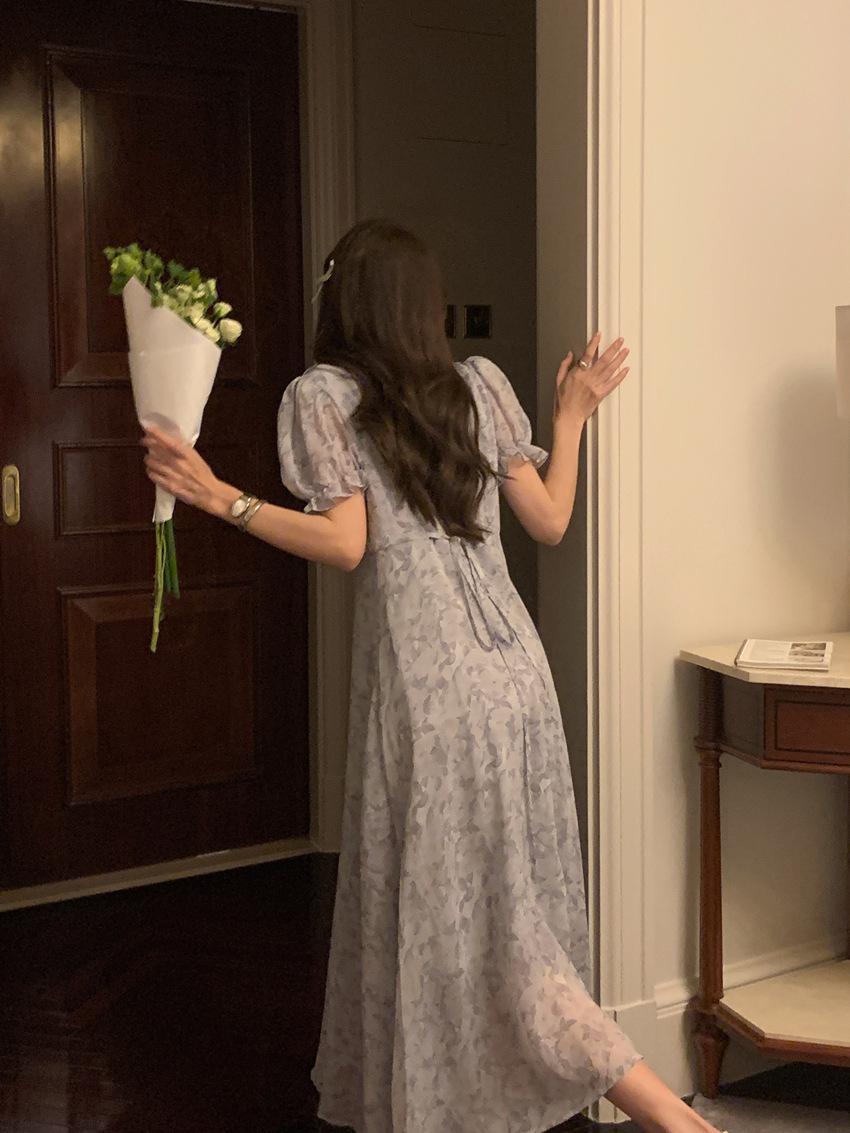Vestido de gasa con cordones y mangas abullonadas con cuello en V y estampado floral retro francés suave de tiro real, ropa de mujer nueva