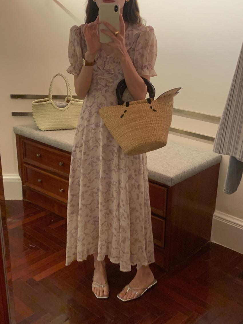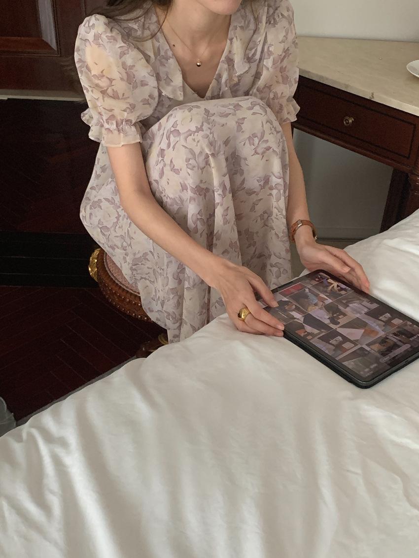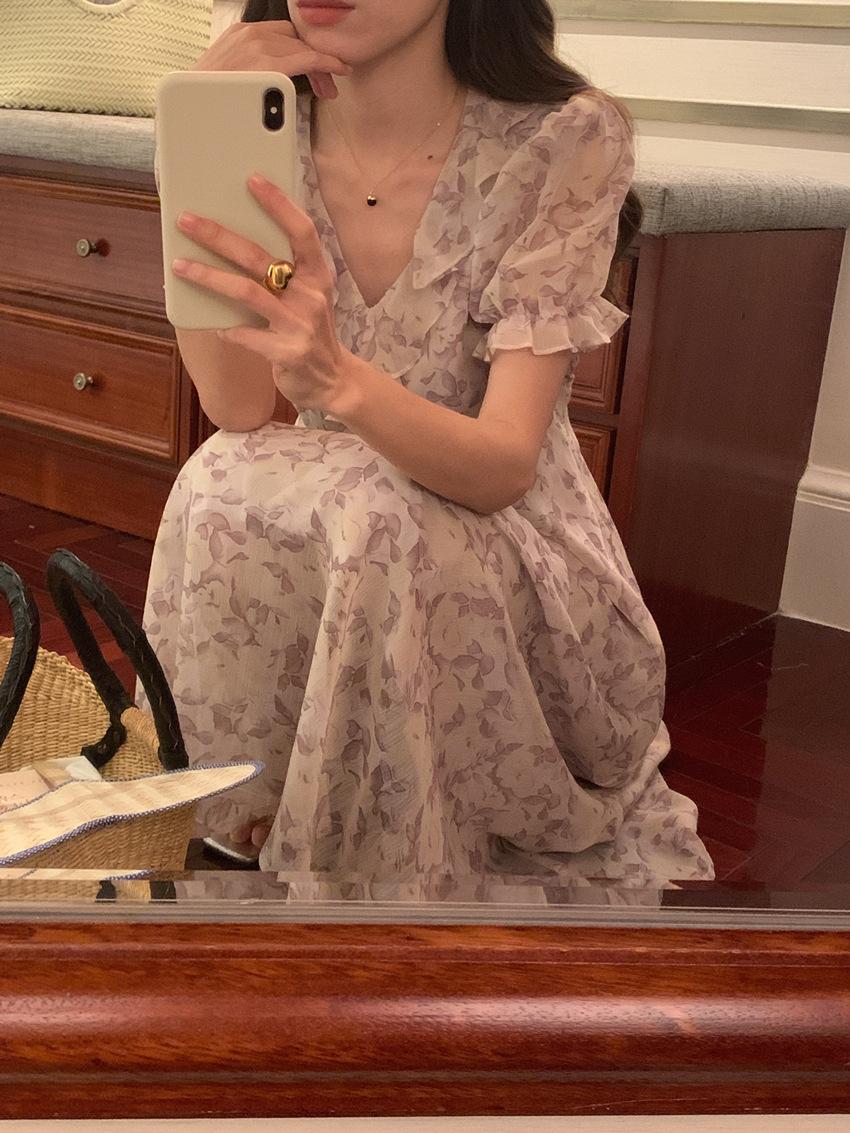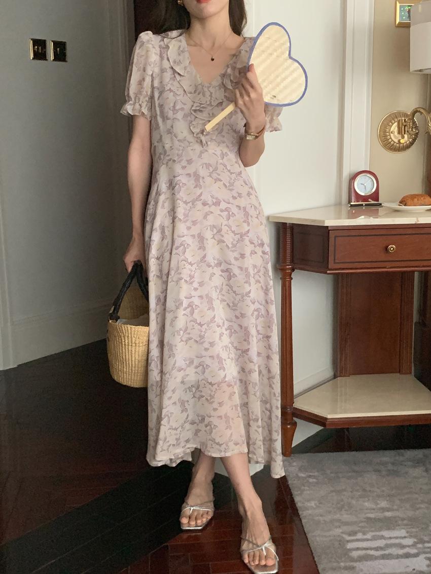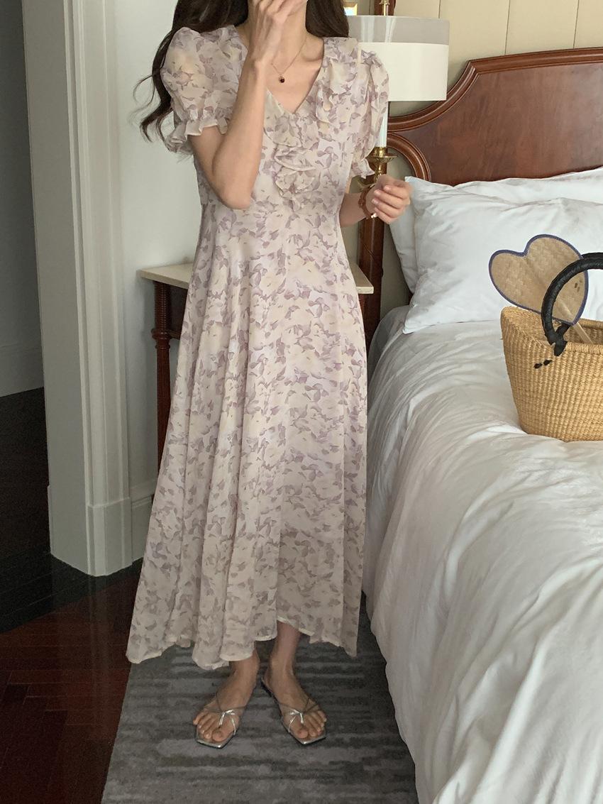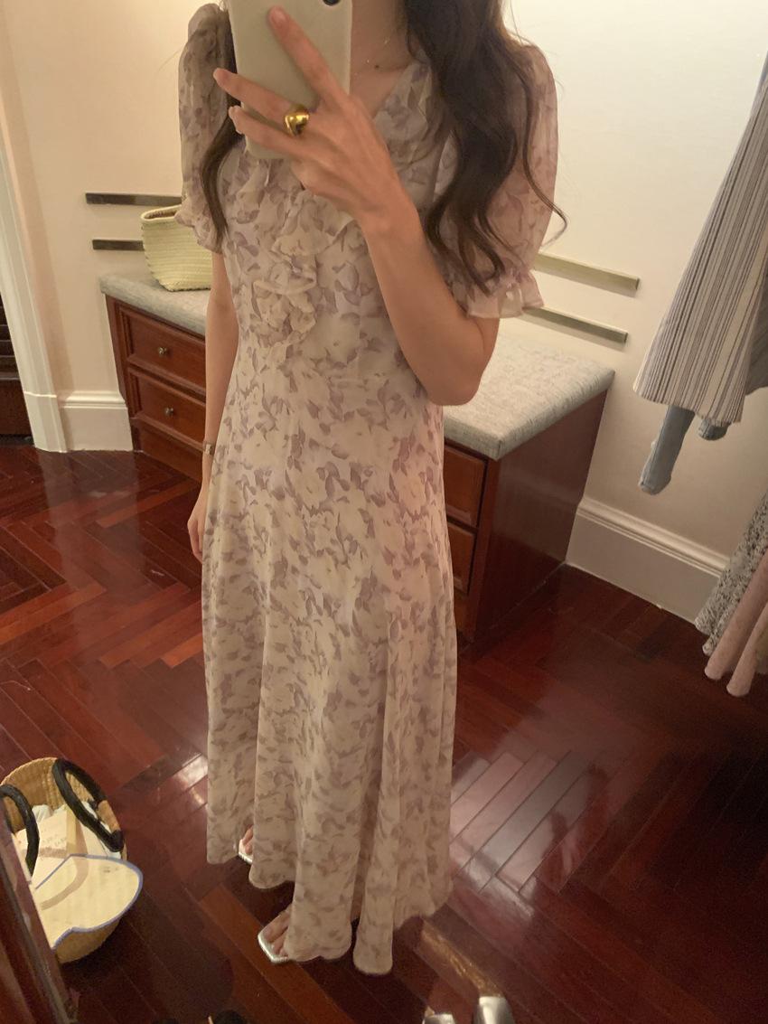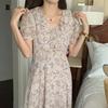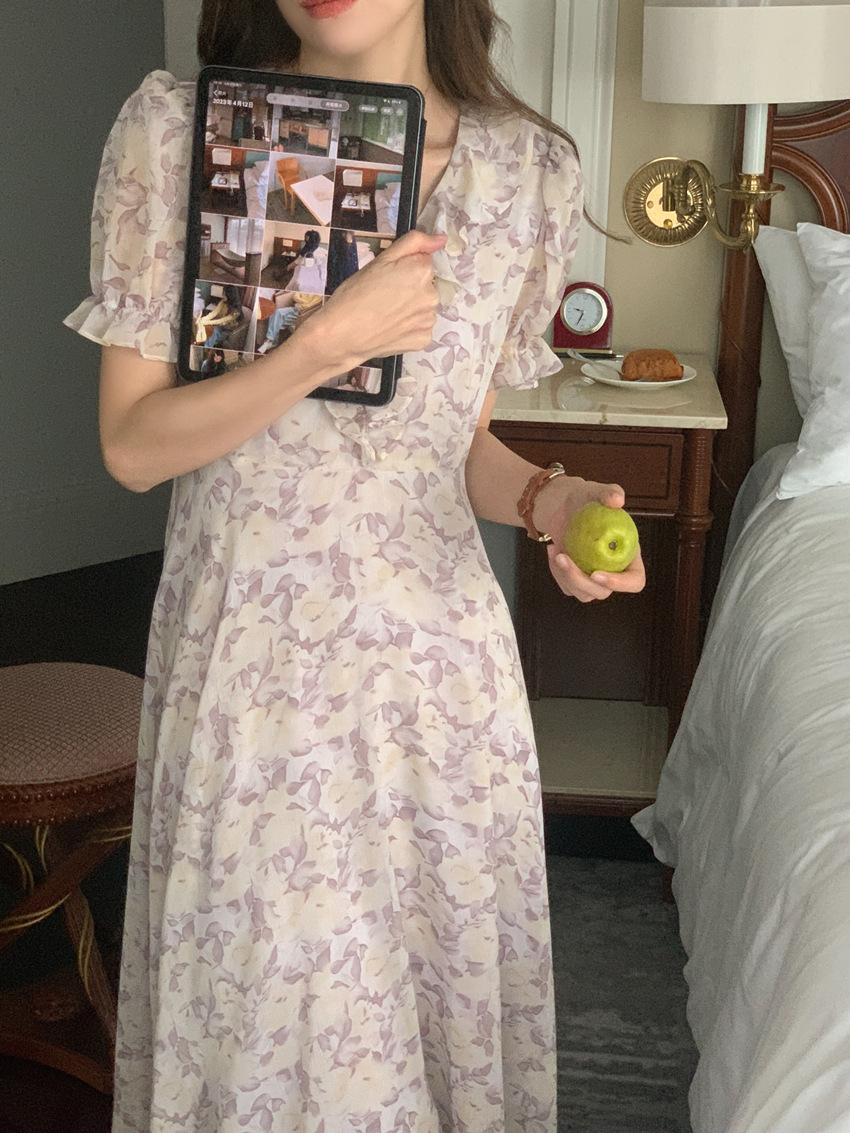 Vestido de gasa con cordones y mangas abullonadas con cuello en V y estampado floral retro francés suave de tiro real, ropa de mujer nueva