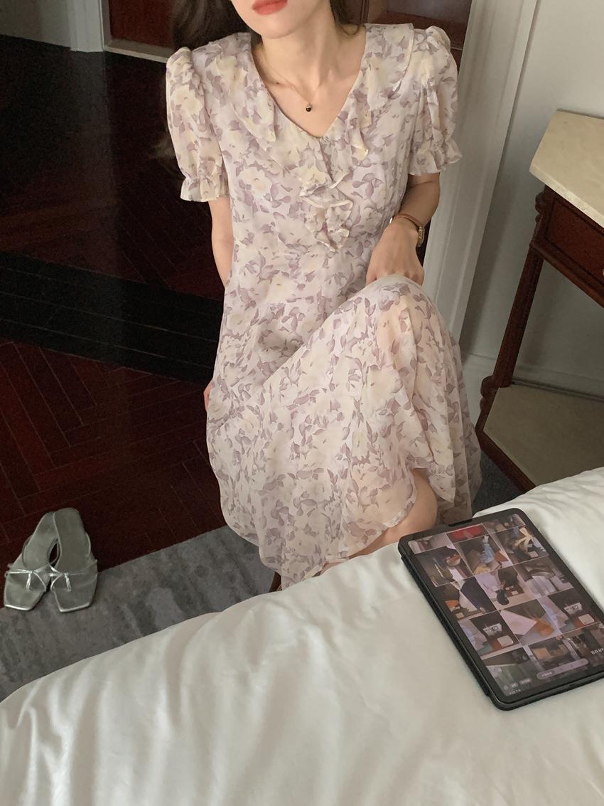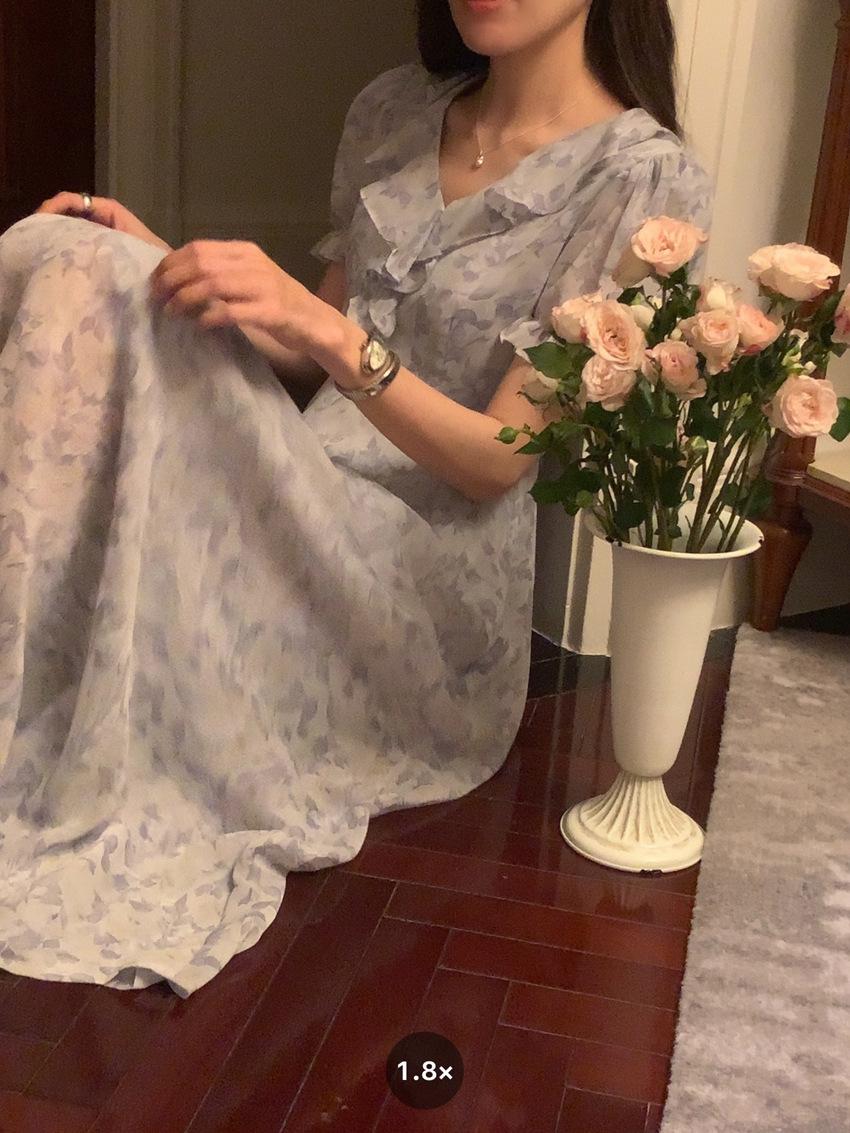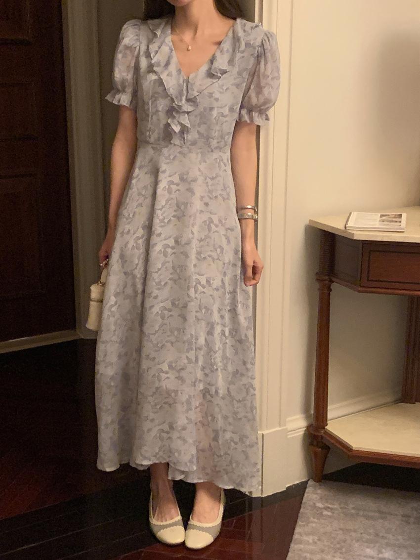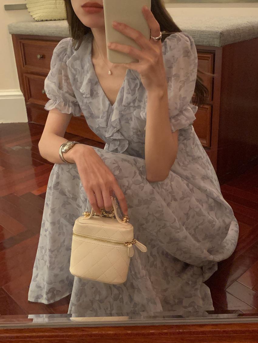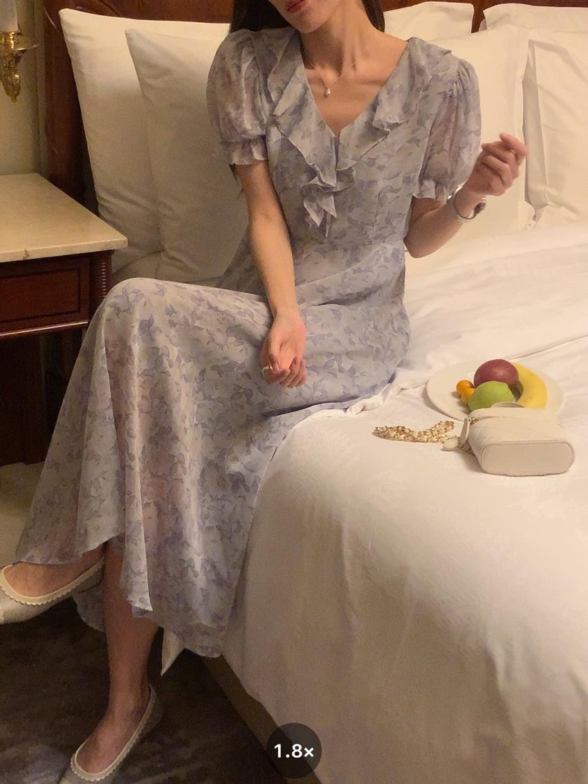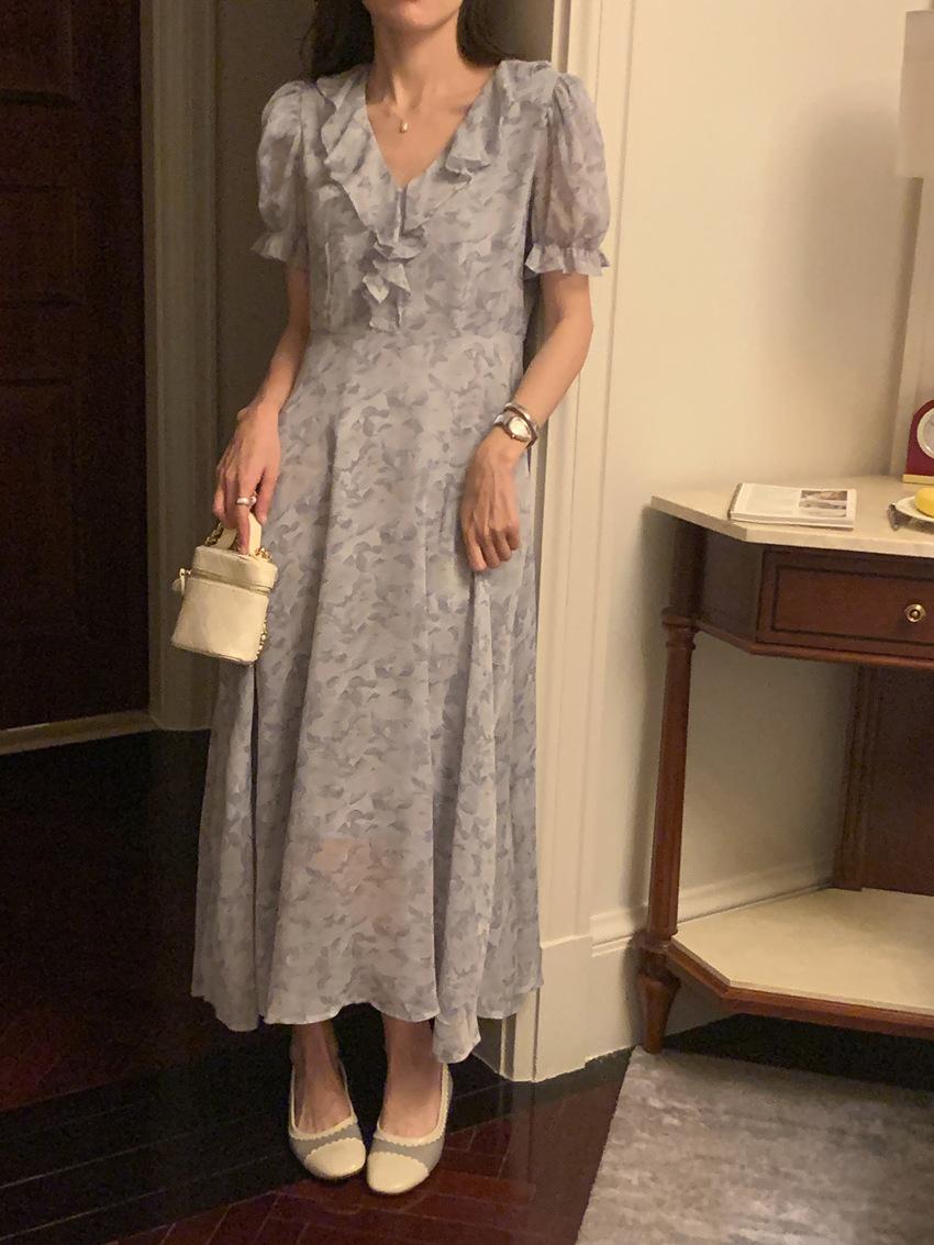 Vestido de gasa con cordones y mangas abullonadas con cuello en V y estampado floral retro francés suave de tiro real, ropa de mujer nueva