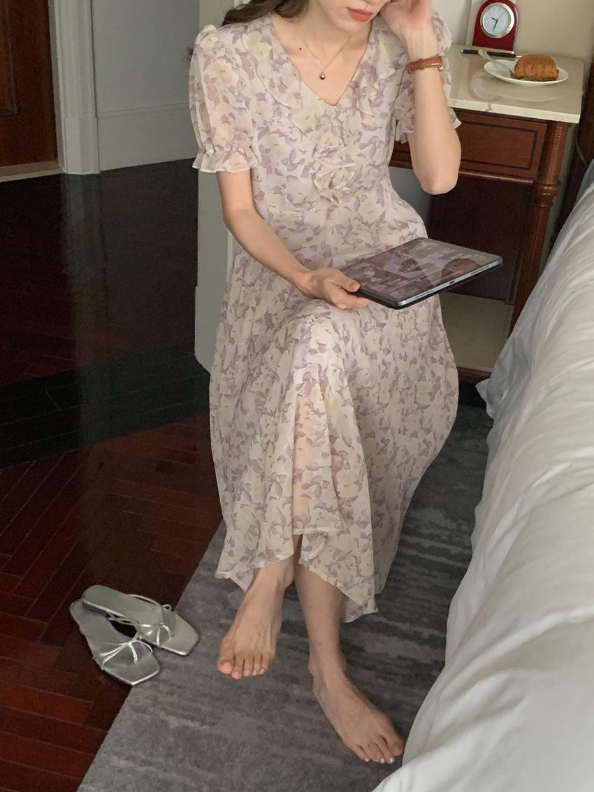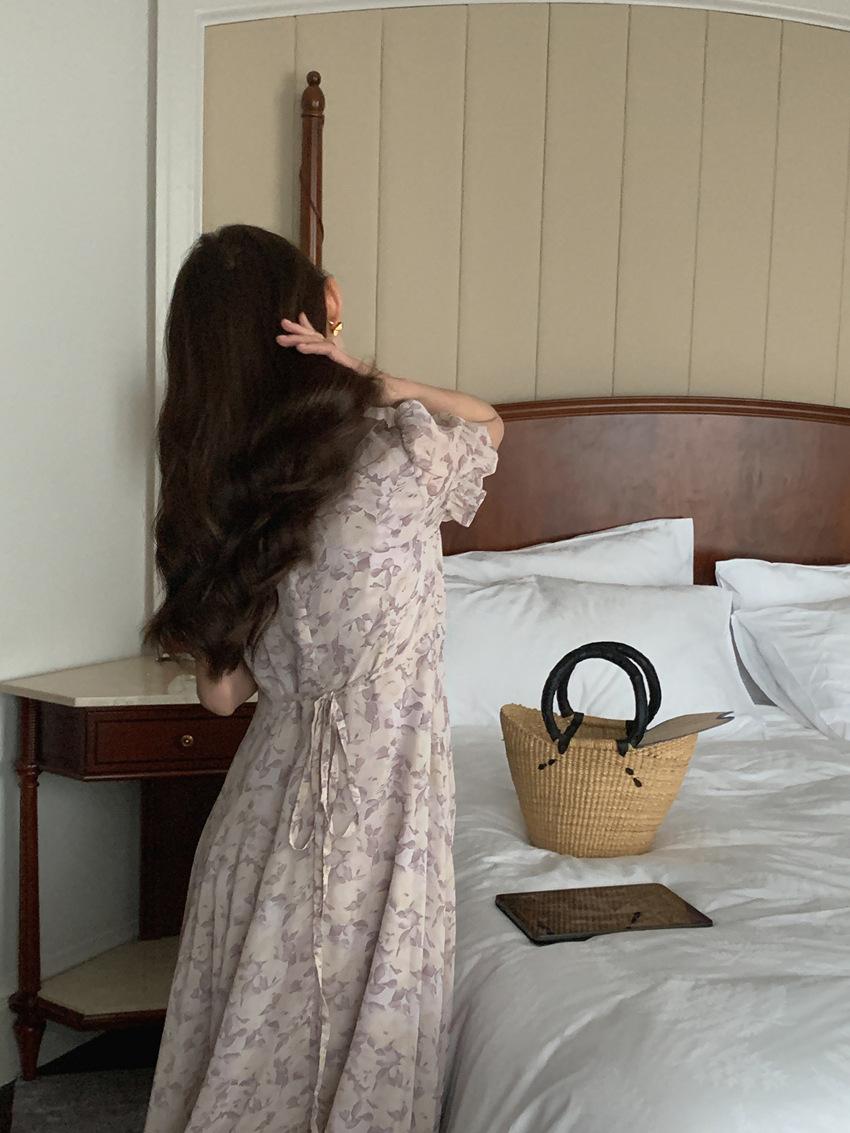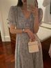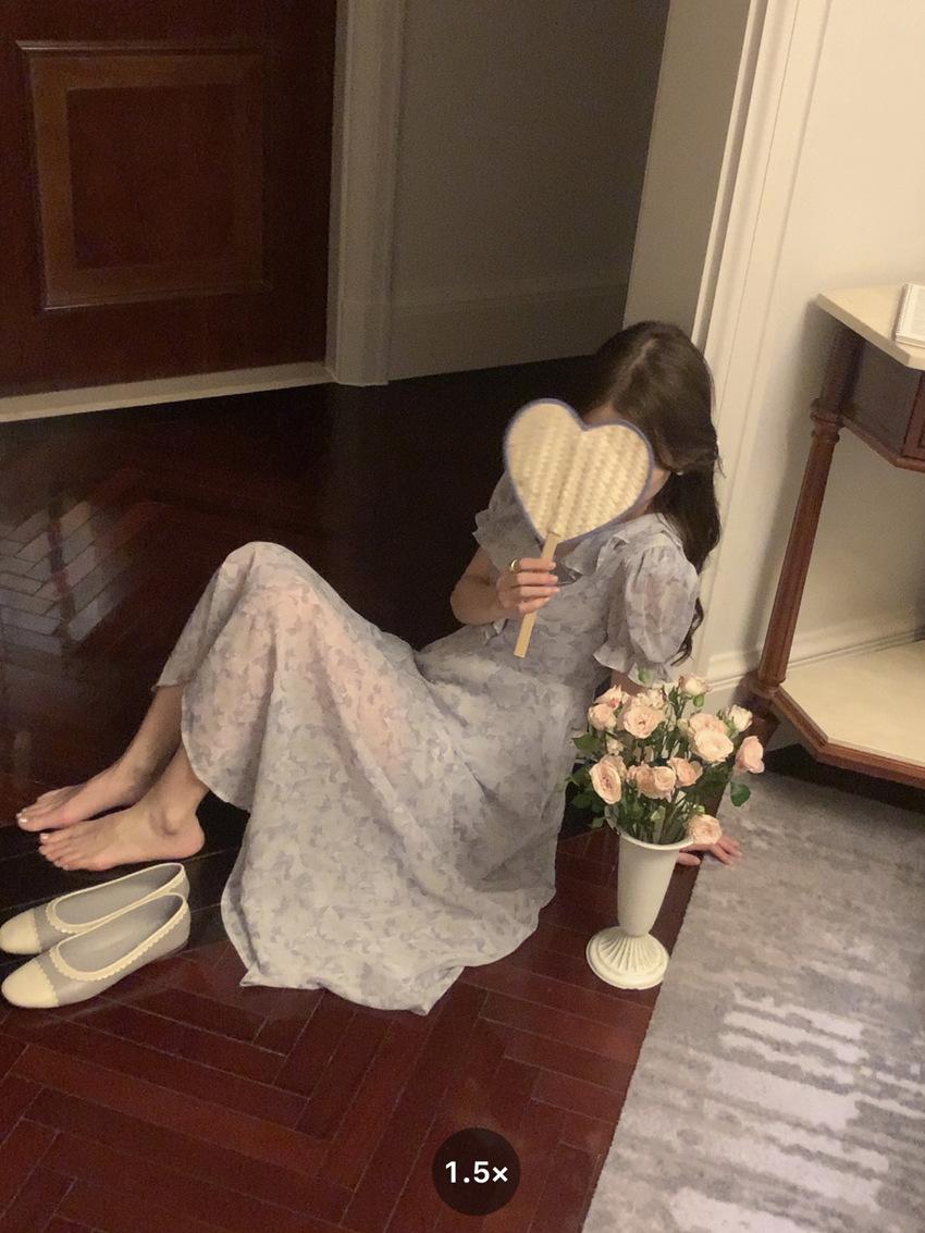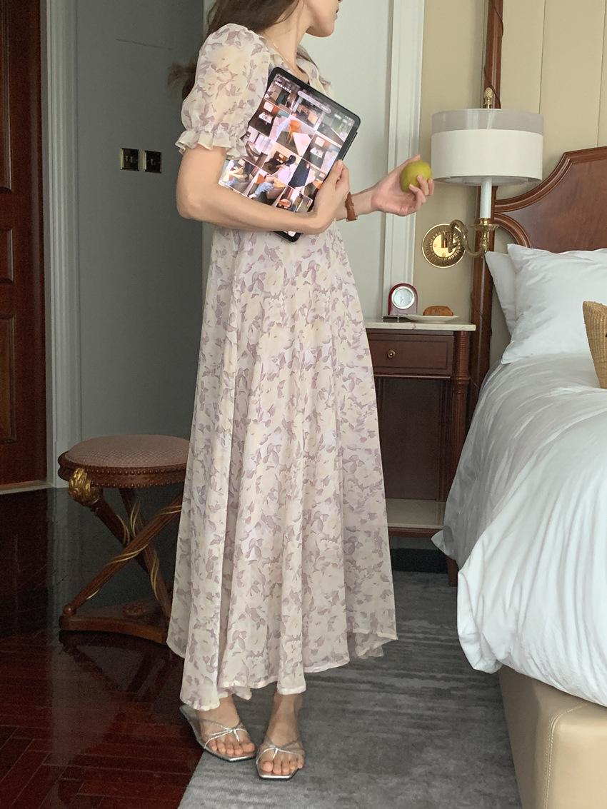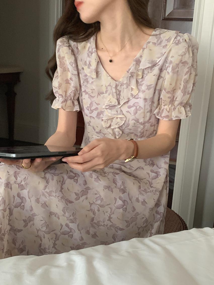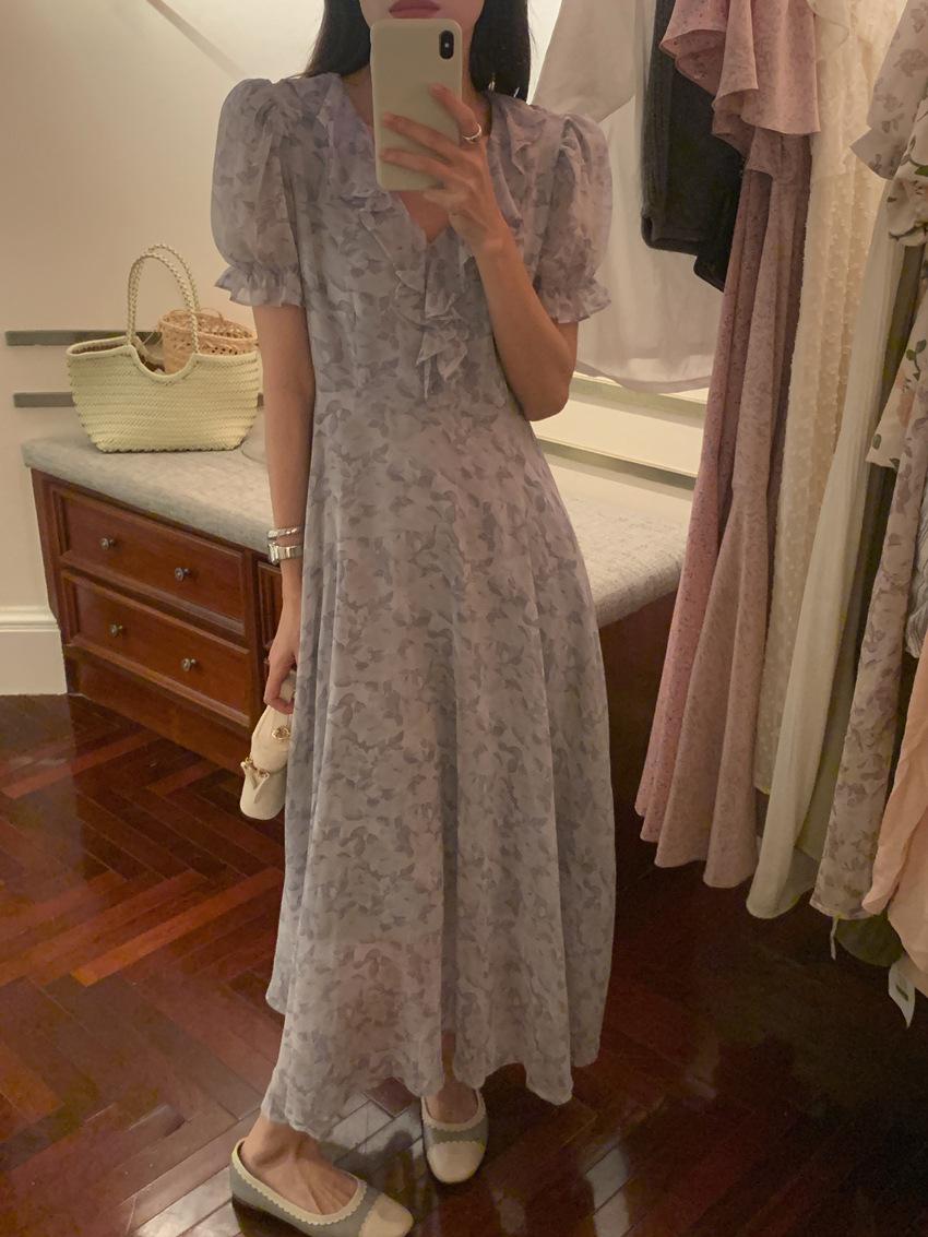Vestido de gasa con cordones y mangas abullonadas con cuello en V y estampado floral retro francés suave de tiro real, ropa de mujer nueva