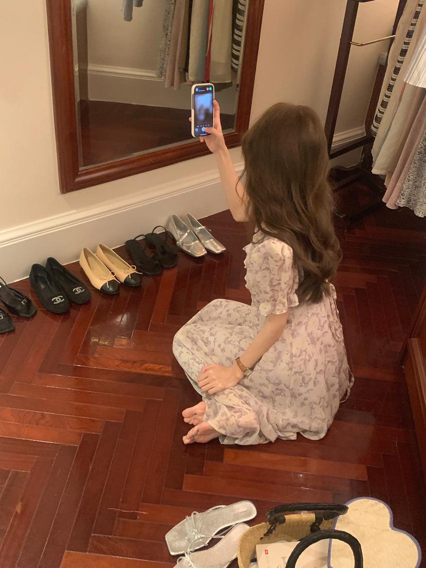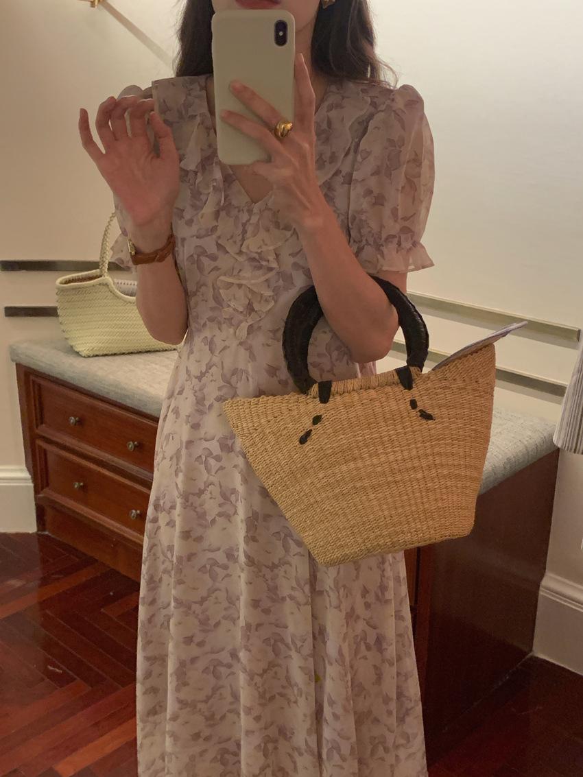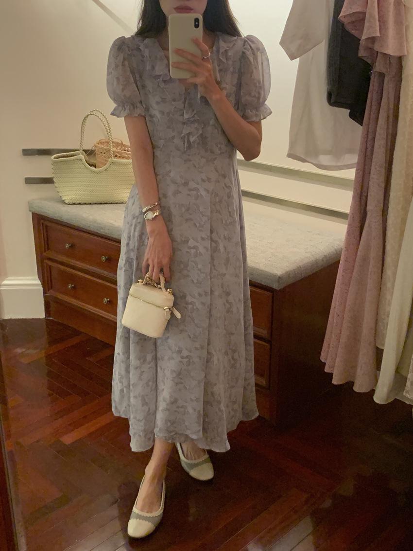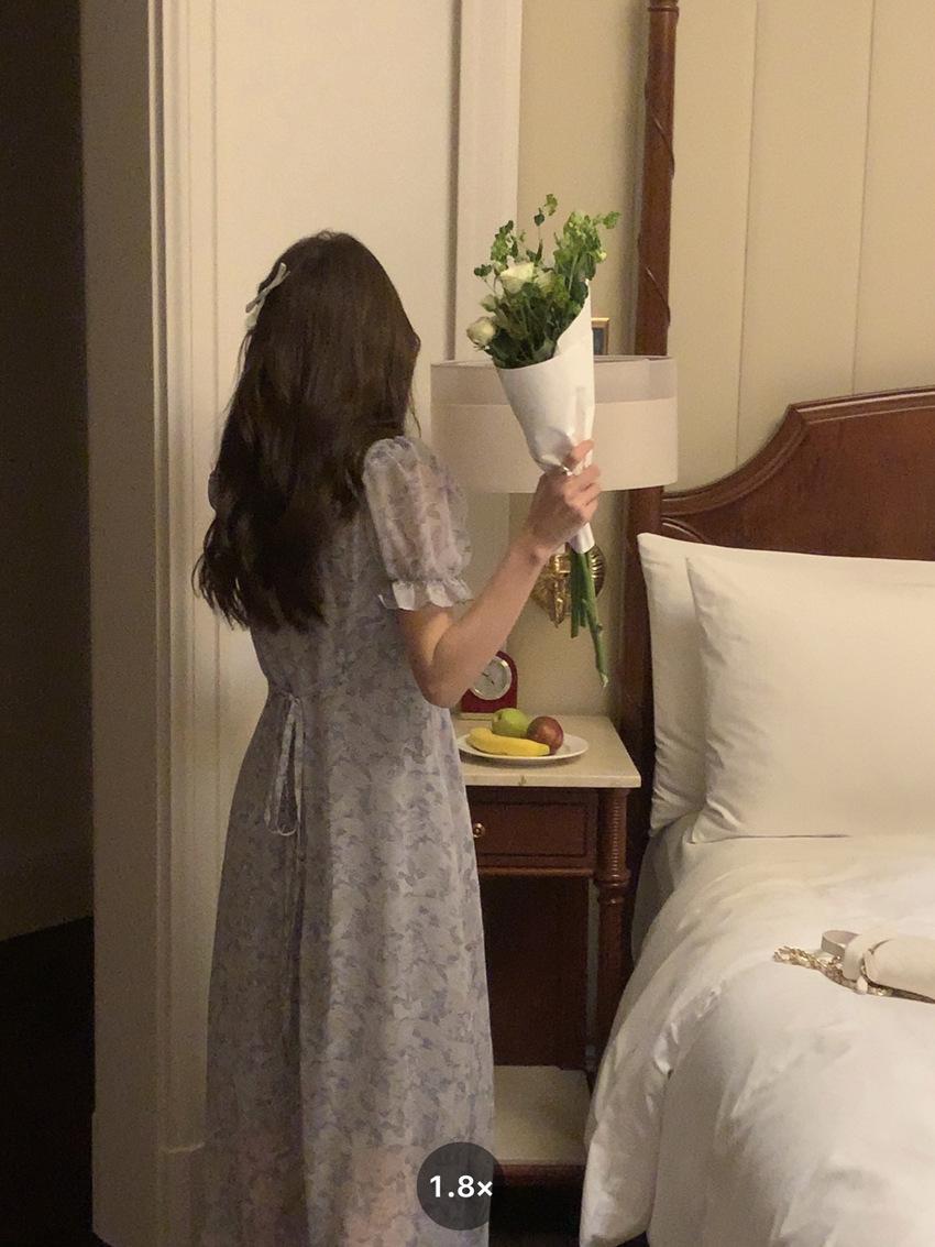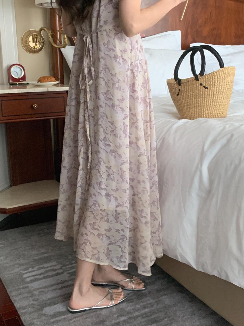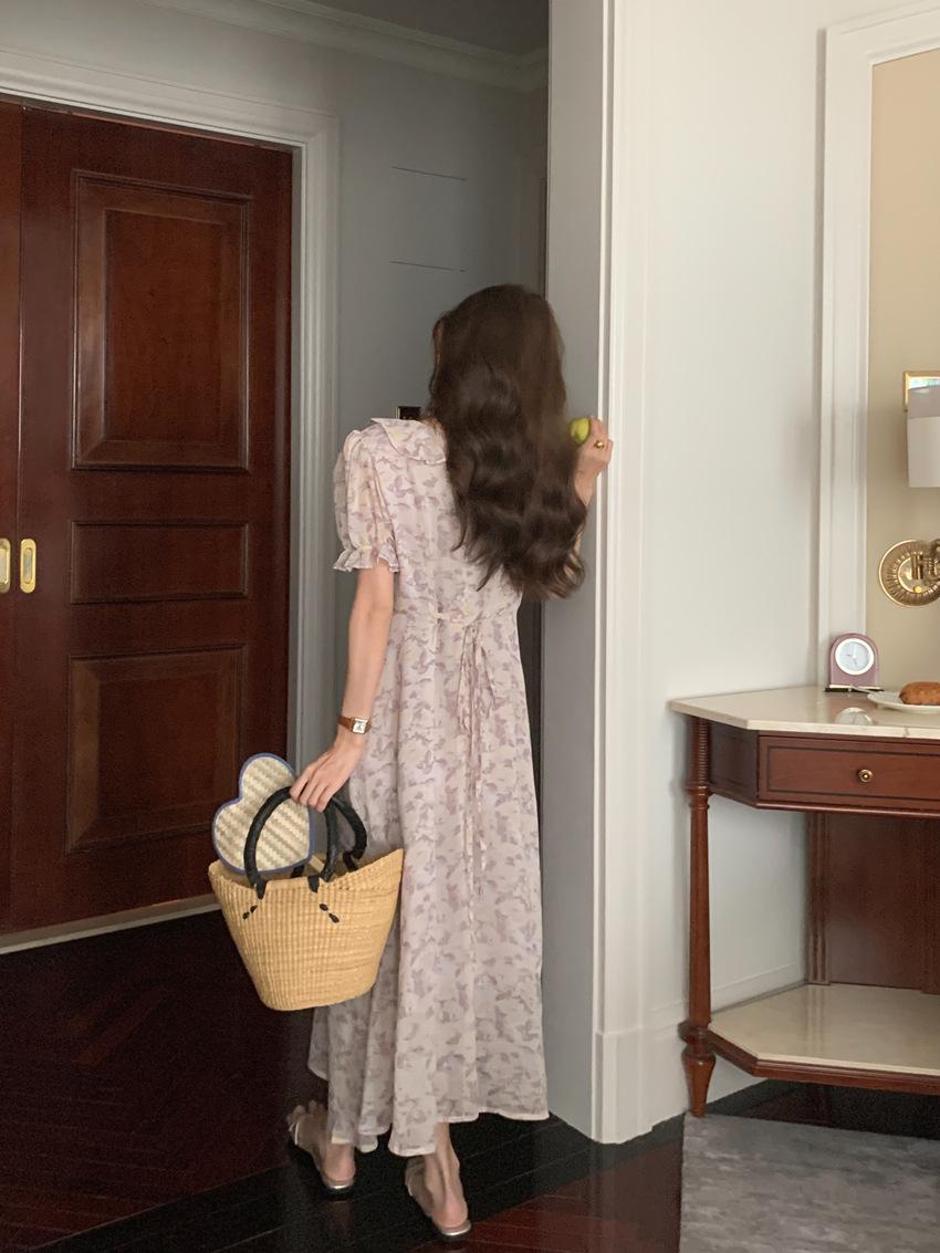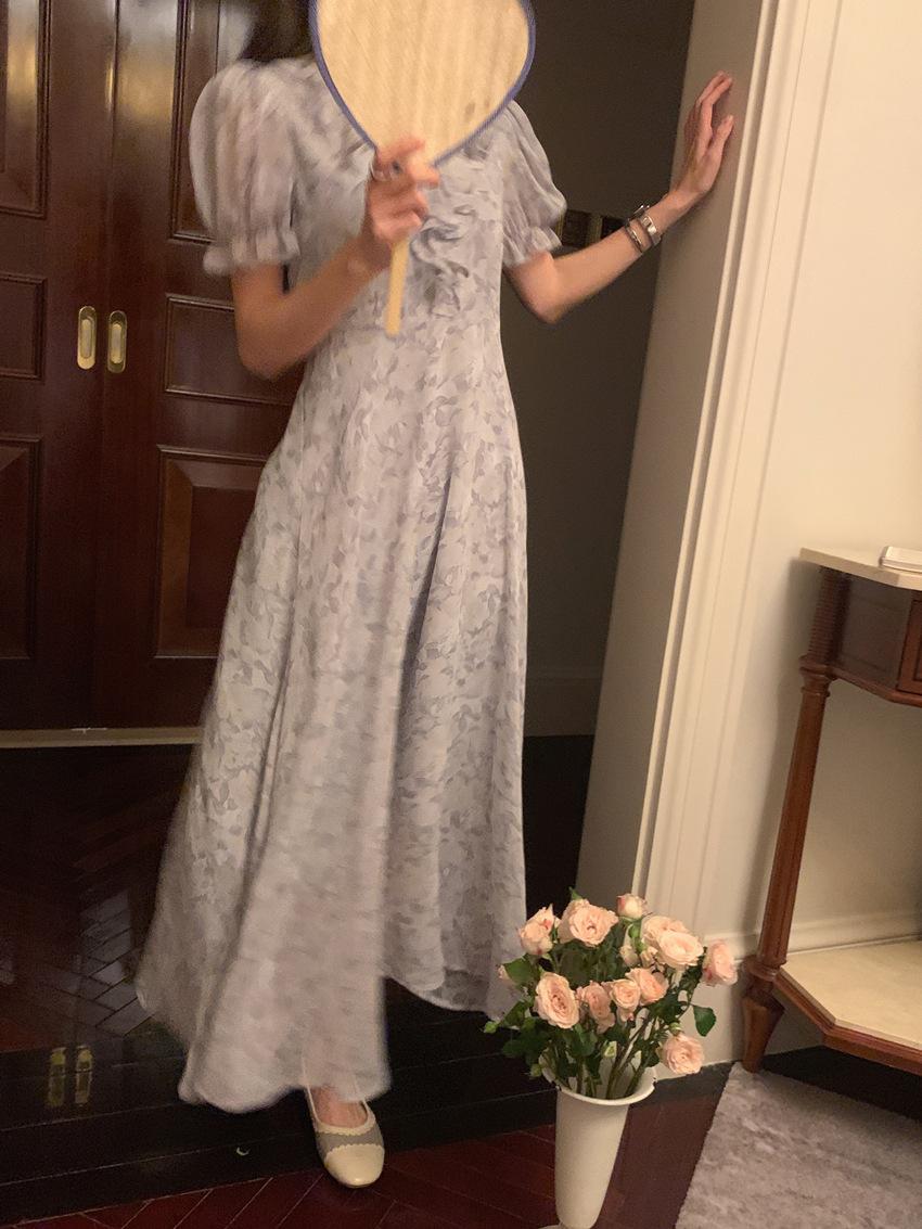 Vestido de gasa con cordones y mangas abullonadas con cuello en V y estampado floral retro francés suave de tiro real, ropa de mujer nueva