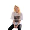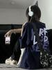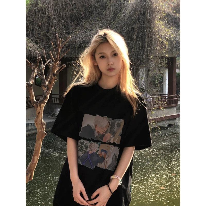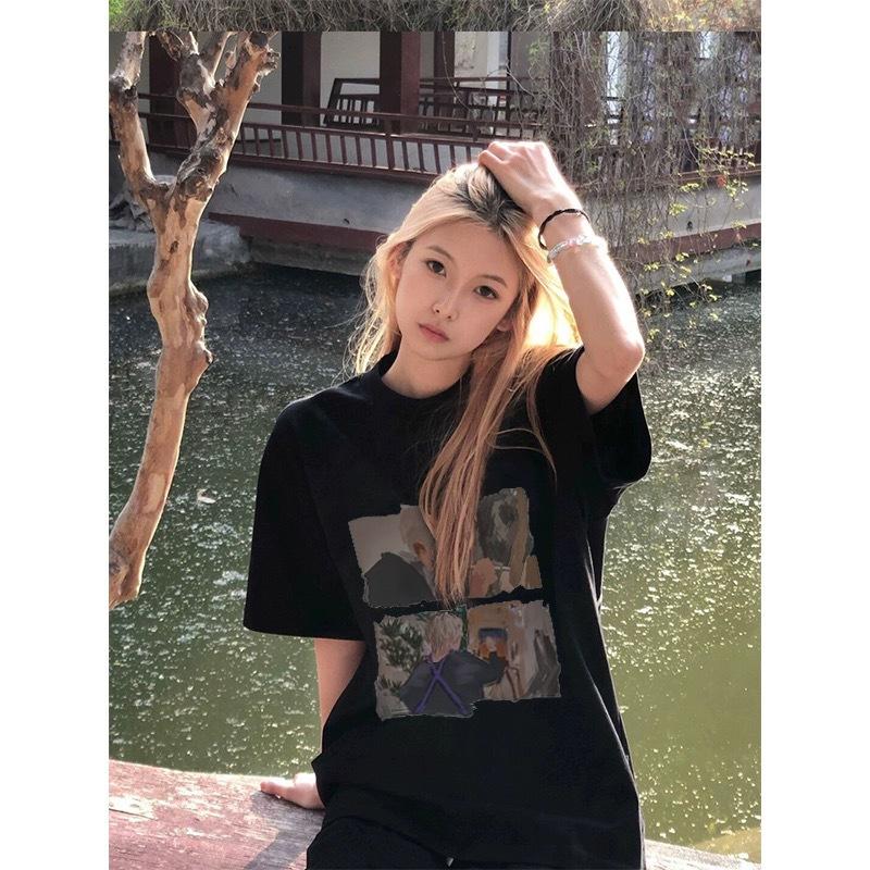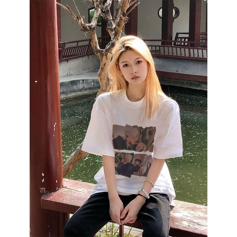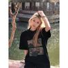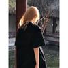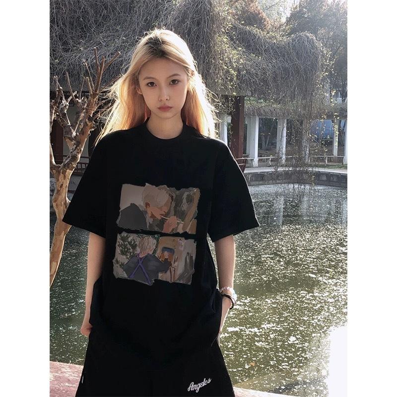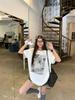 Camiseta de Algodón Puro con Cuello de Bolsa Estilo Americano Retro Estampada de Manga Corta para Mujer Verano Hombro Ancho Suelta Diseño Nicho Top de Media Manga