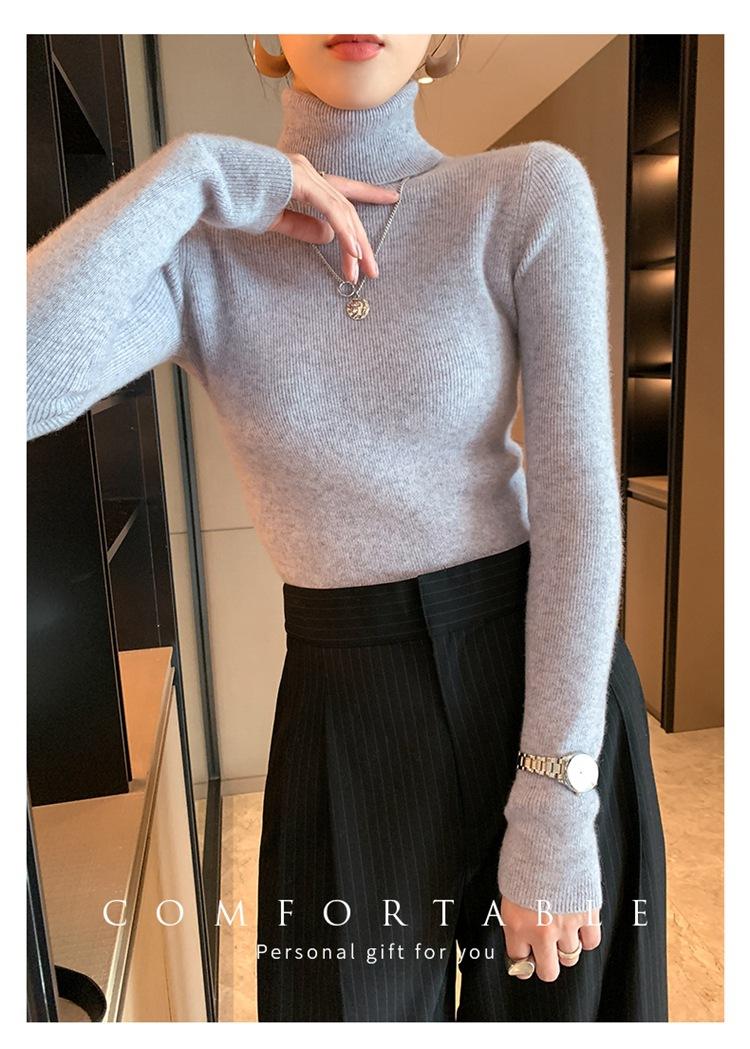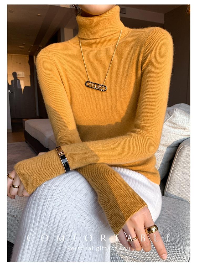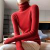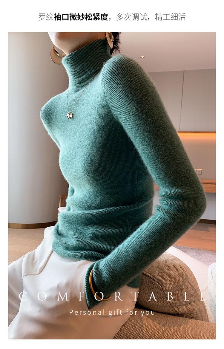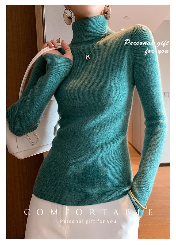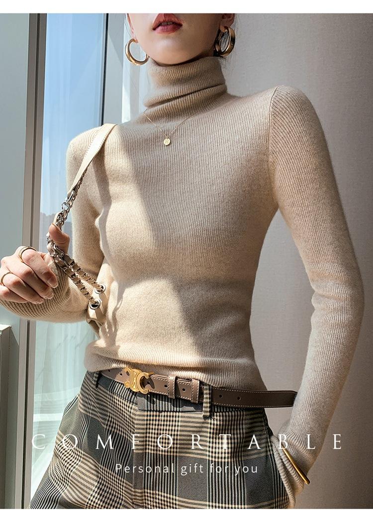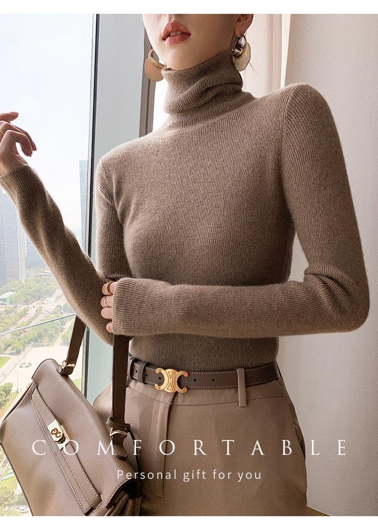 Suéter de cachemira 100% pura para mujer, suéter ajustado de manga larga, sin costuras, con solapa alta y cordón, para otoño e invierno