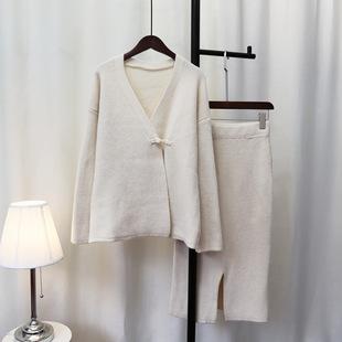 | Traje de dos piezas con falda de cárdigan de punto de estilo chino para mujer, otoño e invierno 2023, nuevo diseño, suéter con temperamento, tendencia |