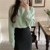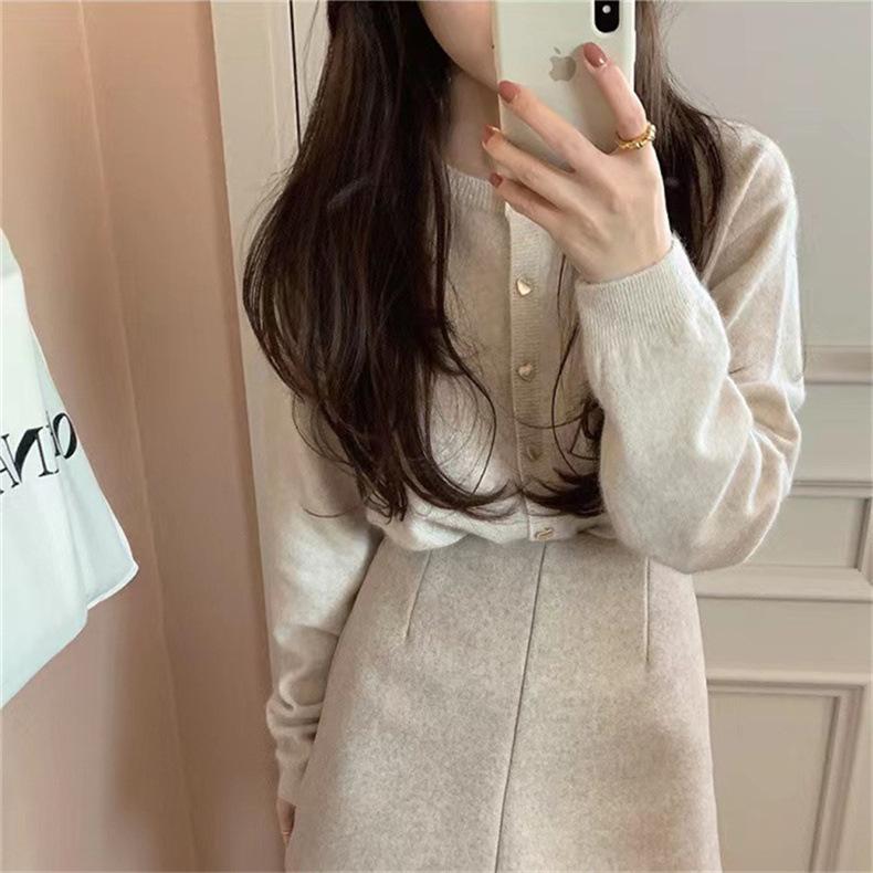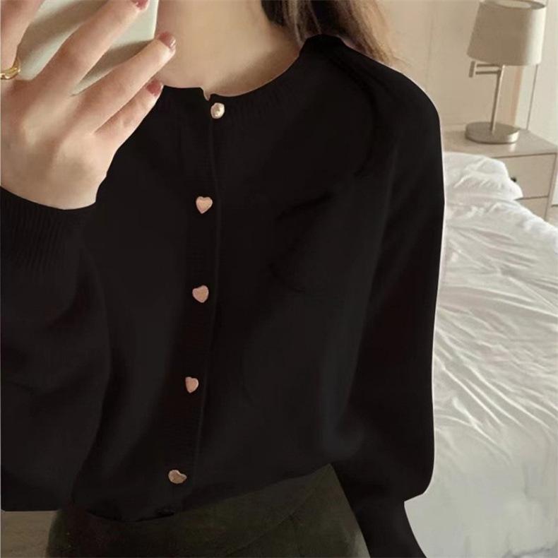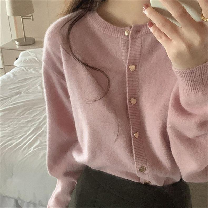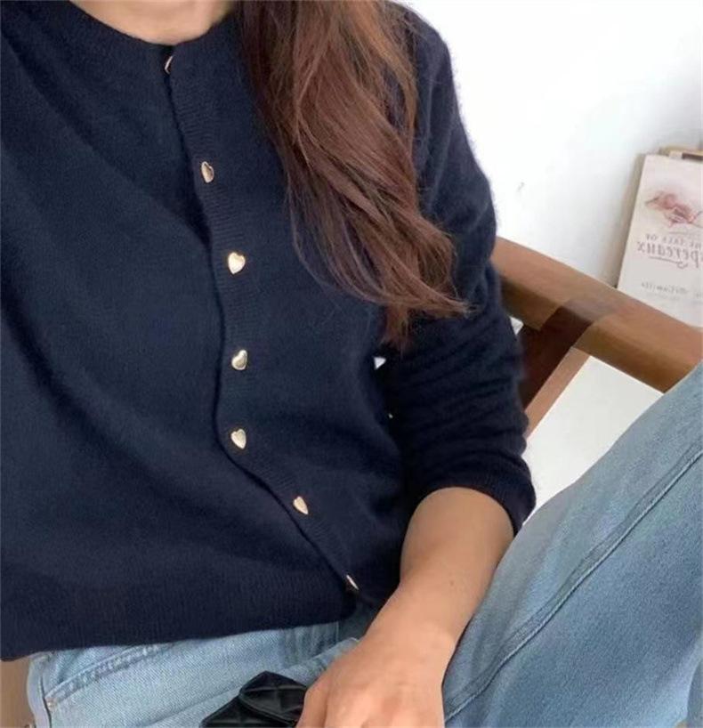 Suéteres de Primavera y Otoño con Botón de Amor, Tops Suaves y Cerosos para Mujer, Coreano, Ajustado, Cuello Redondo, Estilo Gentil, Tejido de Manga Larga, Top Exterior para Mujer