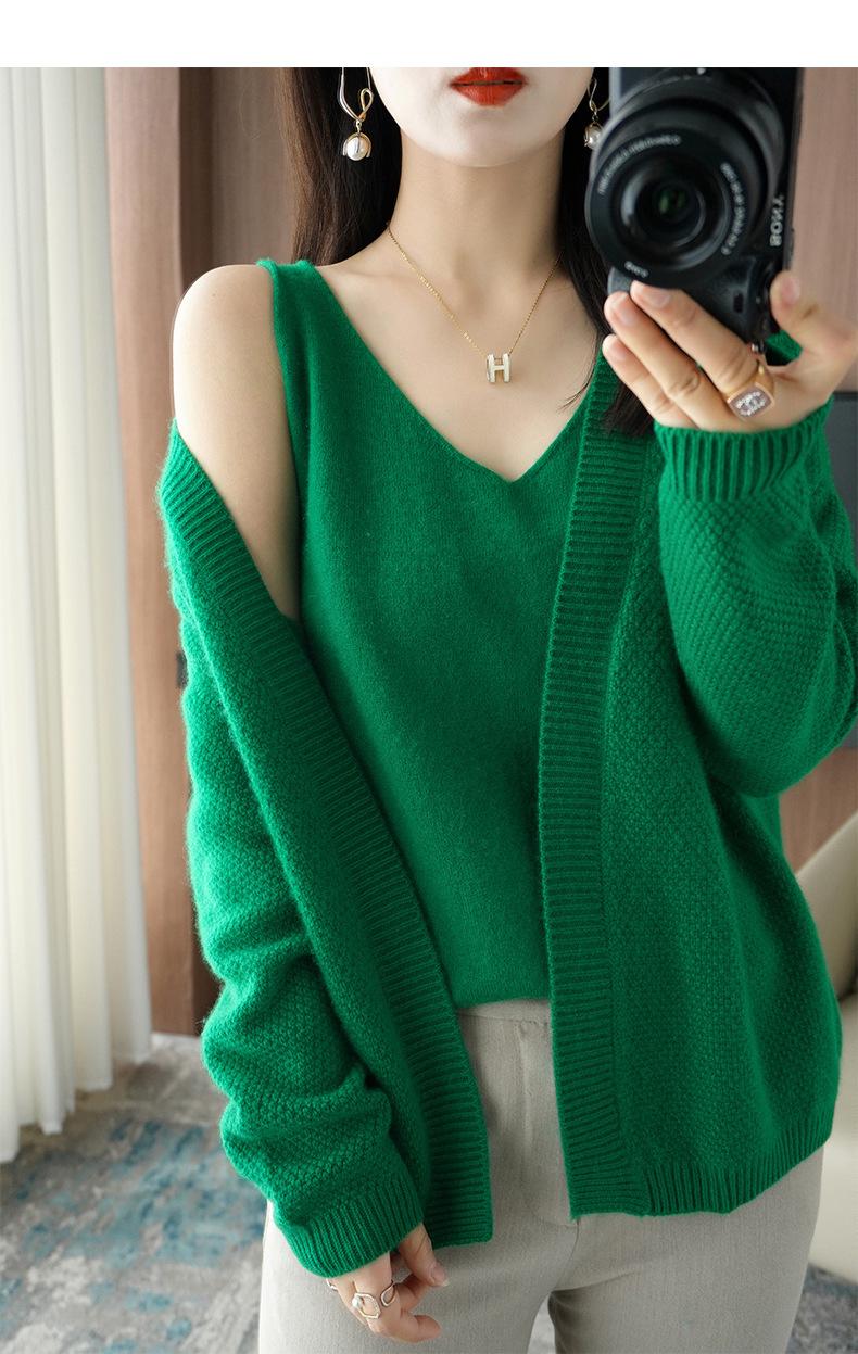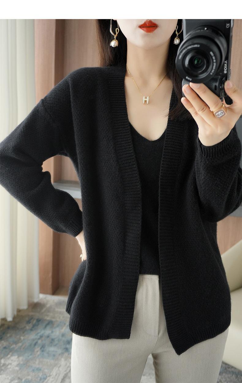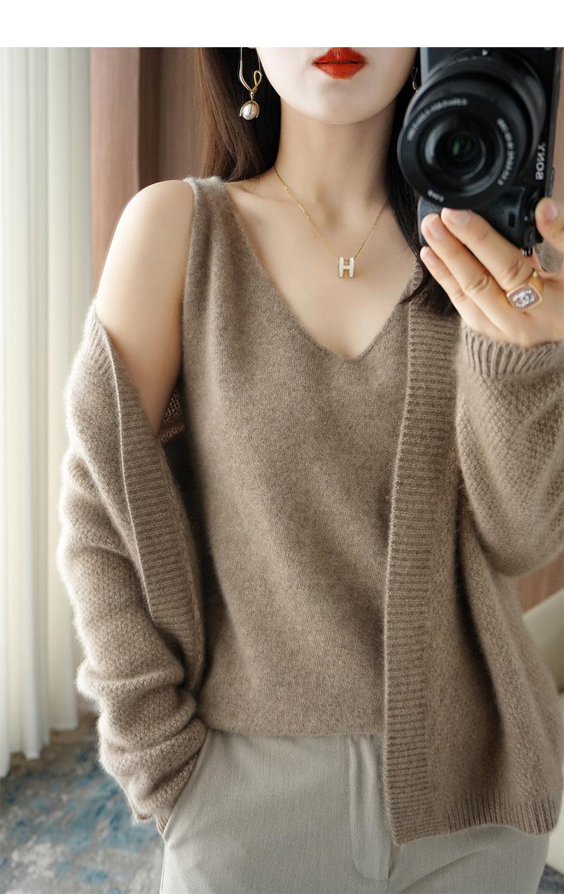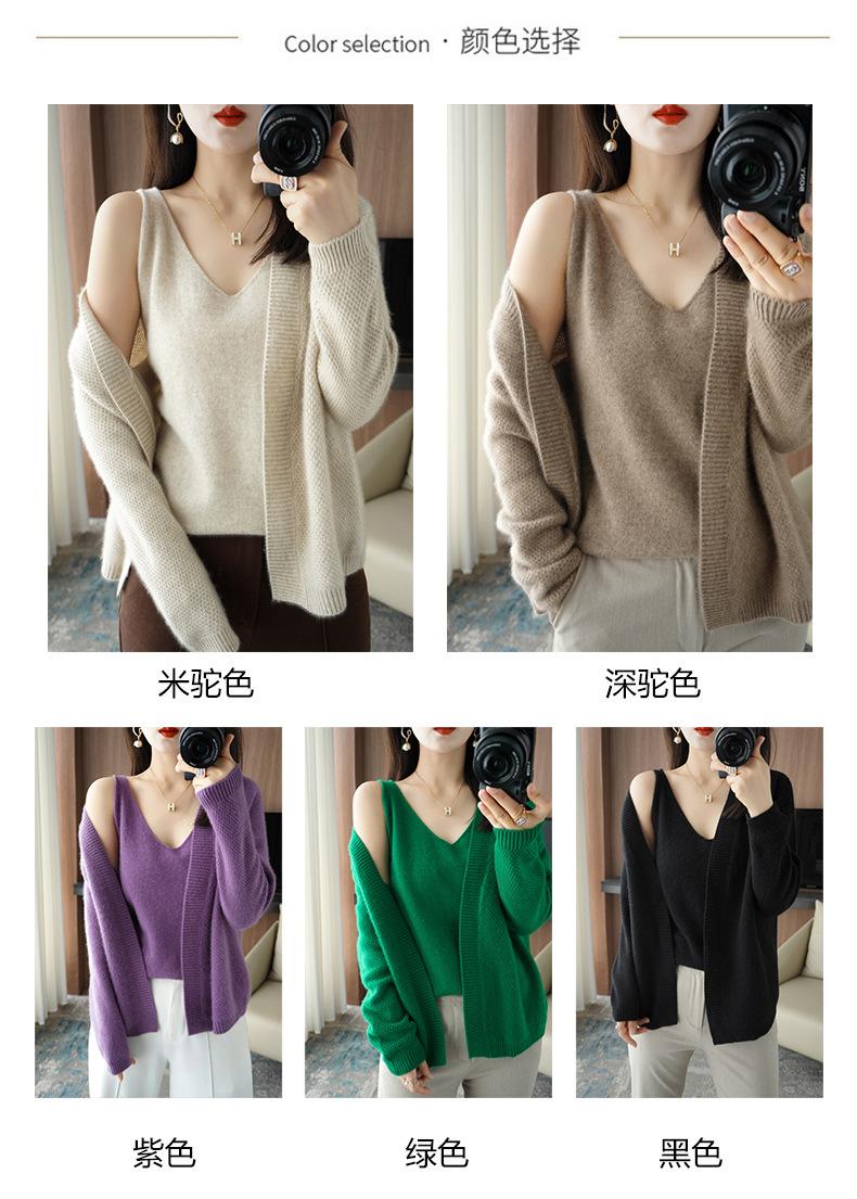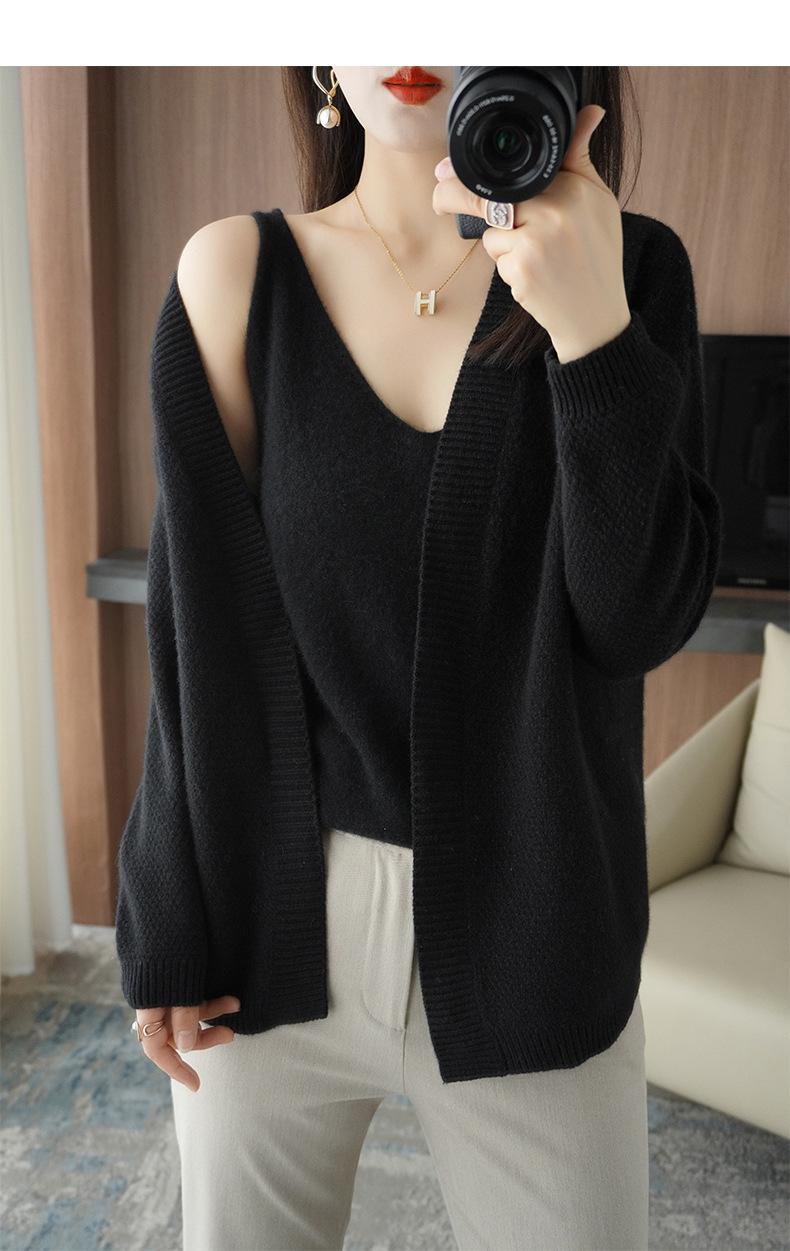 Cárdigan de dos piezas para otoño e invierno, nuevo, con cuello en V, para mujer, de color liso, con tirantes, chaqueta de punto holgada.