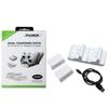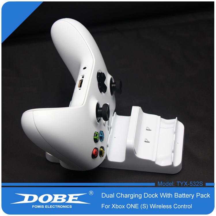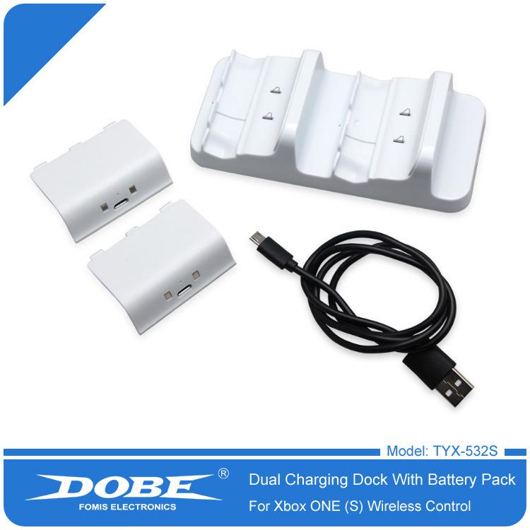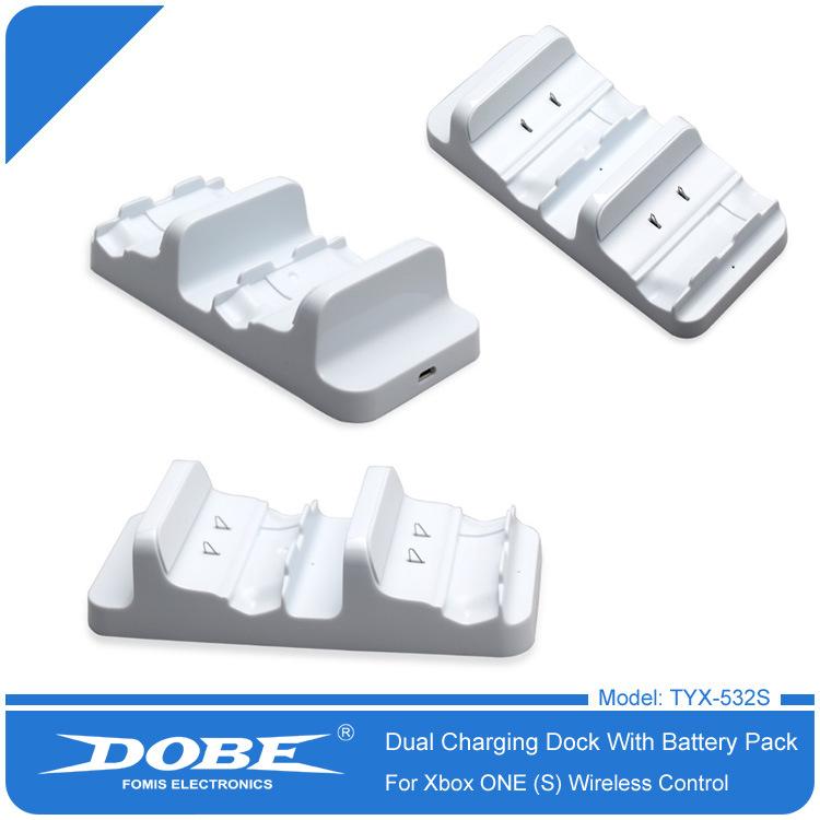 El cargador dual para control de XBOX ONE TYX-532S es un producto de carga diseñado según las necesidades de carga del control de XBOX ONE. Este producto está equipado con dos paquetes de baterías, que se pueden instalar en el control de XBOX ONE para alimentarlo. Este producto también está equipado con un cable de carga USB, que se puede conectar a la interfaz MICRO del paquete de baterías a través de un dispositivo con salida USB estándar de 5 V CC o una interfaz de adaptador de corriente para cargar el paquete de baterías; cuando la batería se ha instalado en el control de XBOX ONE, el control se puede cargar directamente a través de la base de carga dual de este producto.
