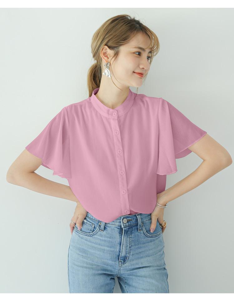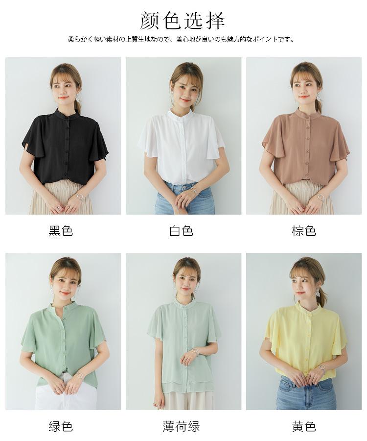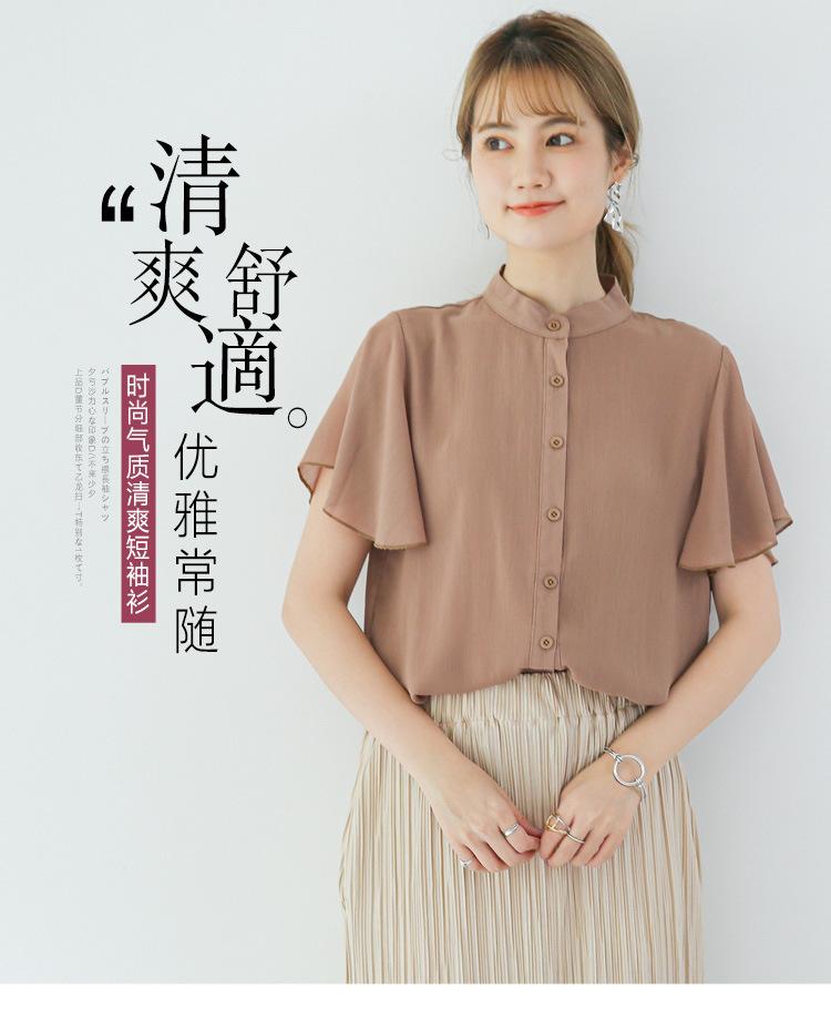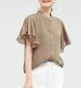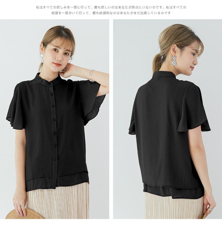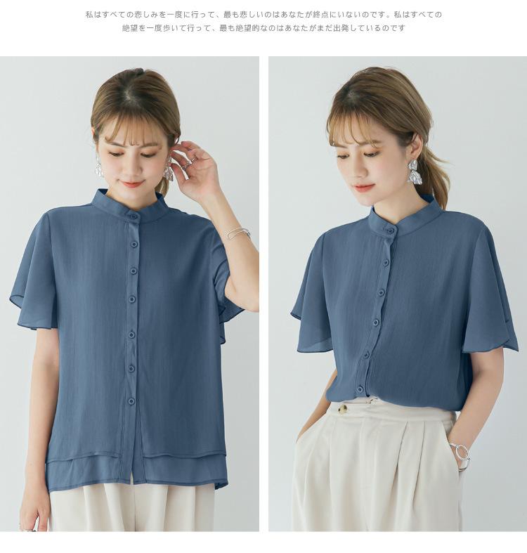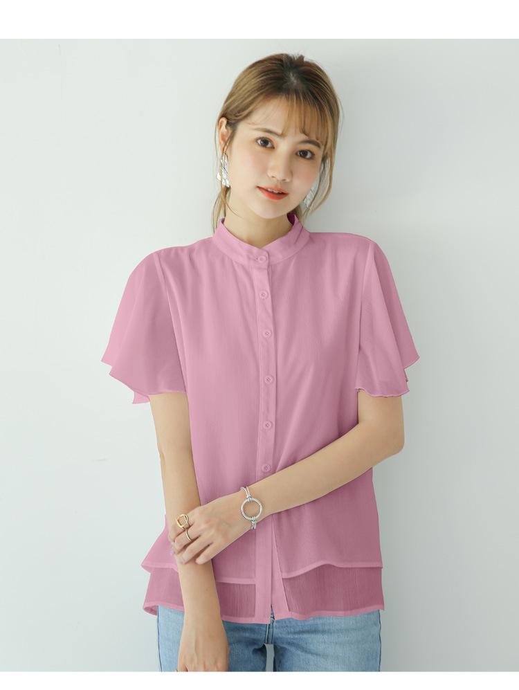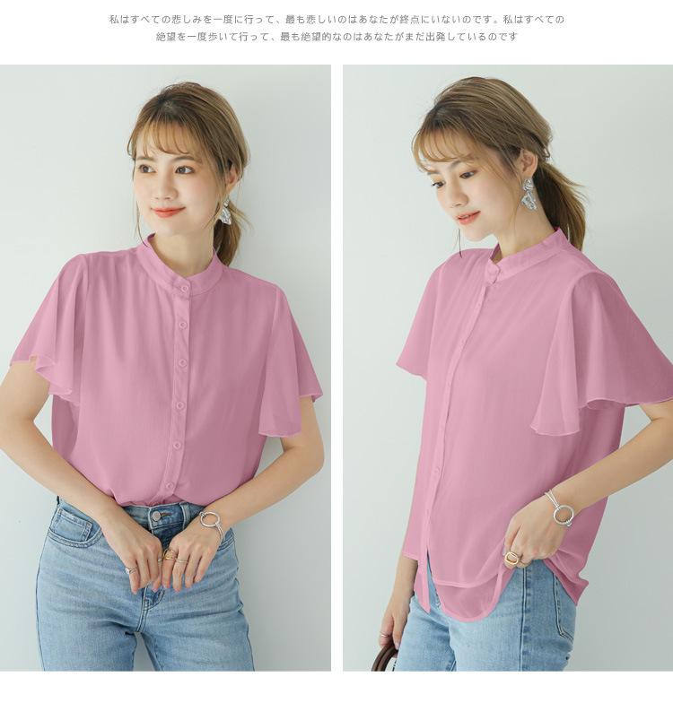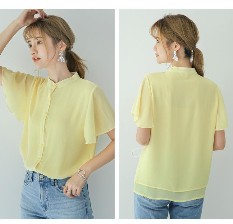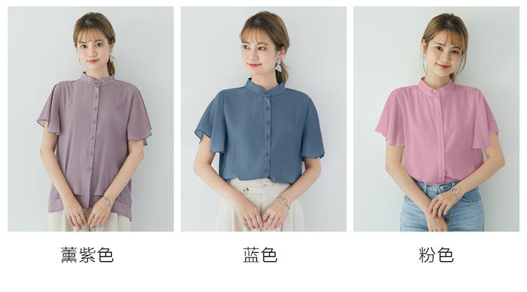 14 Colores en Stock 2025 Nuevo Estilo de Verano Suelto Cuello Alto Color Puro Camisa de Manga Corta con Volantes Top de Chifón para Mujer
