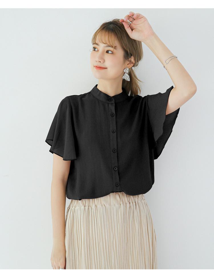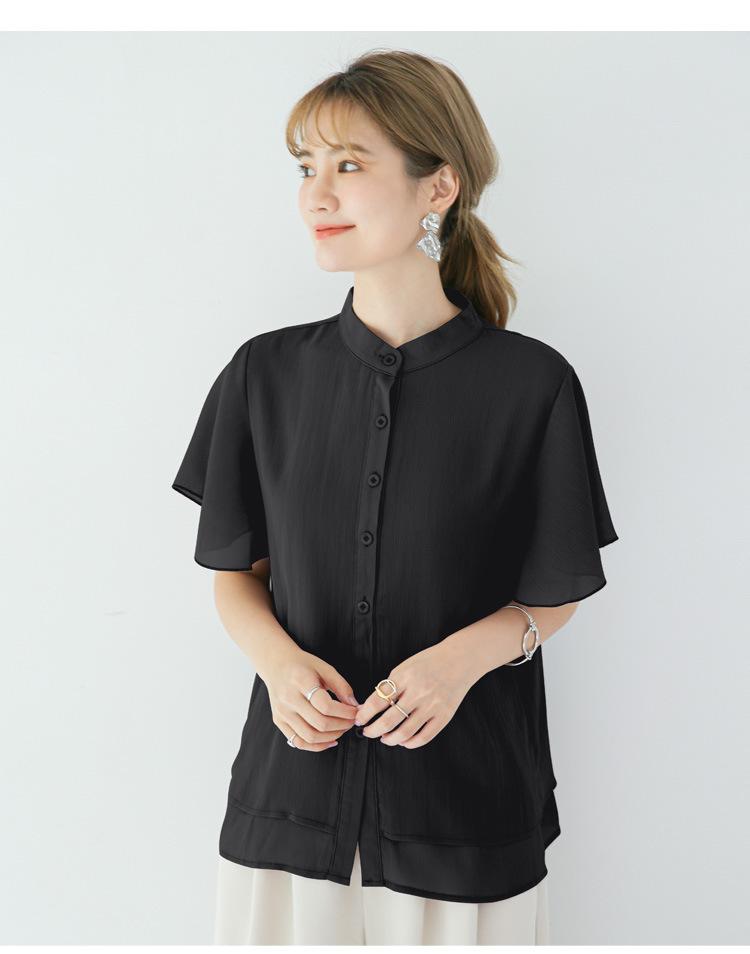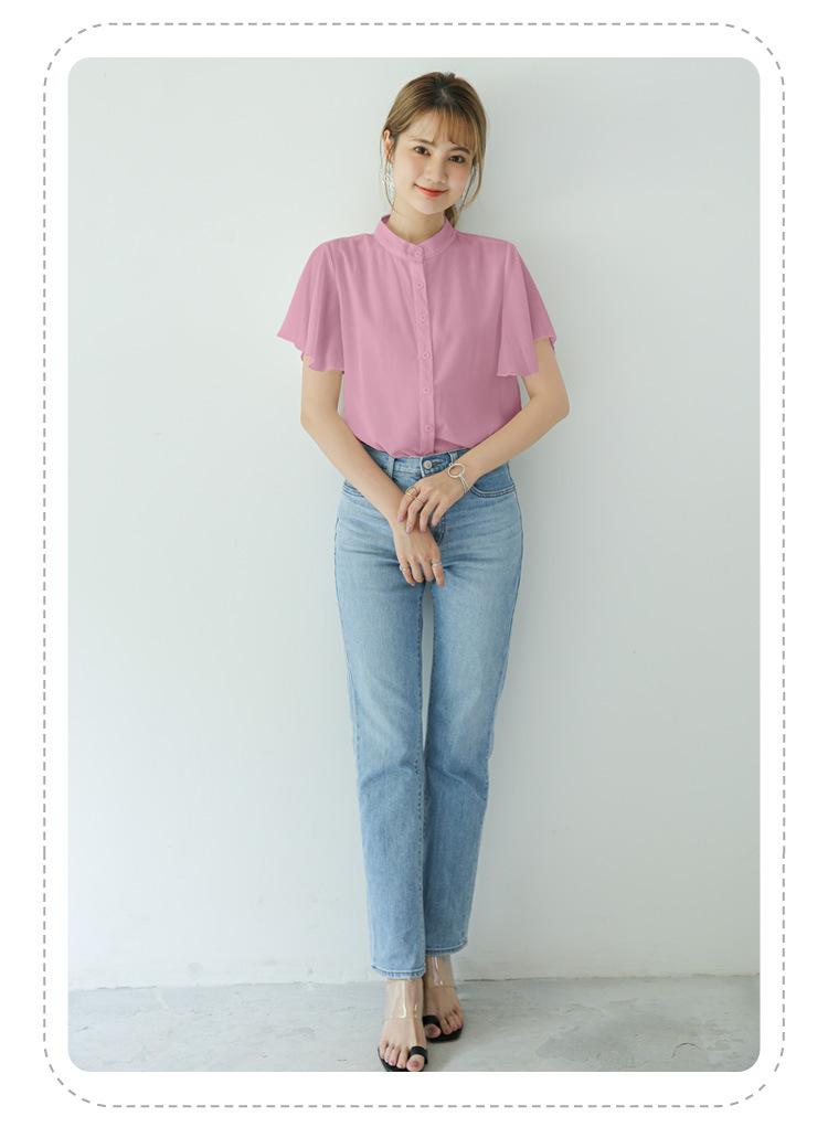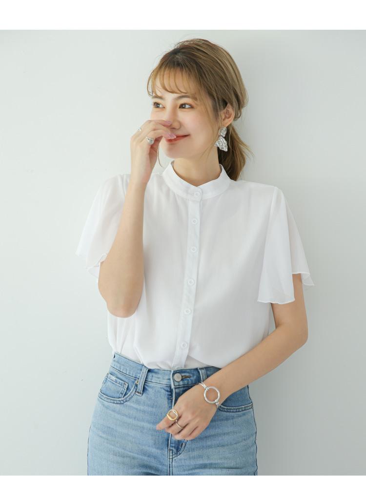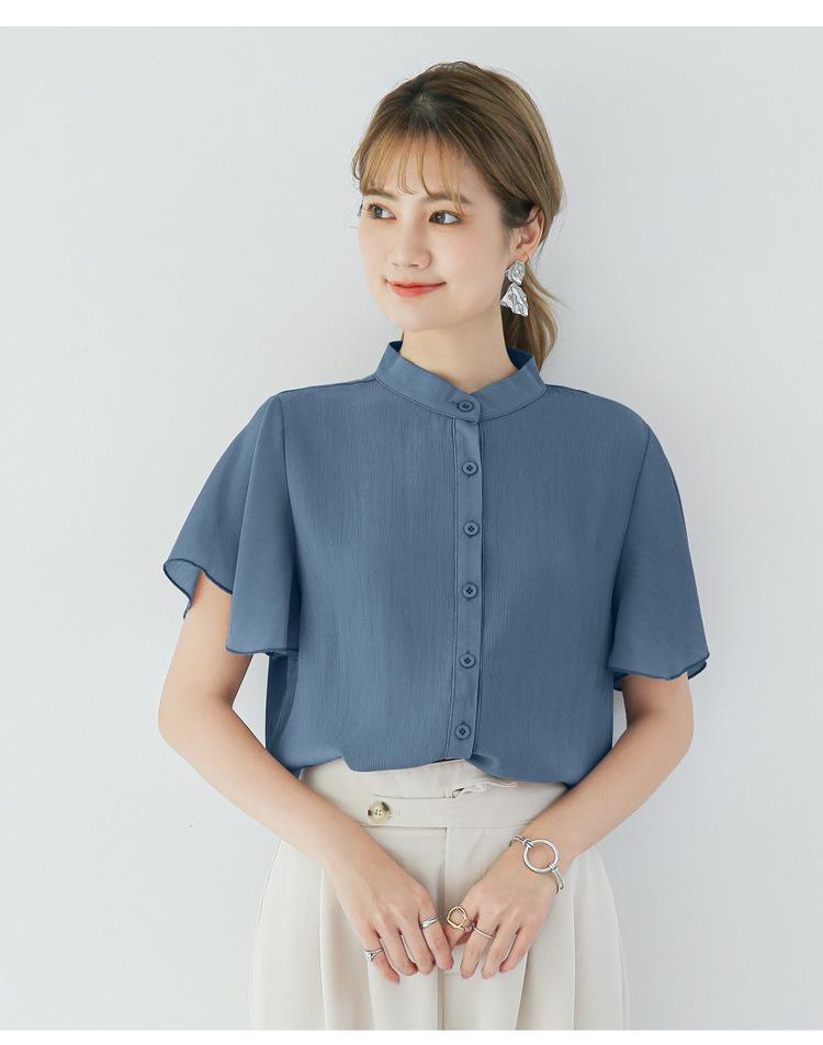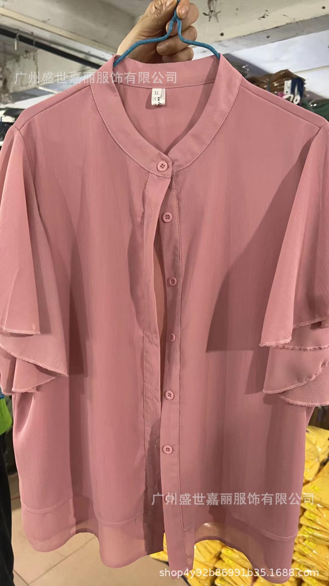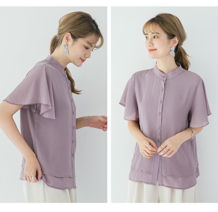 14 Colores en Stock 2025 Nuevo Estilo de Verano Suelto Cuello Alto Color Puro Camisa de Manga Corta con Volantes Top de Chifón para Mujer