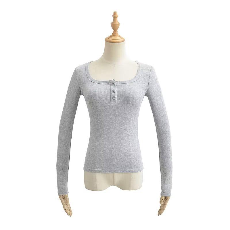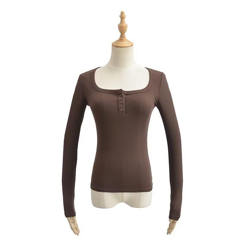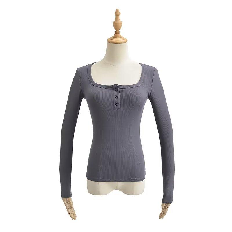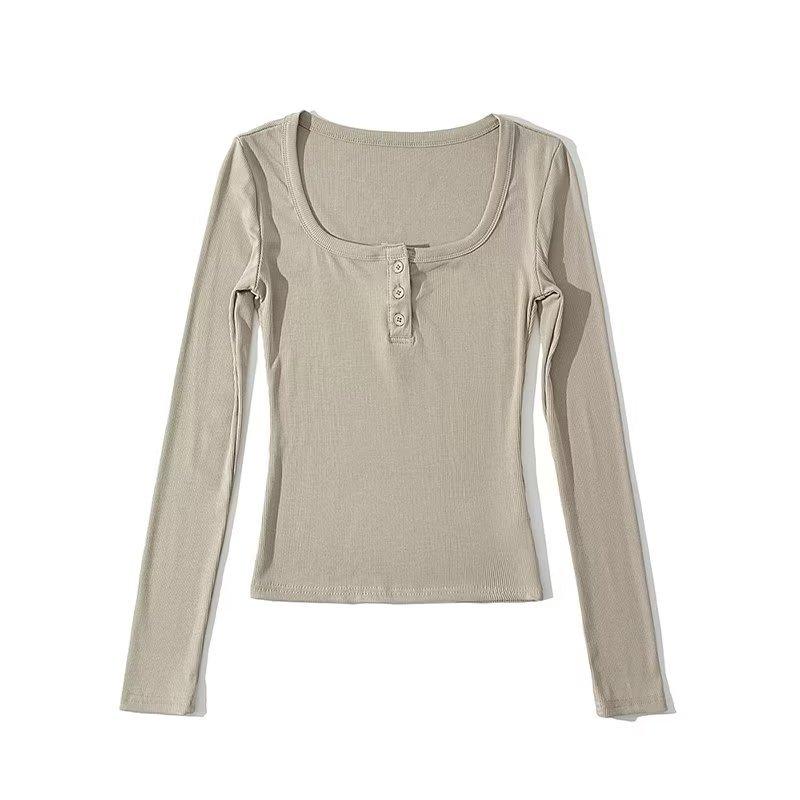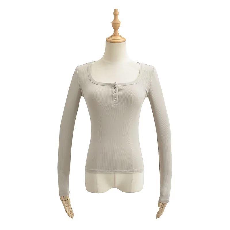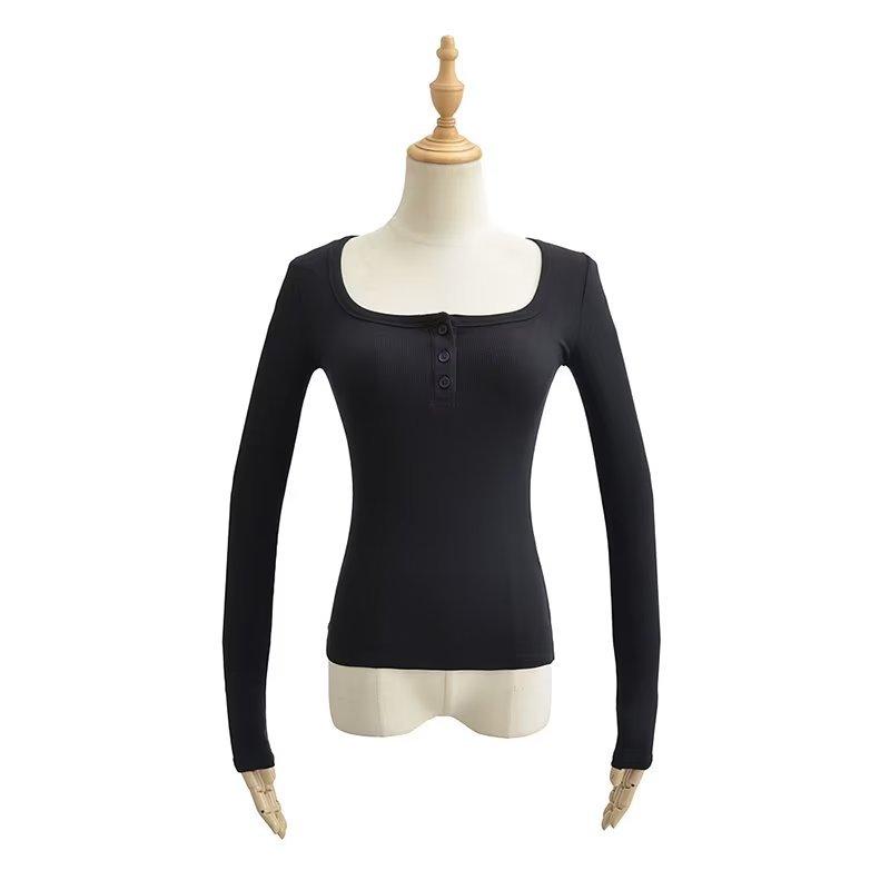 Camiseta ajustada de manga larga con botones y cuello cuadrado para mujer, estilo europeo y americano, otoño e invierno, C75372