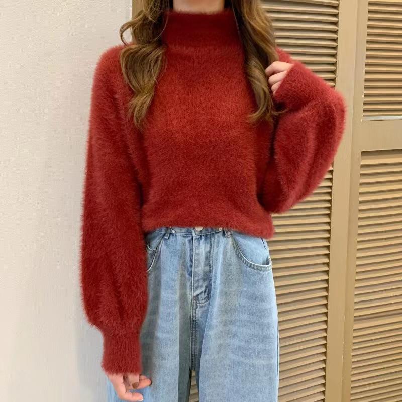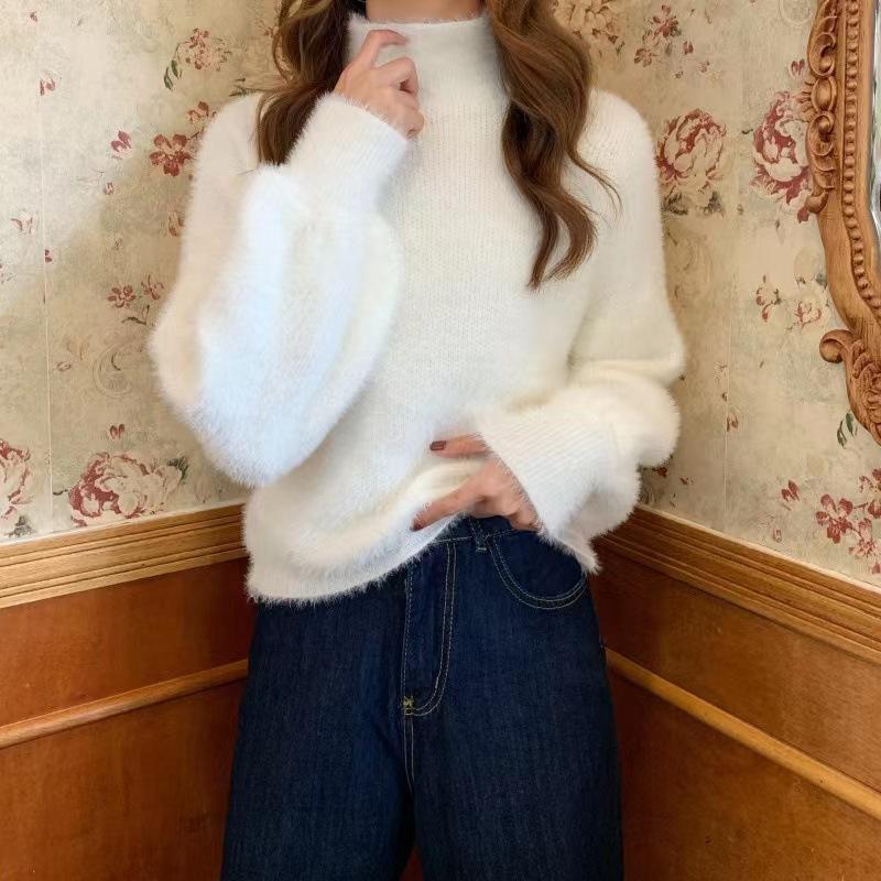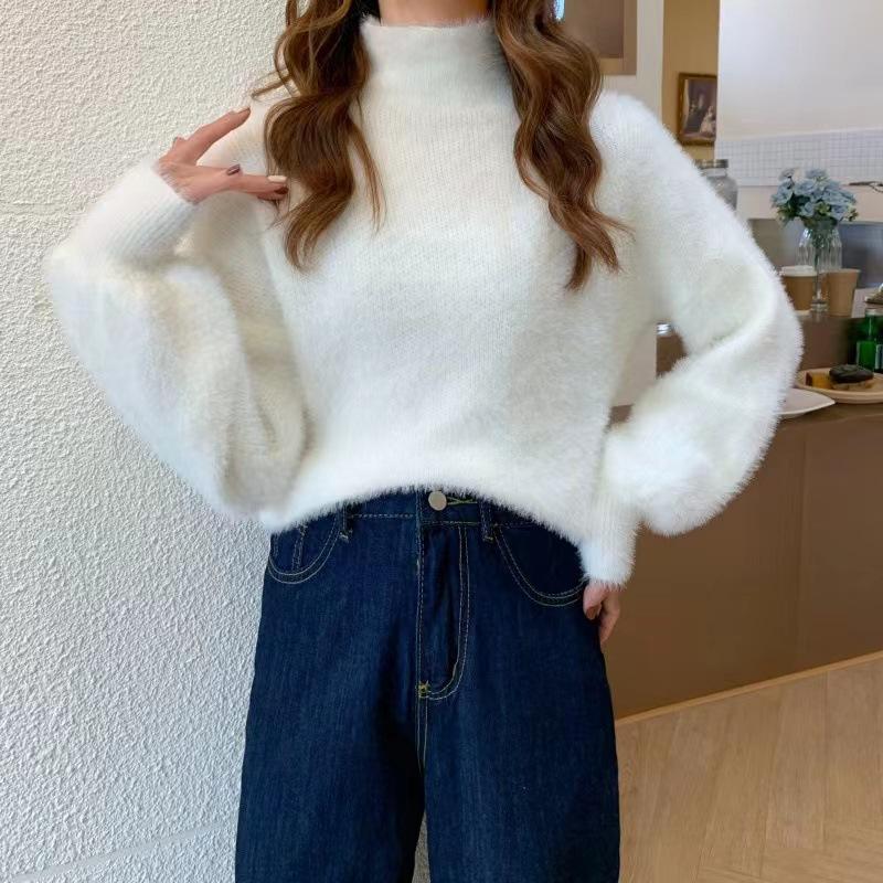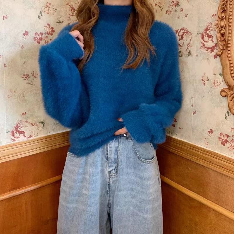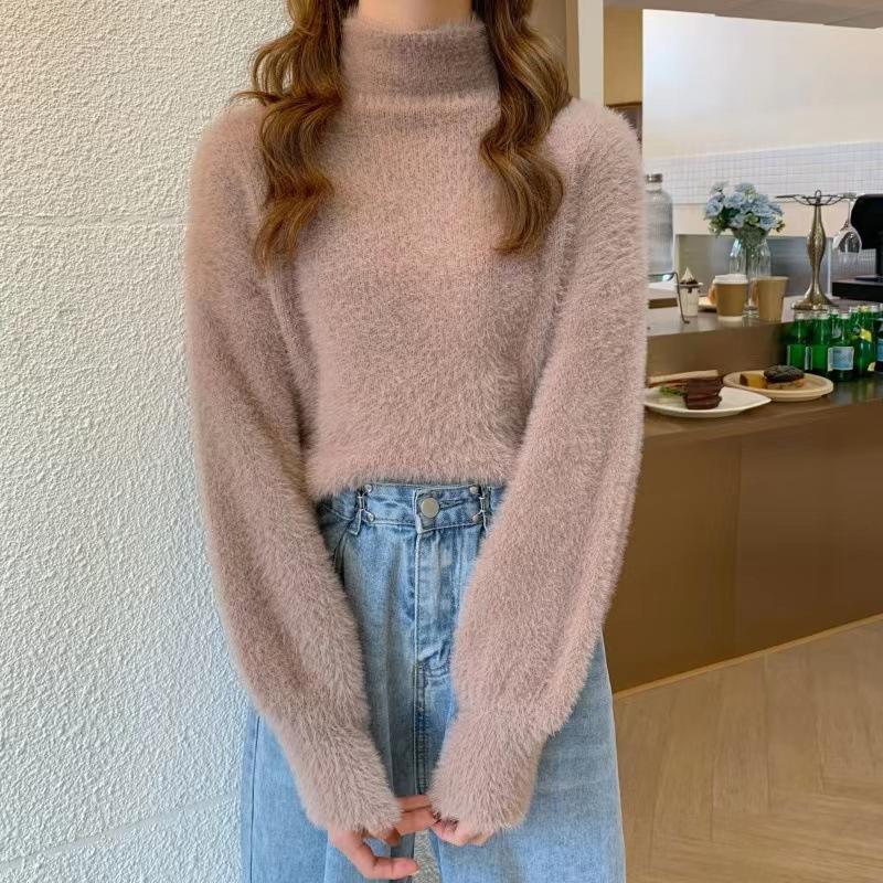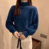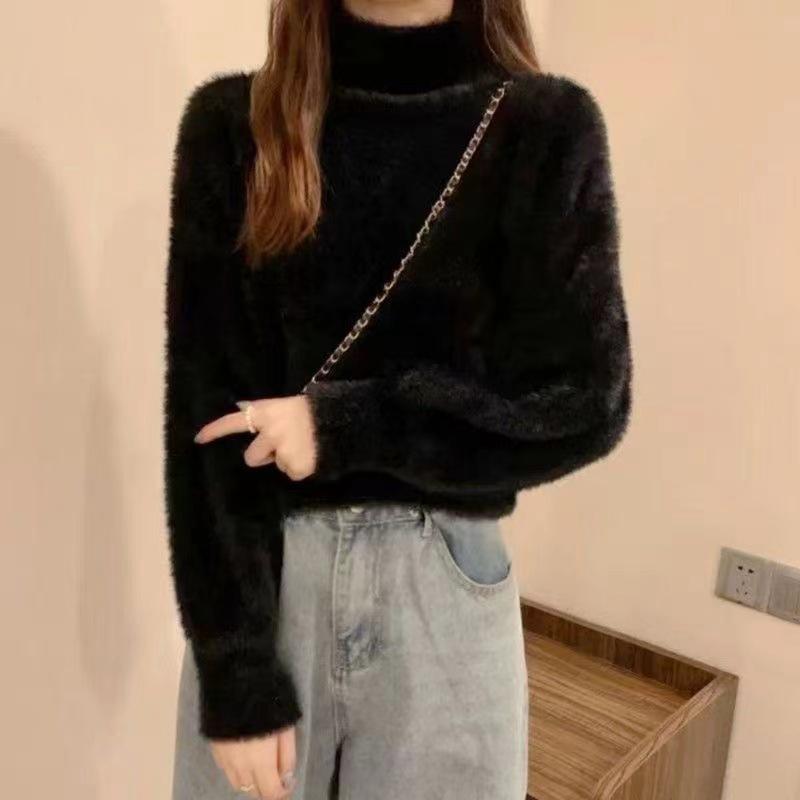 Estilo Coreano 2023 Otoño e Invierno Nuevo Suéter Holgado de Cuello Alto para Mujer Engrosado Sin Pelusa Immitación Visón Terciopelo Color Sólido Suéter Base
