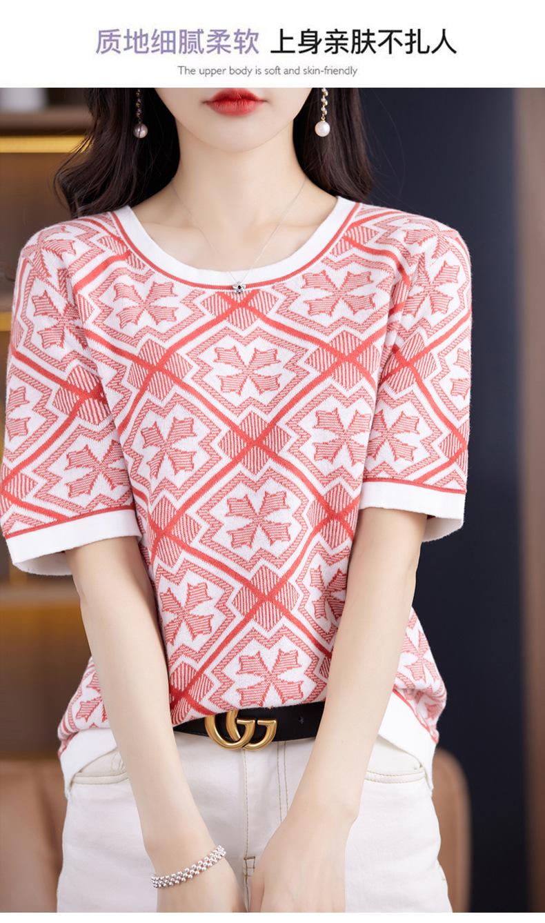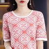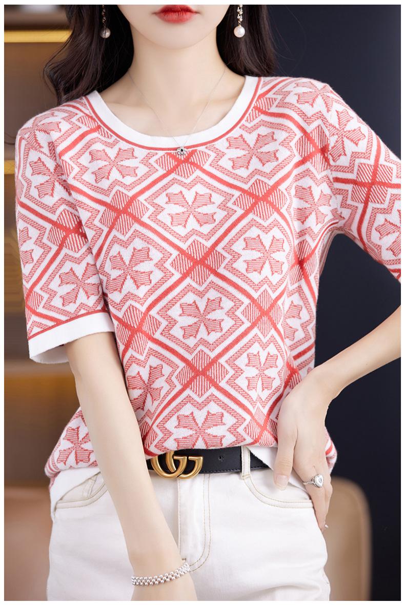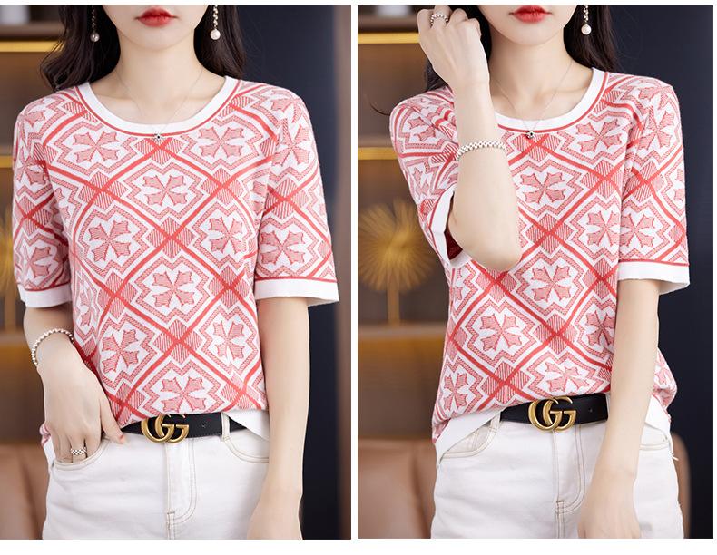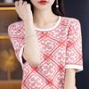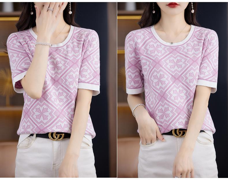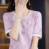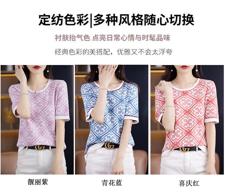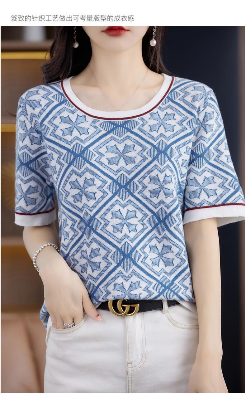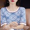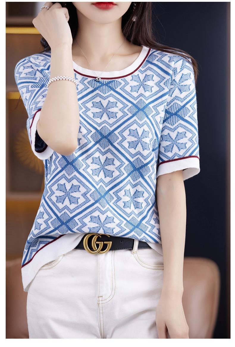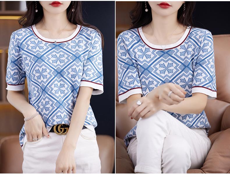 100% Algodón Peinado Moderno Azul y Blanco Porcelana Tops de Manga Corta para Mujer Verano Fresco Transpirable Suelto Talla Grande Combinación de Colores Camiseta para Mujer