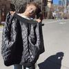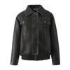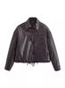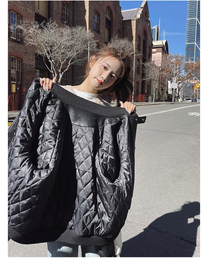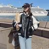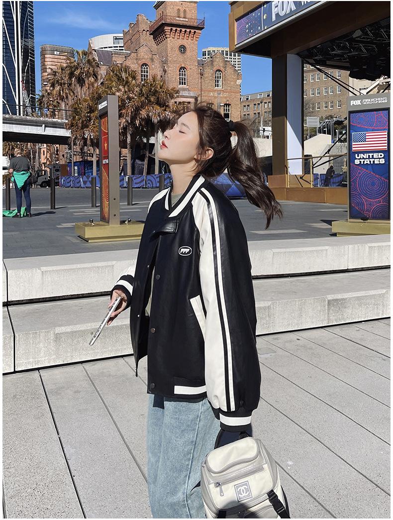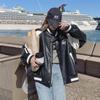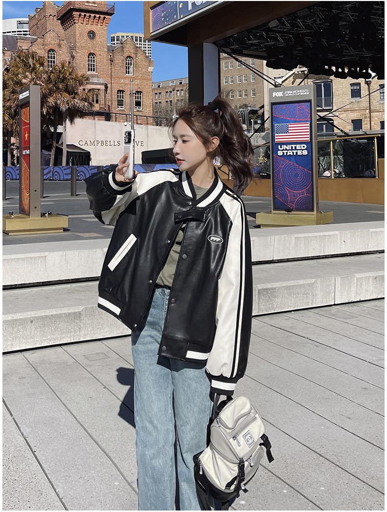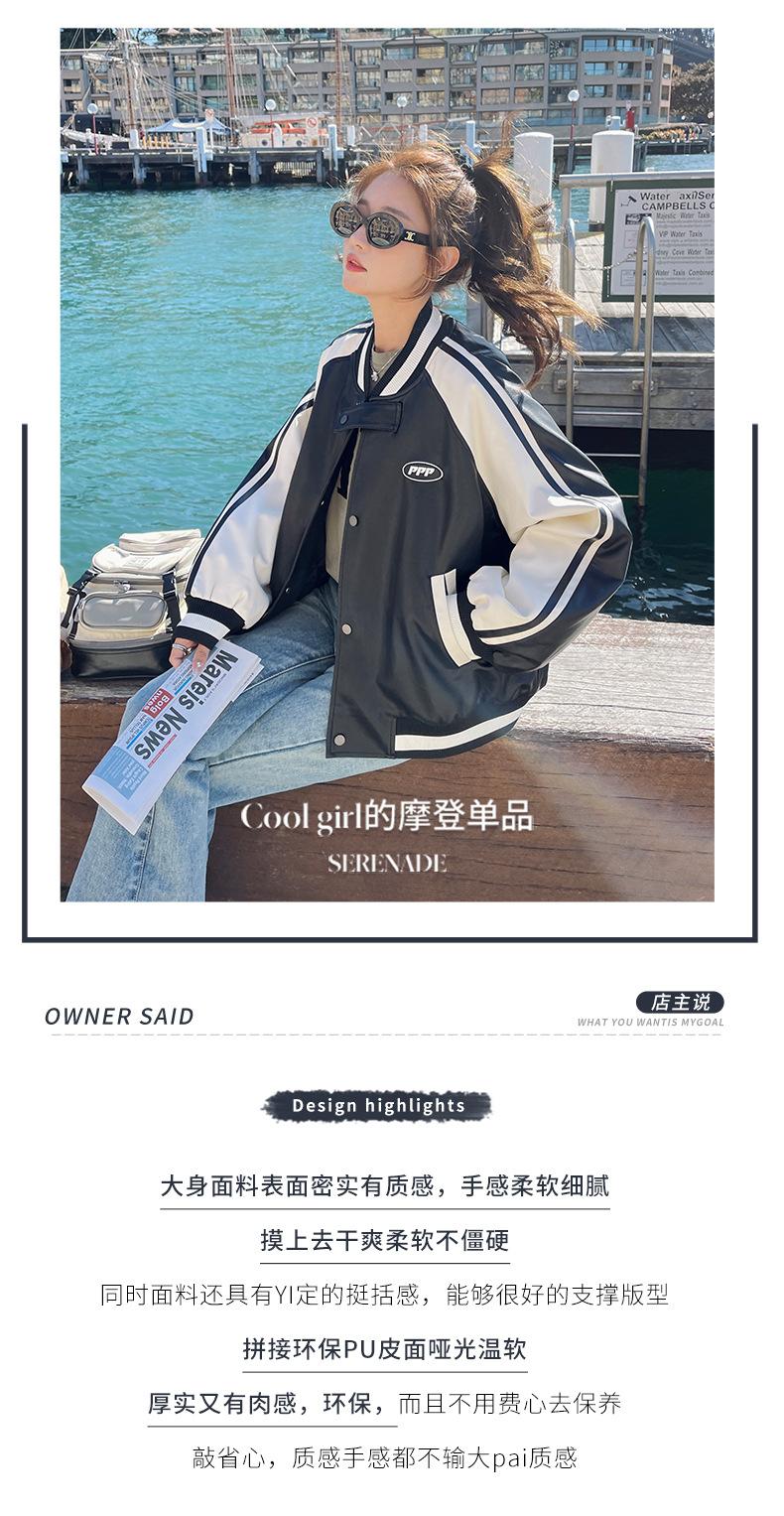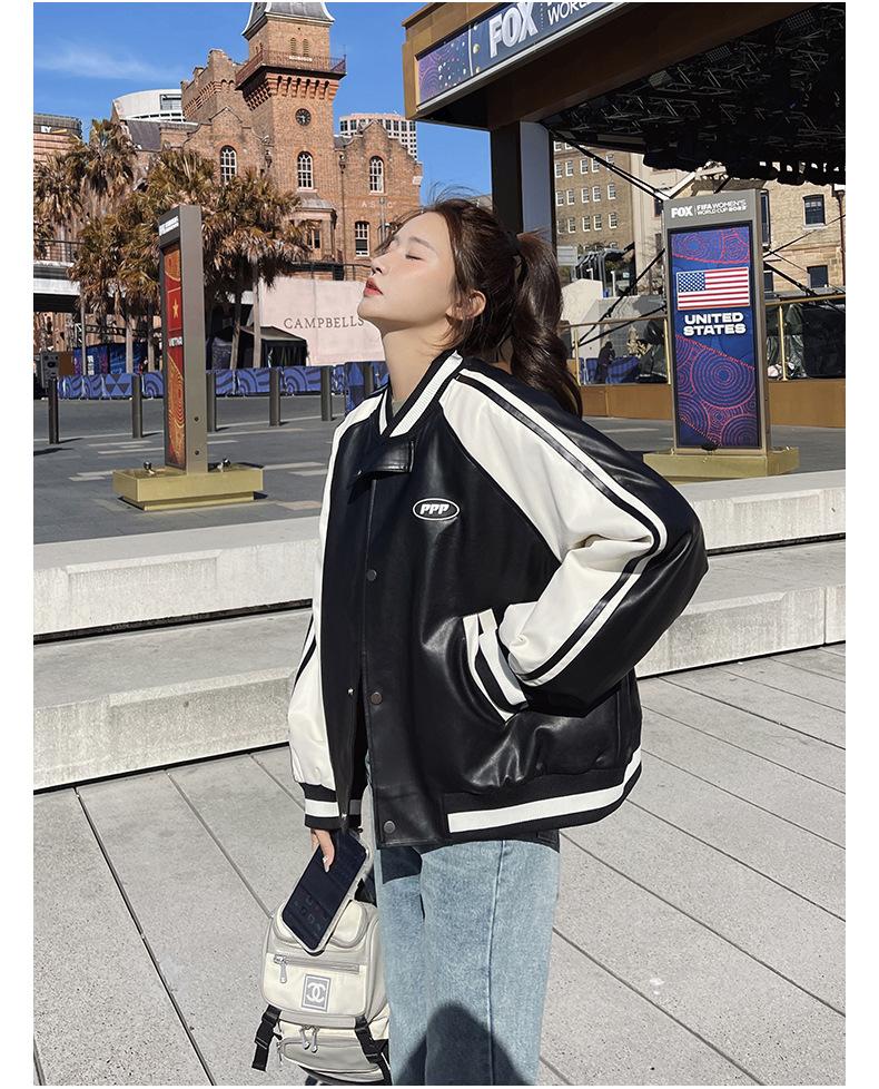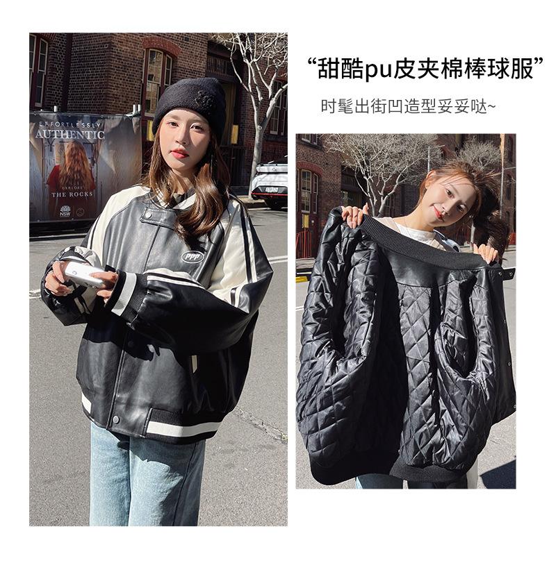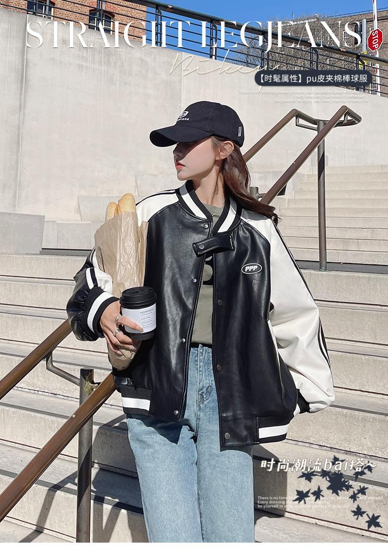 Abrigo de algodón con costuras en contraste de color de tiro real, abrigo de cuero para mujer 2024 otoño e invierno, nueva chaqueta de béisbol de algodón y cuero PU americano