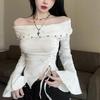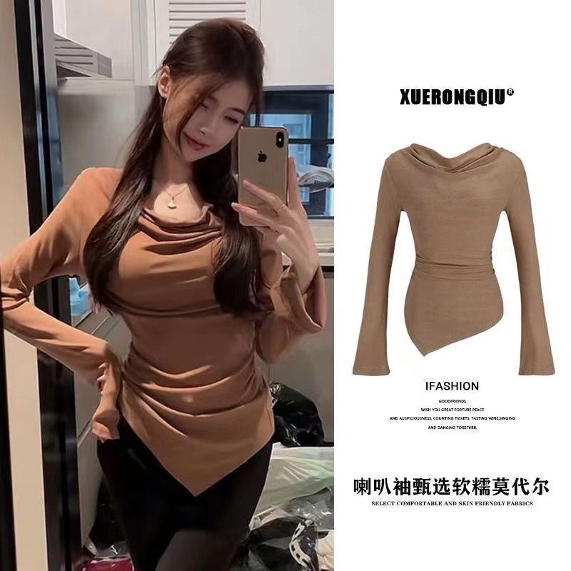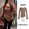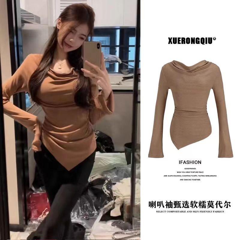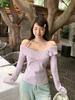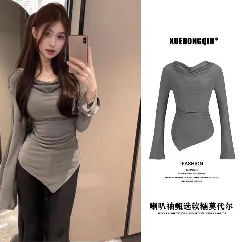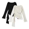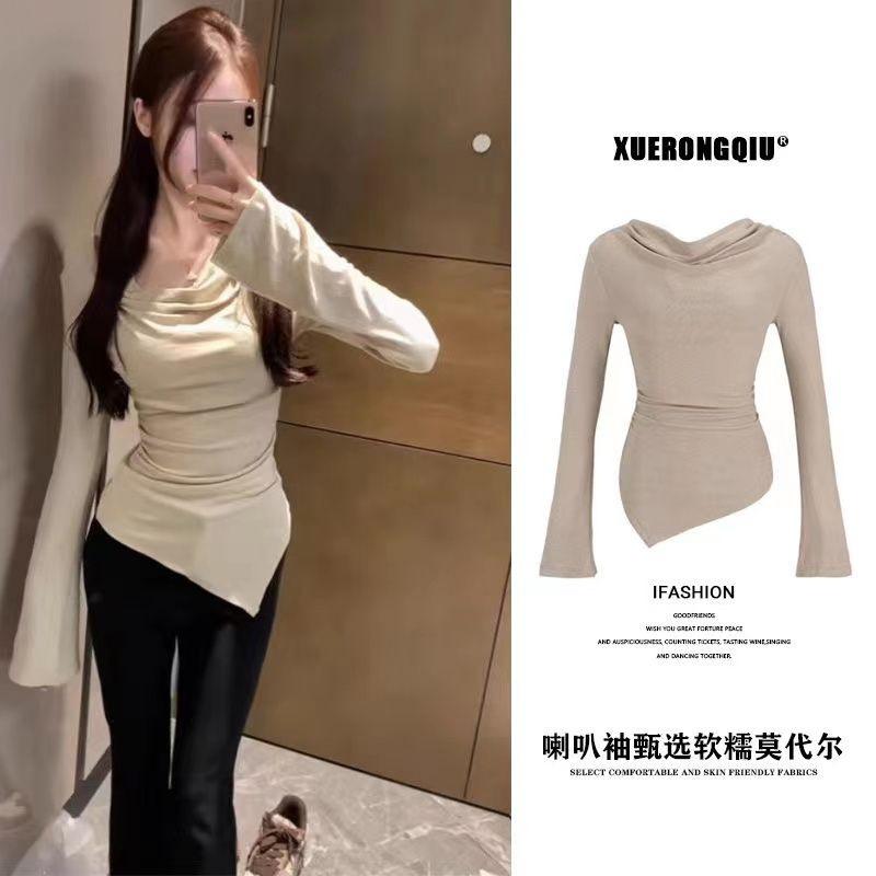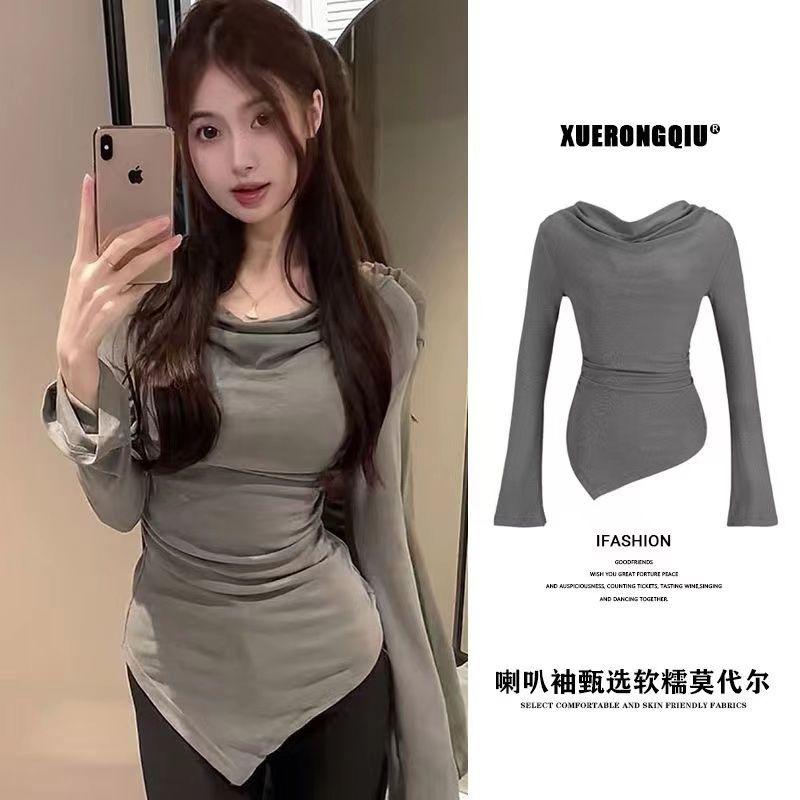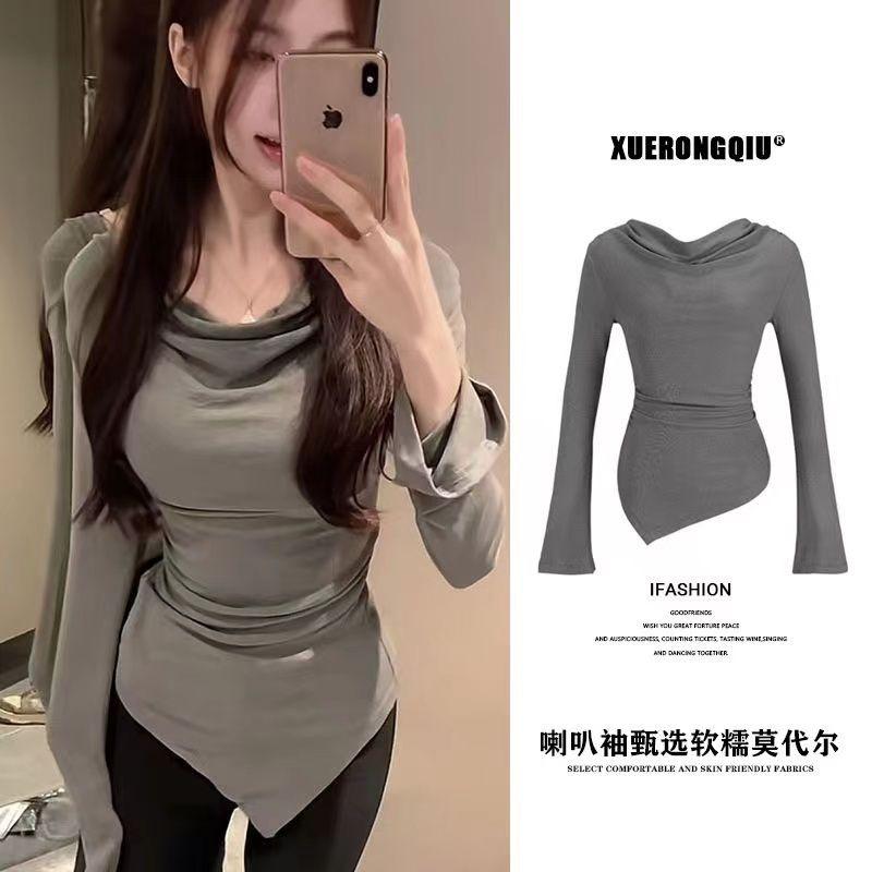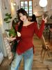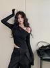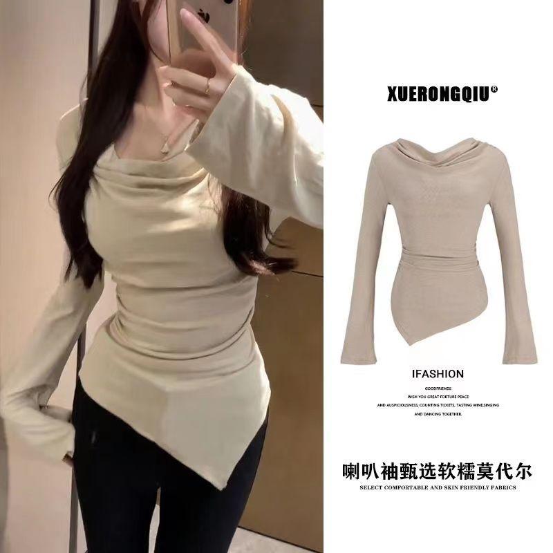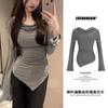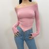 Top ajustado irregular con hombro descubierto de color sólido 2024 primavera nuevo manga larga deseo puro camiseta temperamento camiseta delgada