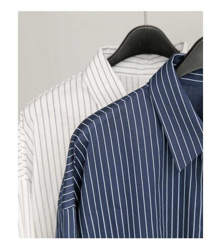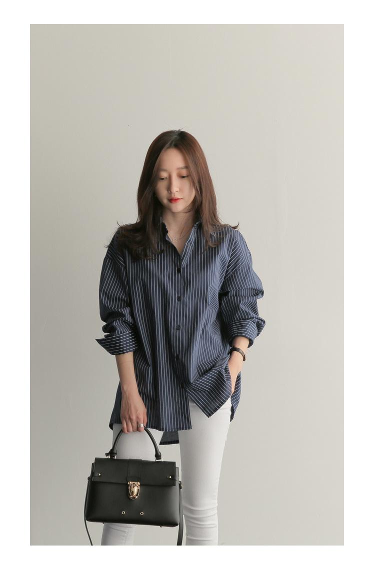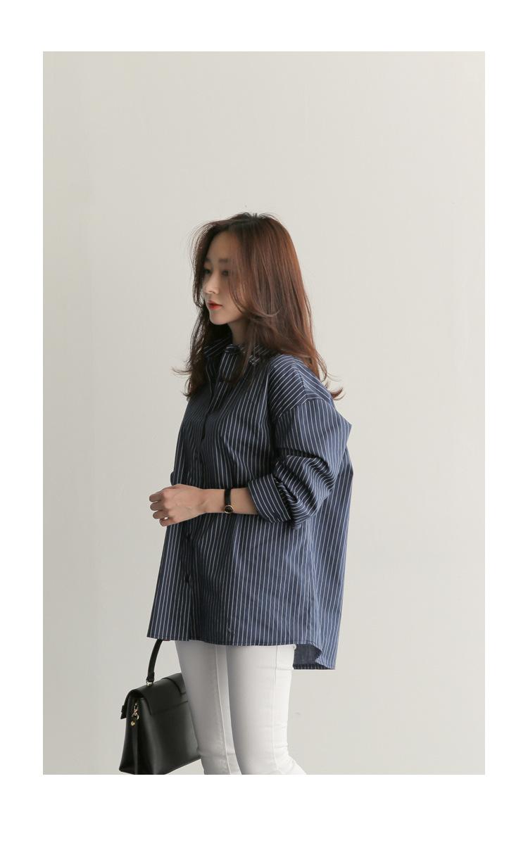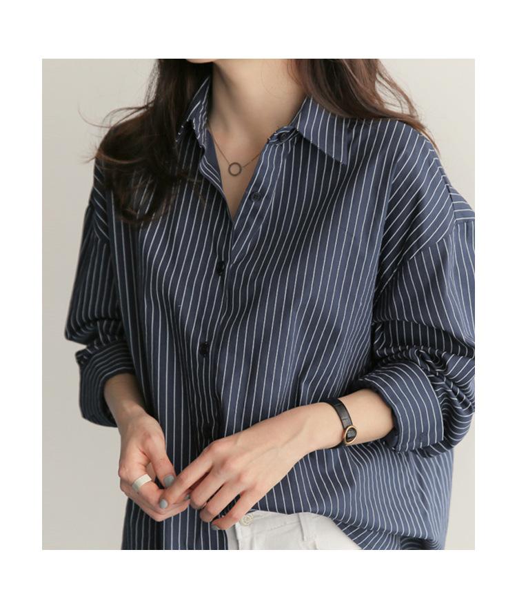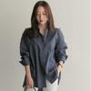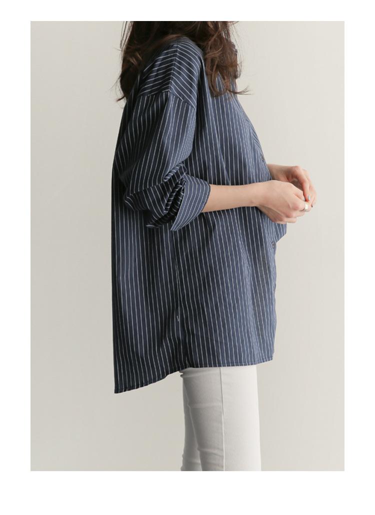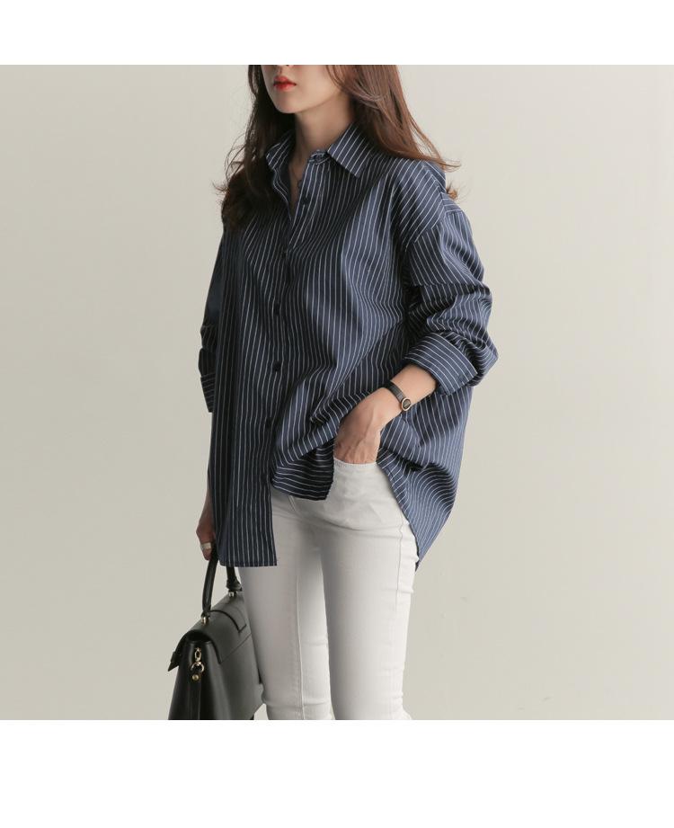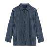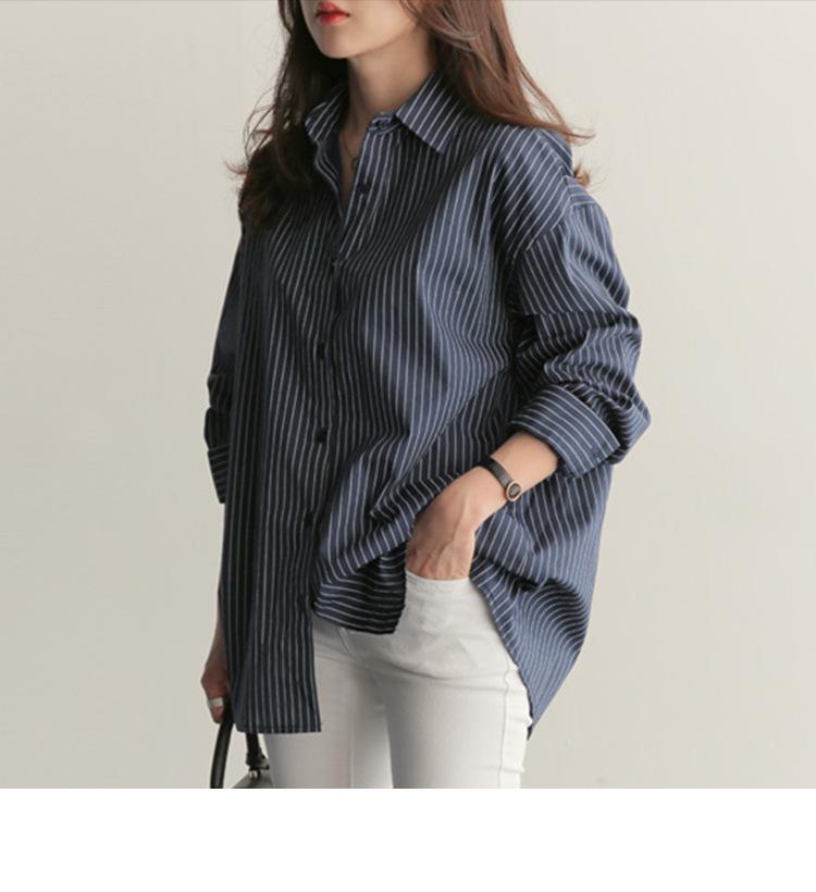 2025 Ropa Nueva de Otoño Camisa Versátil Holgada Azul de Rayas Verticales de Largo Medio Bf Talla Grande Manga Larga para Mujer