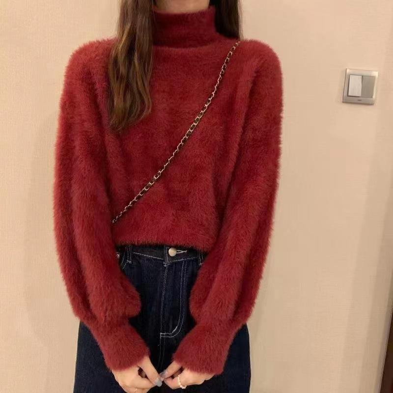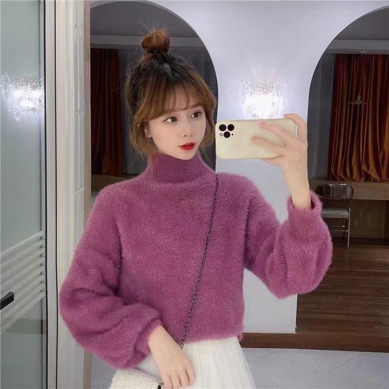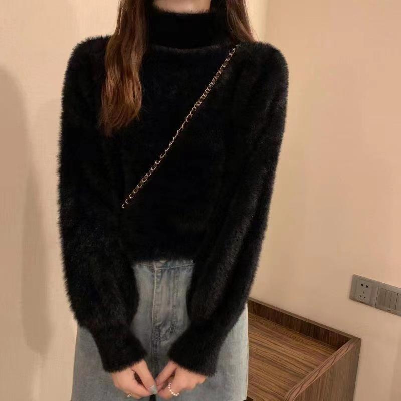 2025 Otoño e Invierno Tejido de Cuello Alto para Mujer Terciopelo Grueso Nuevo Estilo Coreano Holgado Color Puro Tejido Corto Imitación Visón Tendencia