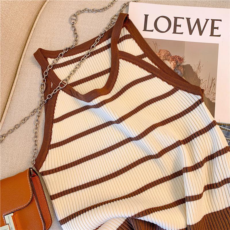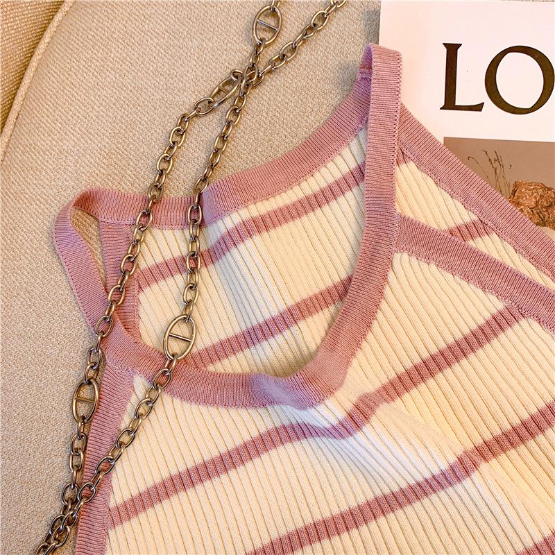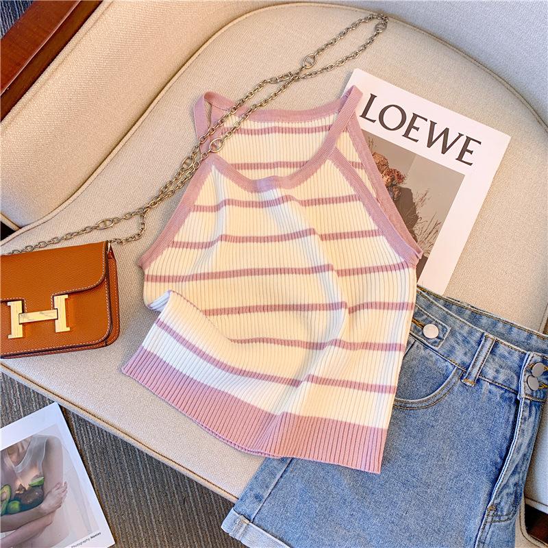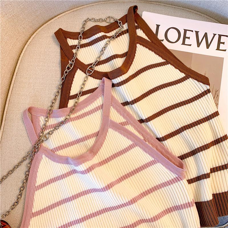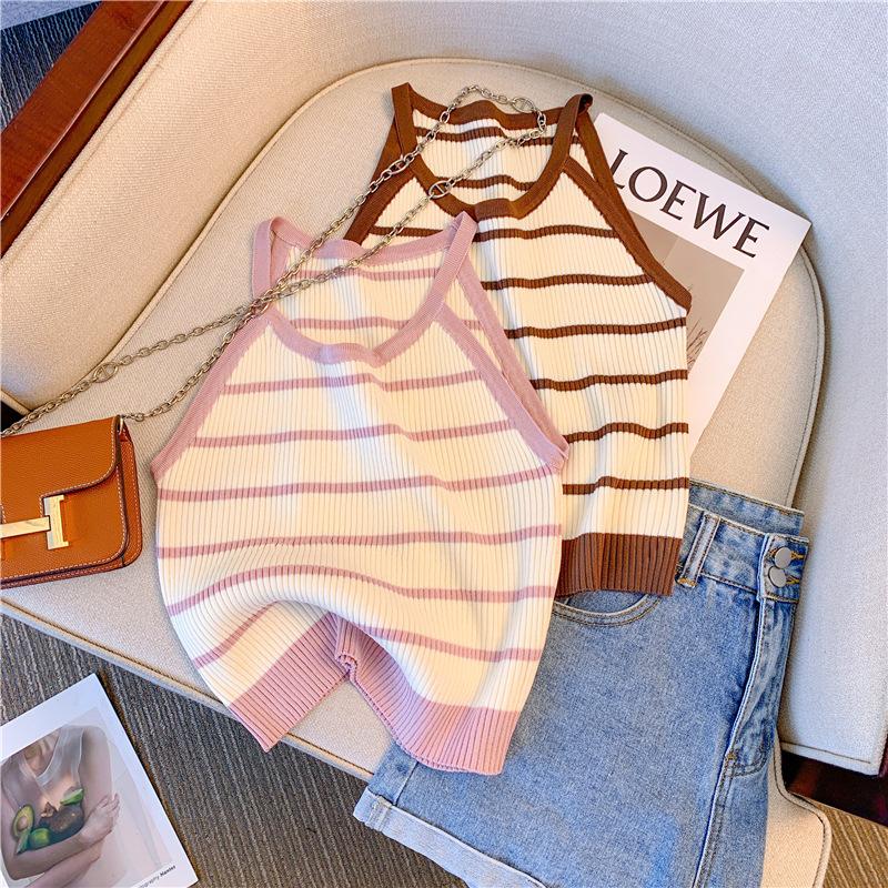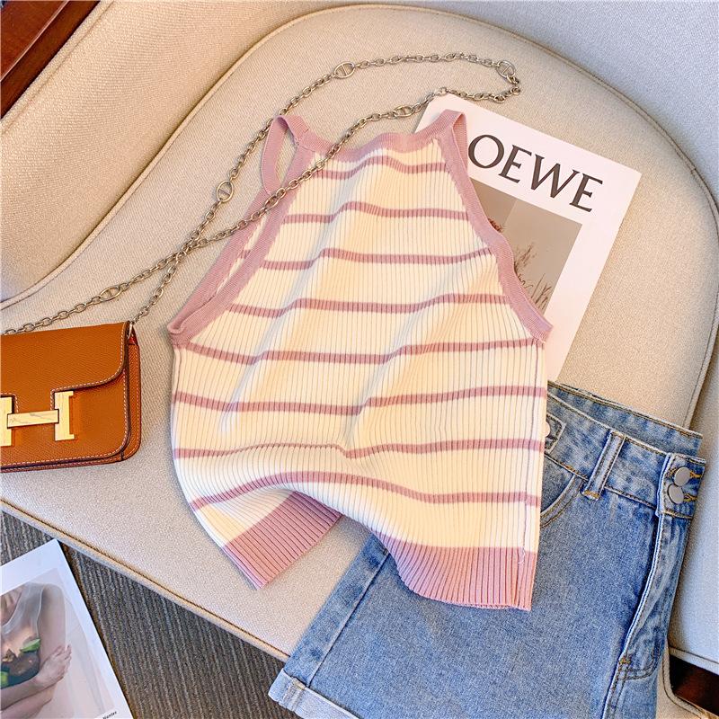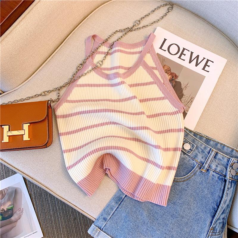 Chica Sexy Colgante Cuello Rayado Pequeño Sling Chaleco de Punto de Verano para Mujer Estilo Dulce Top Corto sin Mangas Francés para Mujer