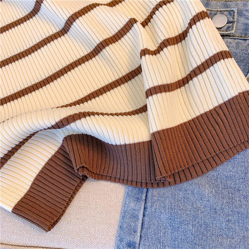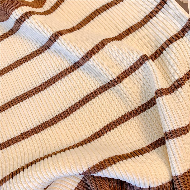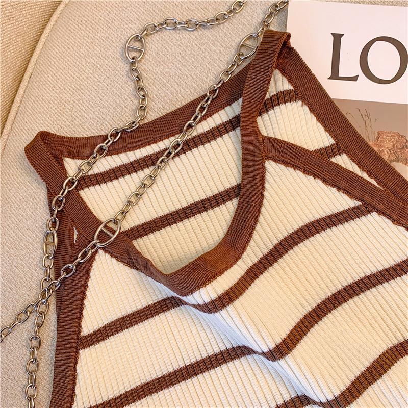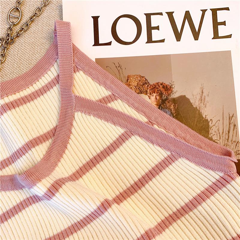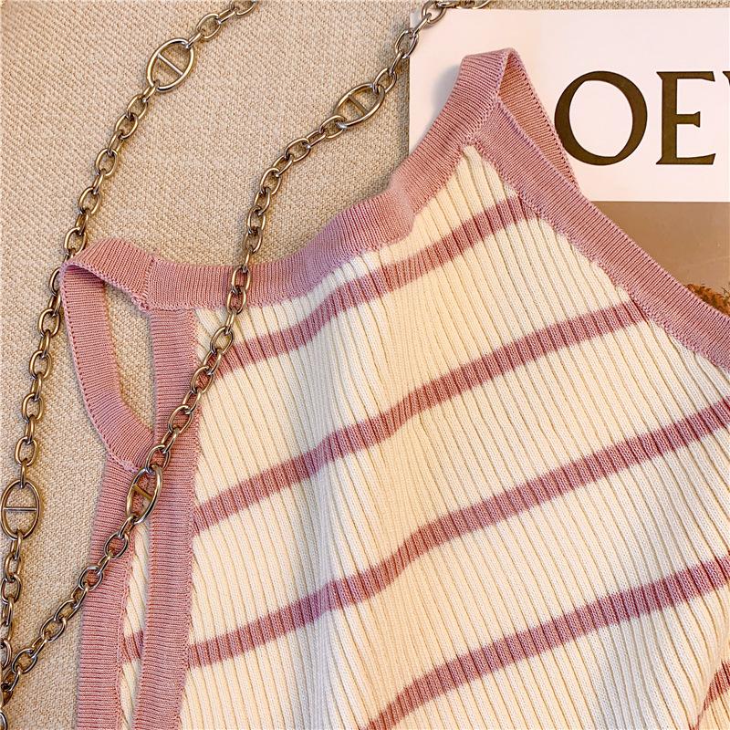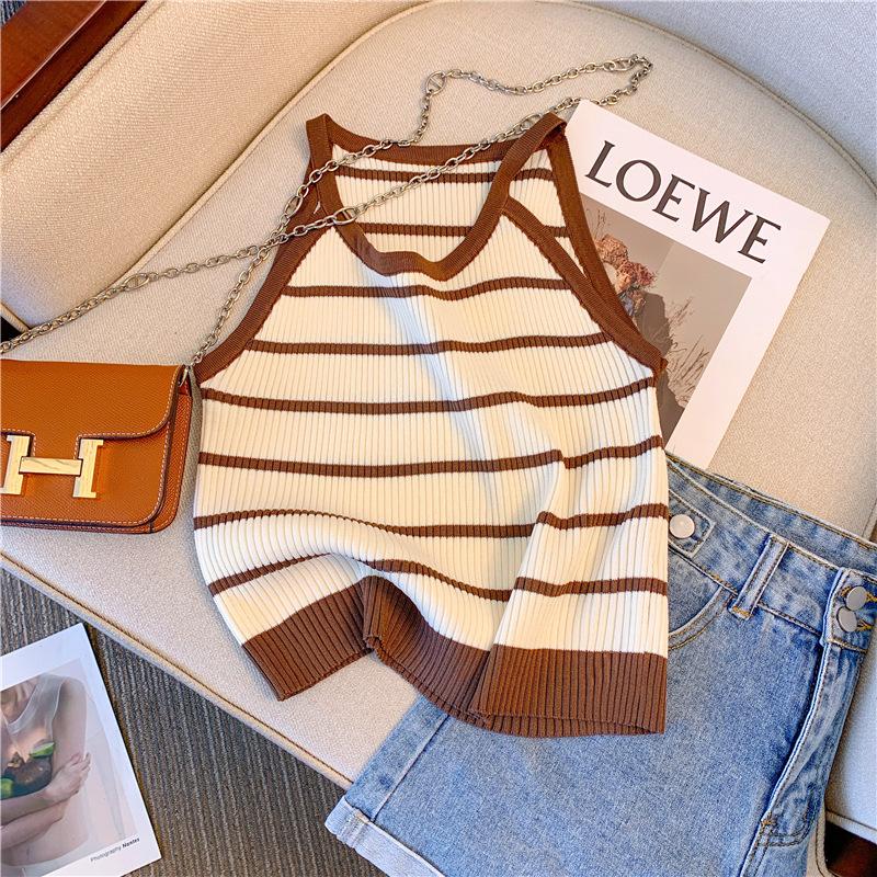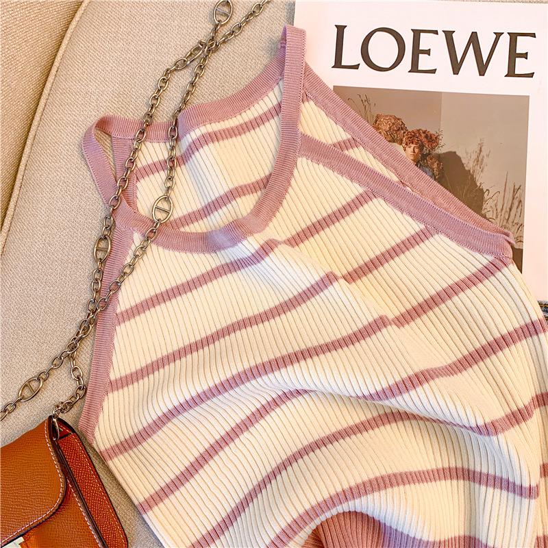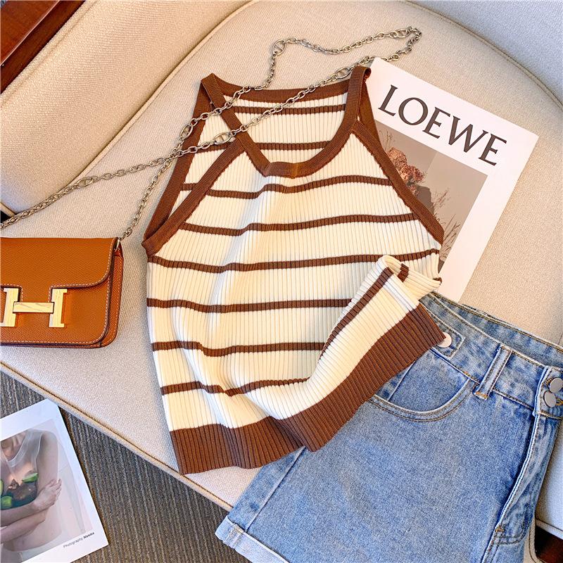 Chica Sexy Colgante Cuello Rayado Pequeño Sling Chaleco de Punto de Verano para Mujer Estilo Dulce Top Corto sin Mangas Francés para Mujer