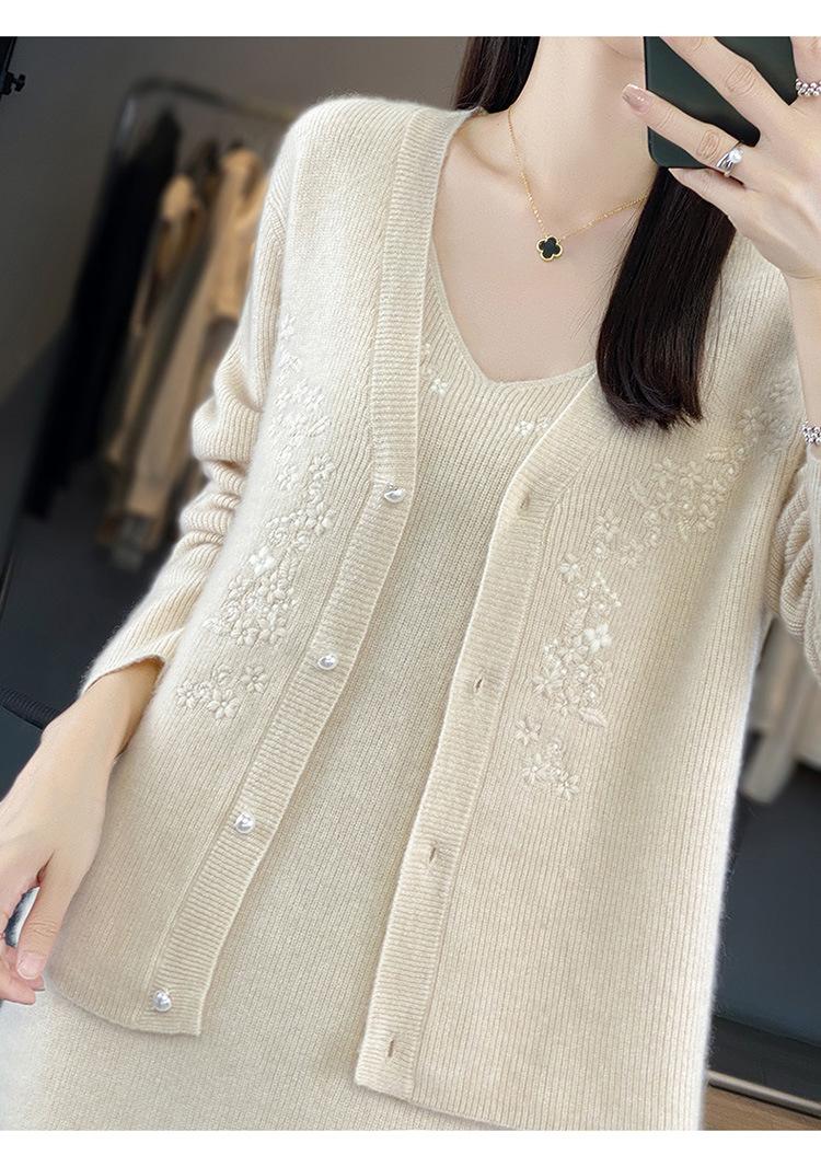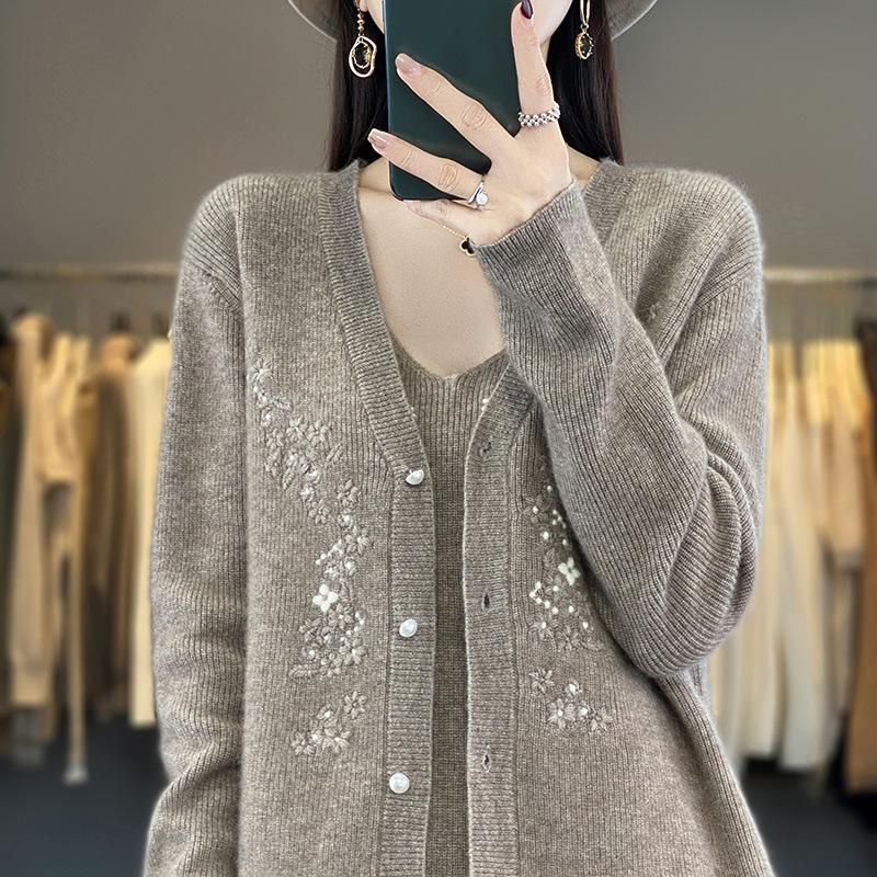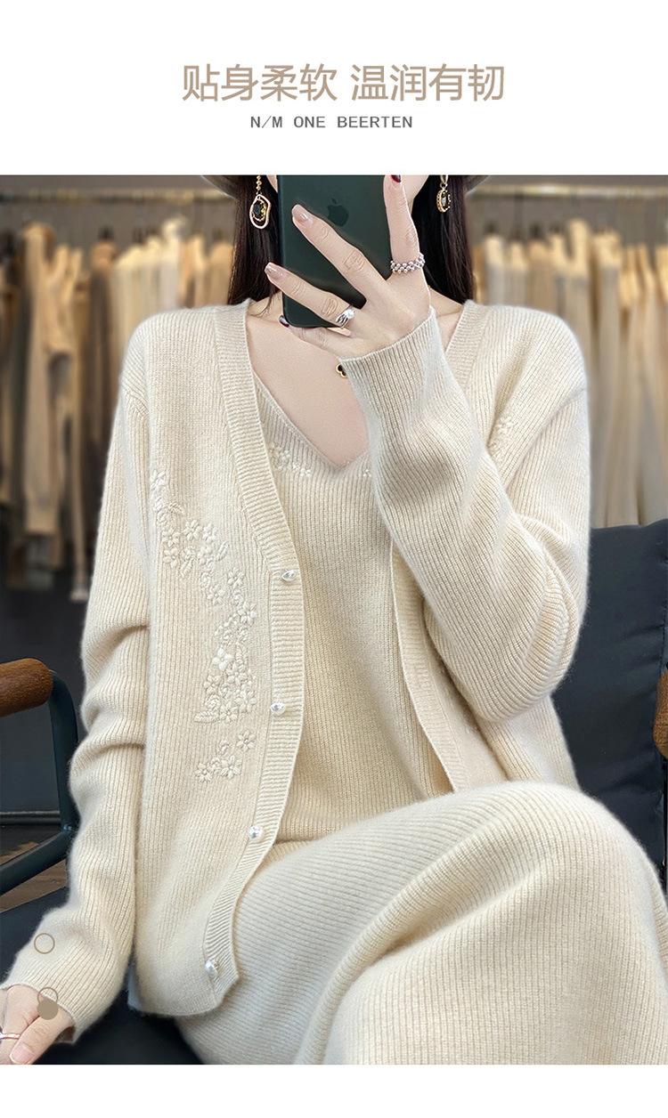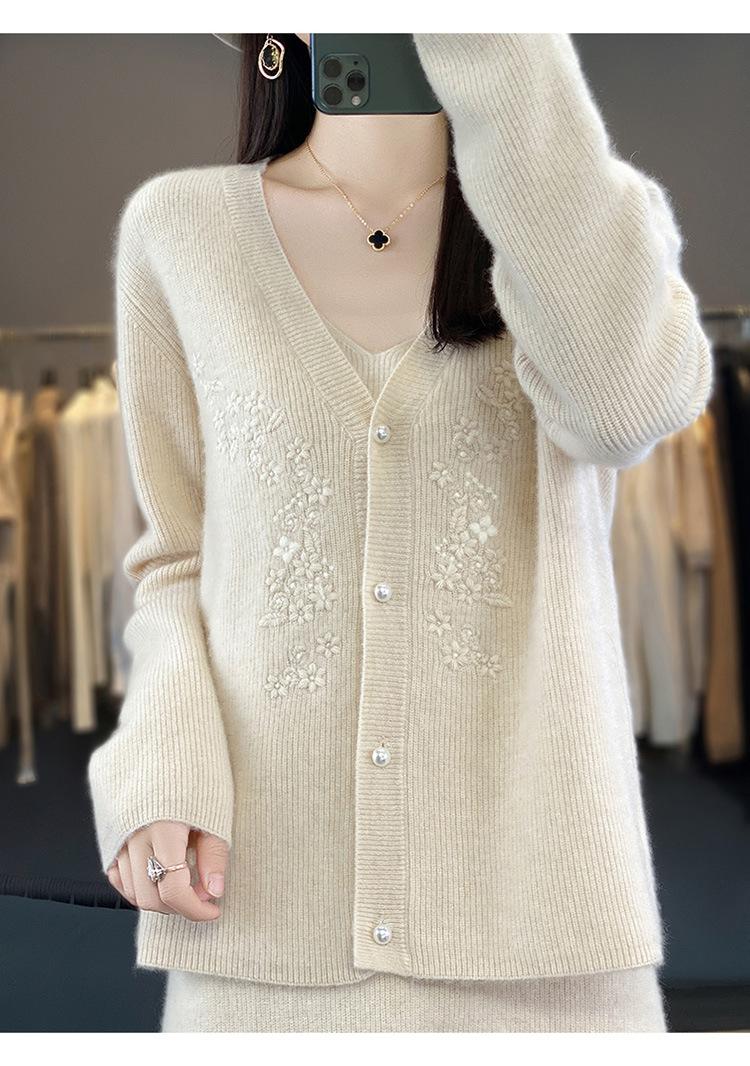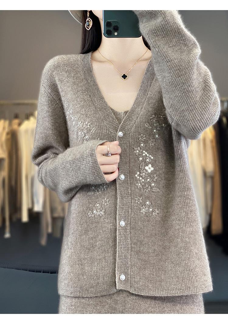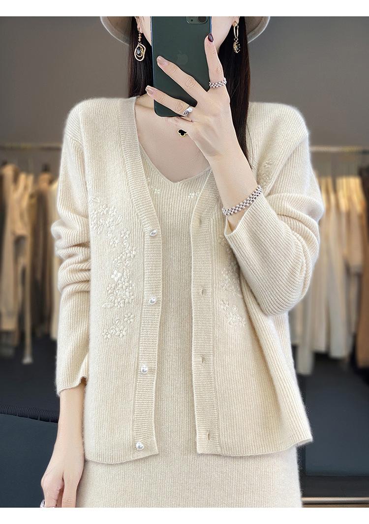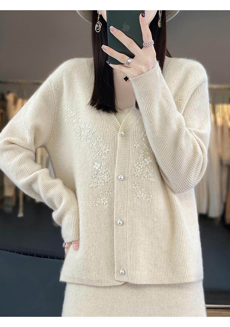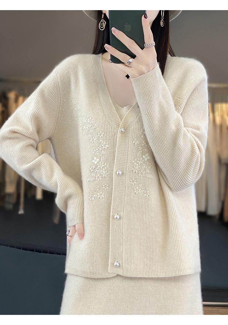 100% Lana Pura Otoño e Invierno Nuevo Cárdigan Corto de Punto con Cuello en V para Mujer Suelto Bordado Traje de Vestido por Encima de la Rodilla