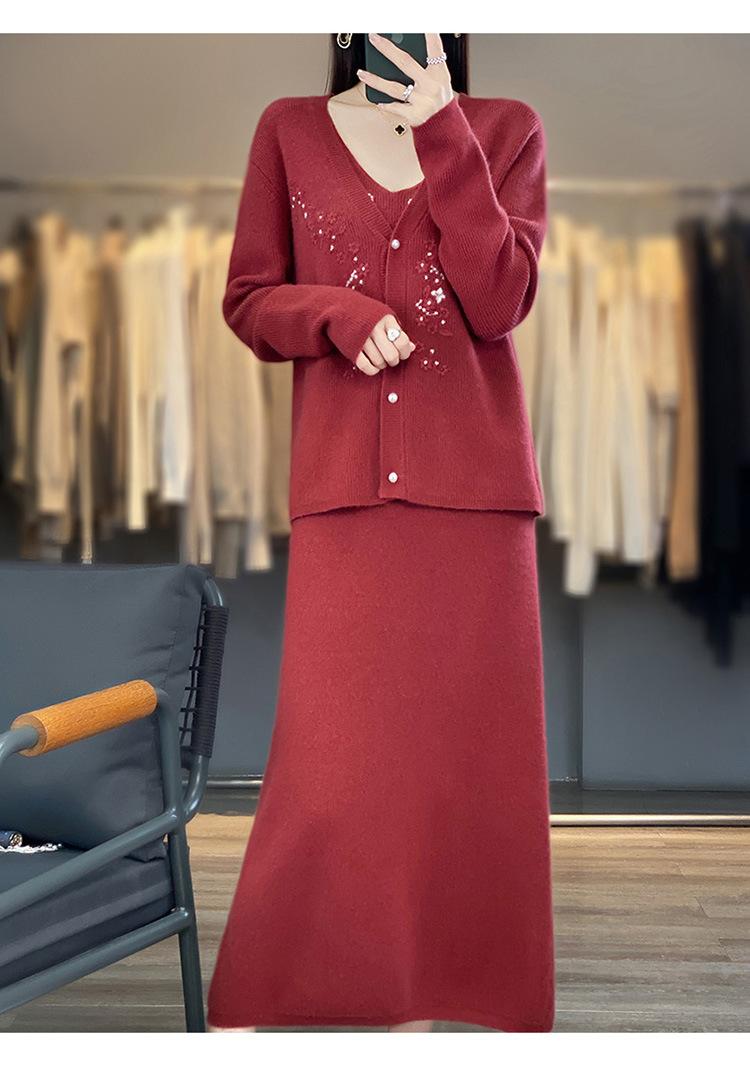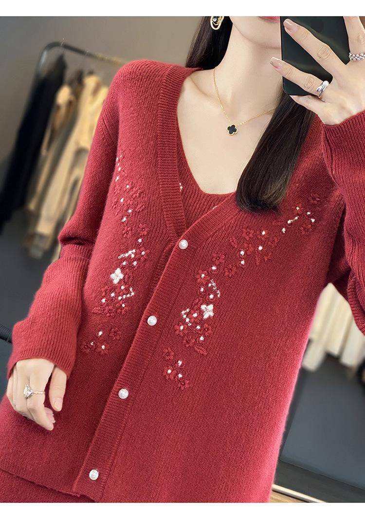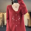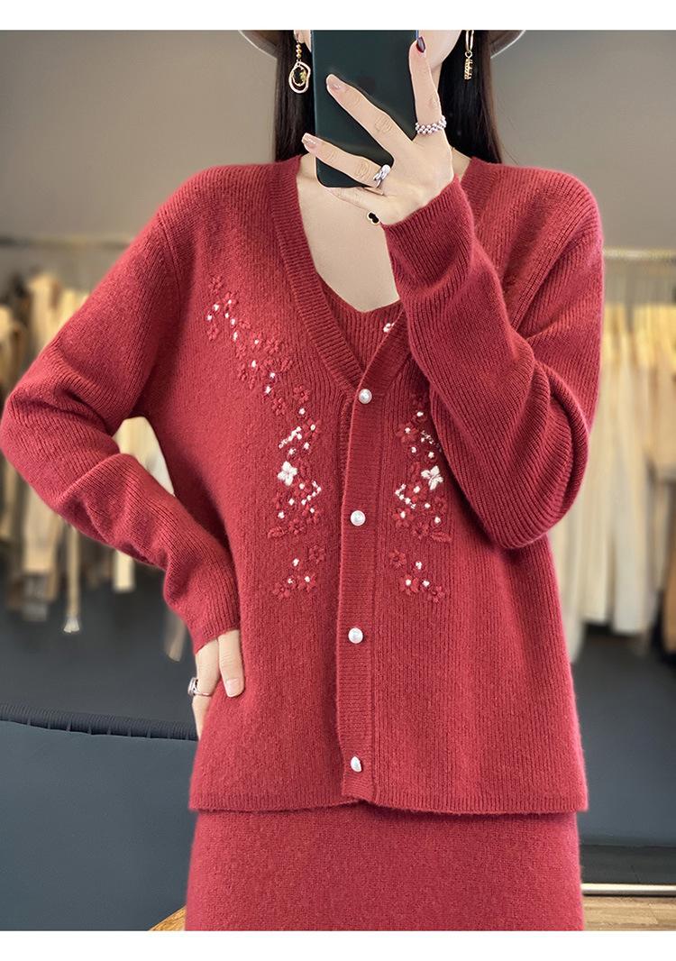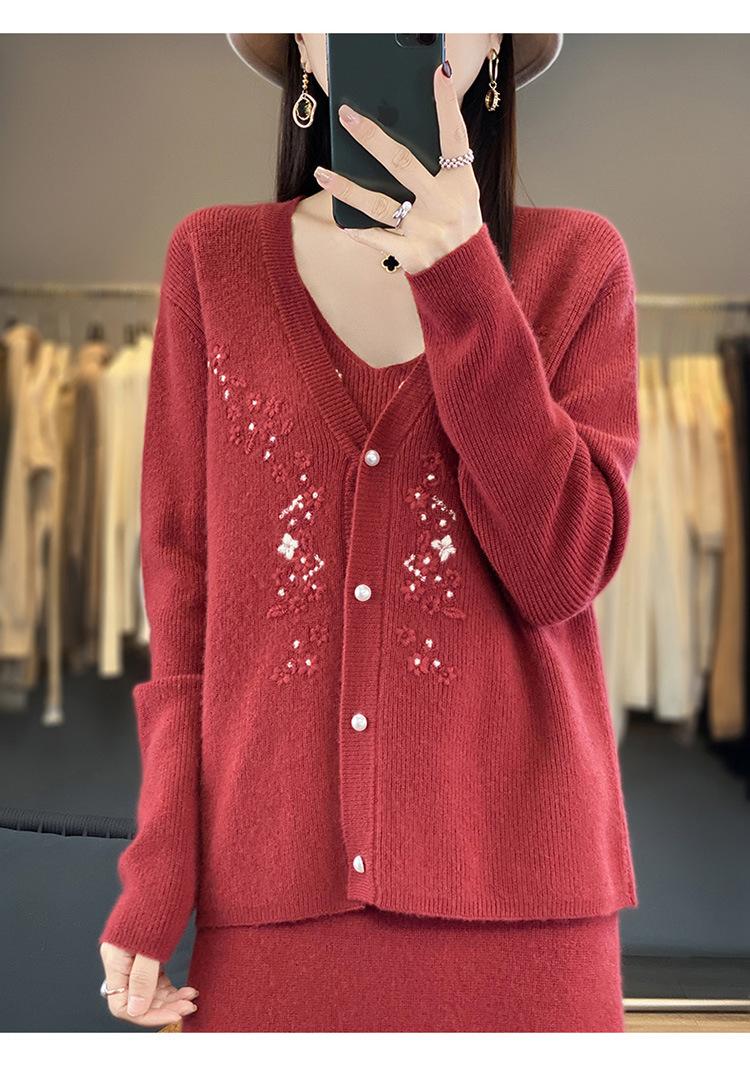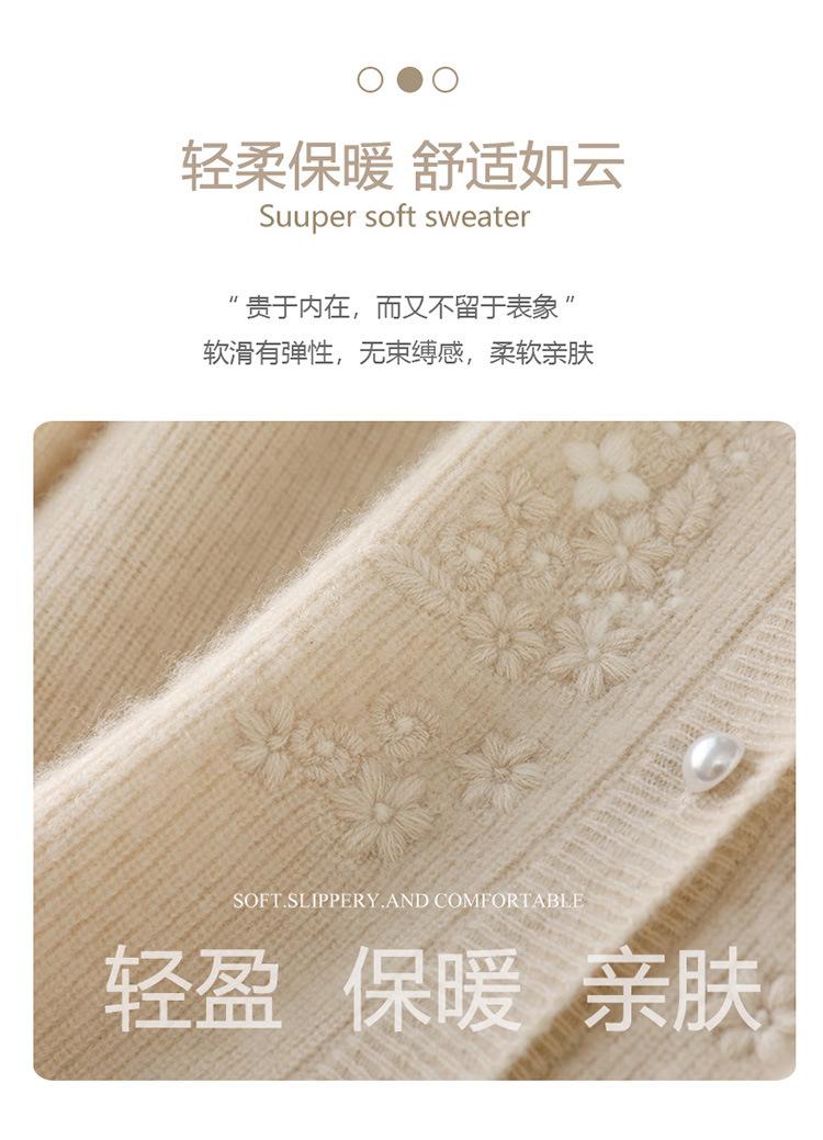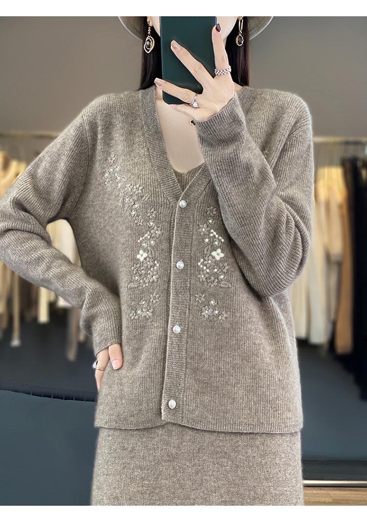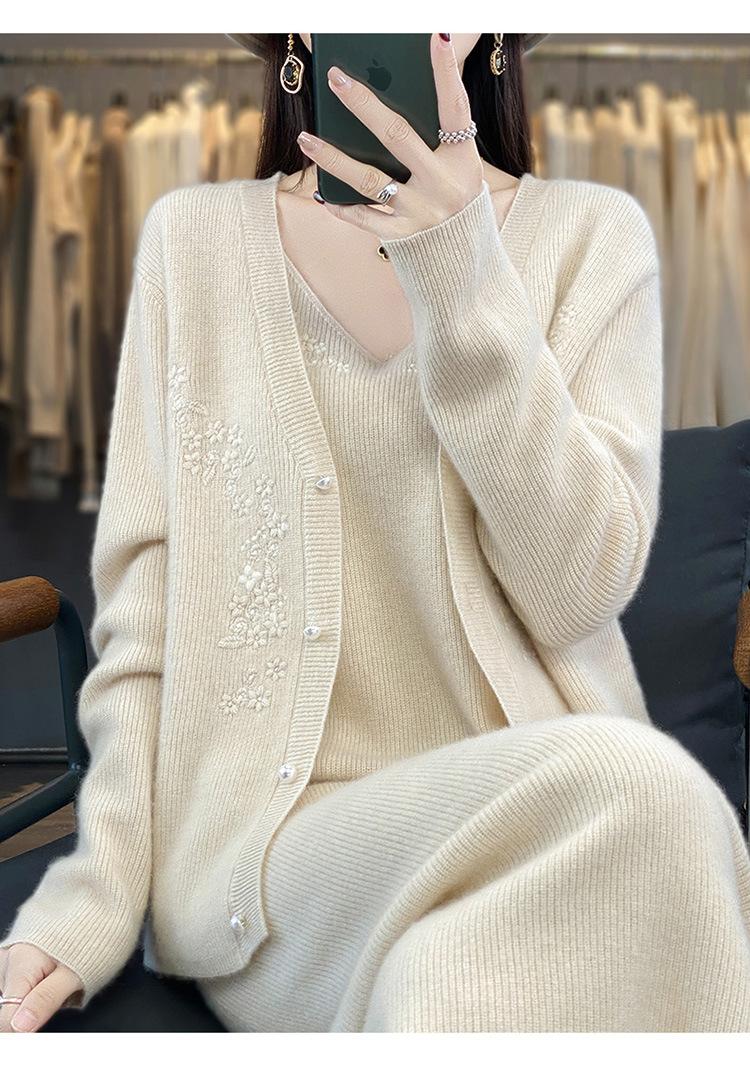 100% Lana Pura Otoño e Invierno Nuevo Cárdigan Corto de Punto con Cuello en V para Mujer Suelto Bordado Traje de Vestido por Encima de la Rodilla