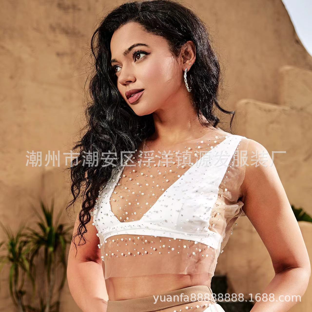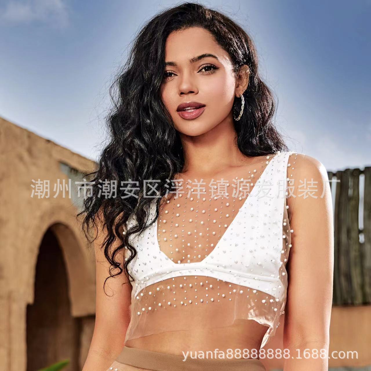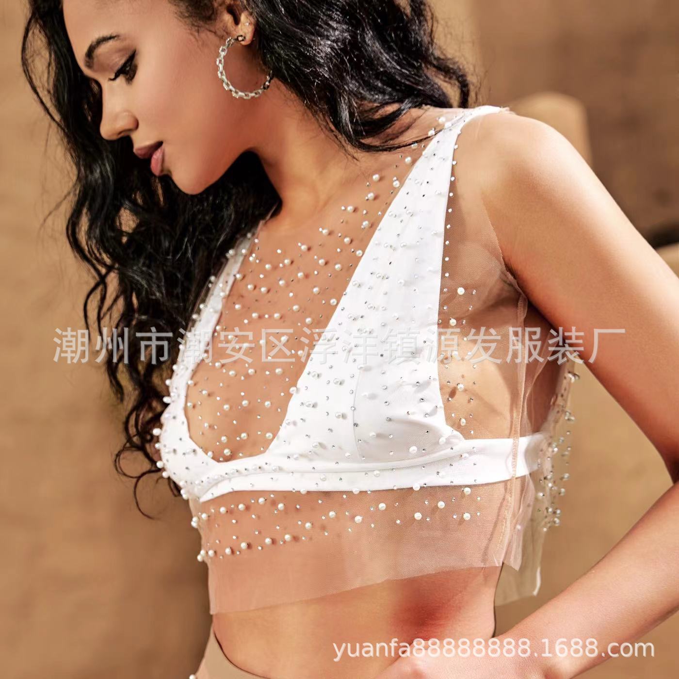 Chaleco corto de malla de playa con diamantes de imitación para mujer, estilo Spice Girl, con perspectiva de comercio exterior, 2023