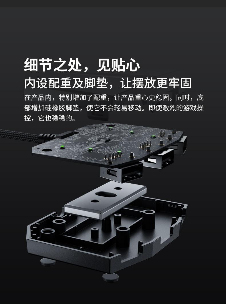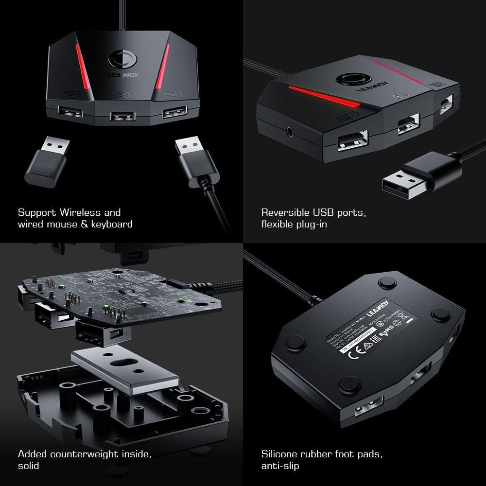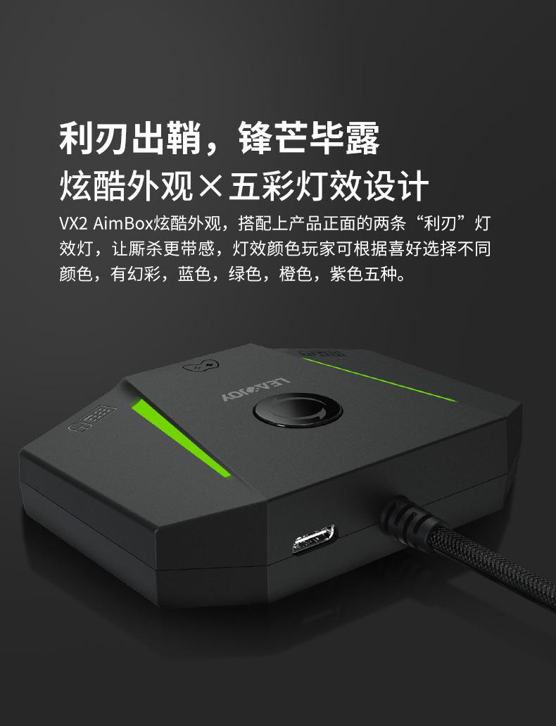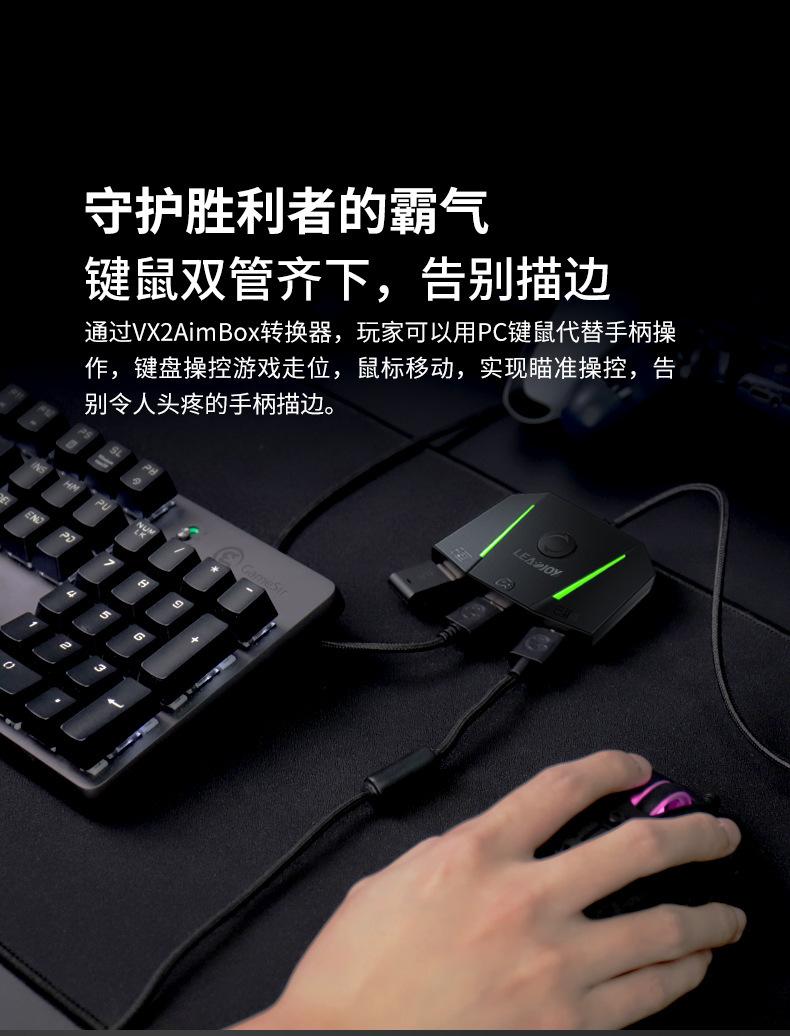 Funciones y características del producto | 1. VX AimBox puede proporcionar una experiencia de juego con ratón y teclado de alta precisión en Xbox One, Xbox Series X/S, PlayStation 4, PlayStation 5 y Nintendo Switch; 2. VX AimBox es de excelente calidad, flexible y fácil de usar, y tiene una apariencia hermosa, lo que lo convierte en un compañero perfecto para los jugadores; 3. La tecnología de conversión inteligente única de VX AimBox proporciona precisión de juego 1:1, para que siempre puedas jugar el mismo juego en cada partida que juegues; 4. A través de la aplicación Chicken Game World, los jugadores pueden realizar rápida y fácilmente los ajustes correspondientes para los valores de los botones del juego, las propiedades del ratón, las definiciones de macros, etc., lo que permite a los jugadores realizar "operaciones mágicas" como deseen en el juego. 5. Se incluyen un cable de datos MicroUSB y un cable de datos Tipo-C; 6. Hay dos luces de "hoja afilada" en la parte frontal del VX AimBox, y puedes elegir diferentes efectos de color (mágico, azul, verde, naranja, púrpura) según las preferencias del jugador; 7. Diseño de contrapeso incorporado y almohadilla de goma de silicona para los pies, el juego se coloca más firmemente; 8. Los tres puertos USB-A en la parte frontal son de doble cara, lo que le permite conectarlos de la forma que desee. |