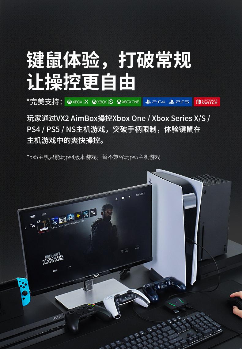 Nota: Al usar la consola PS5, el VX2 AIM BOX necesita ser guiado por el control original de segunda generación de PS4. Solo puede jugar juegos de PS4 en la PS5. Otras consolas solo necesitan ser guiadas por el control original.