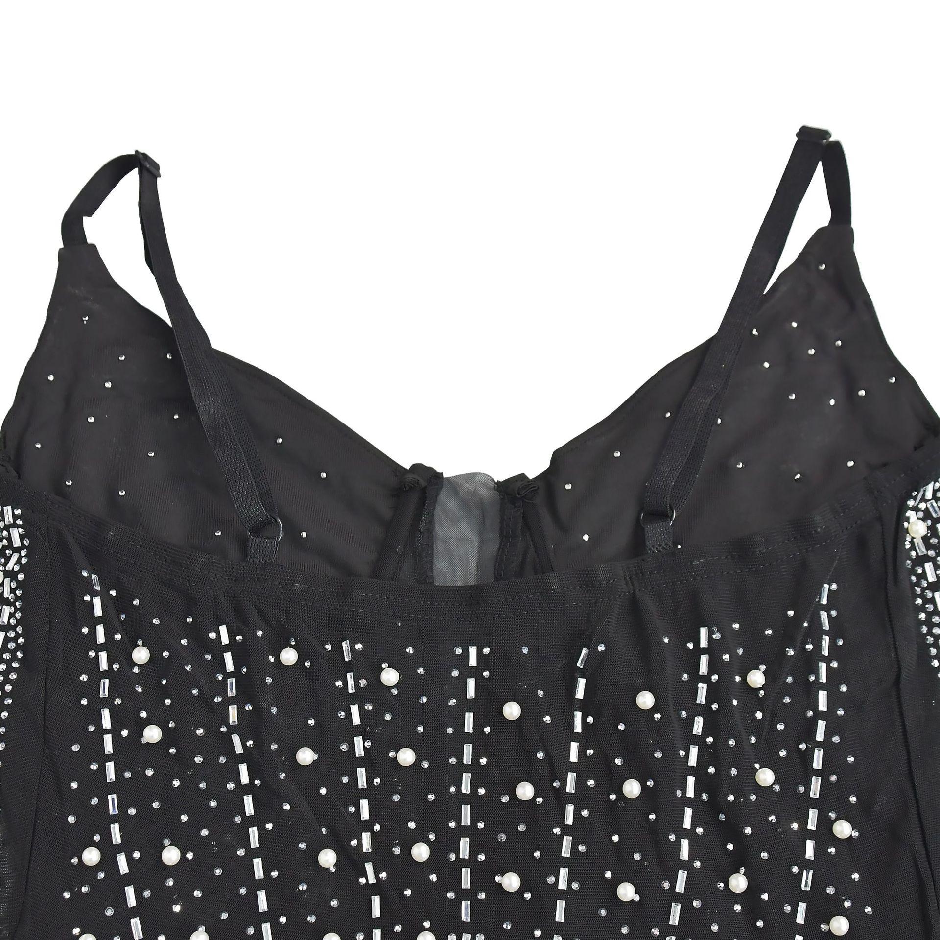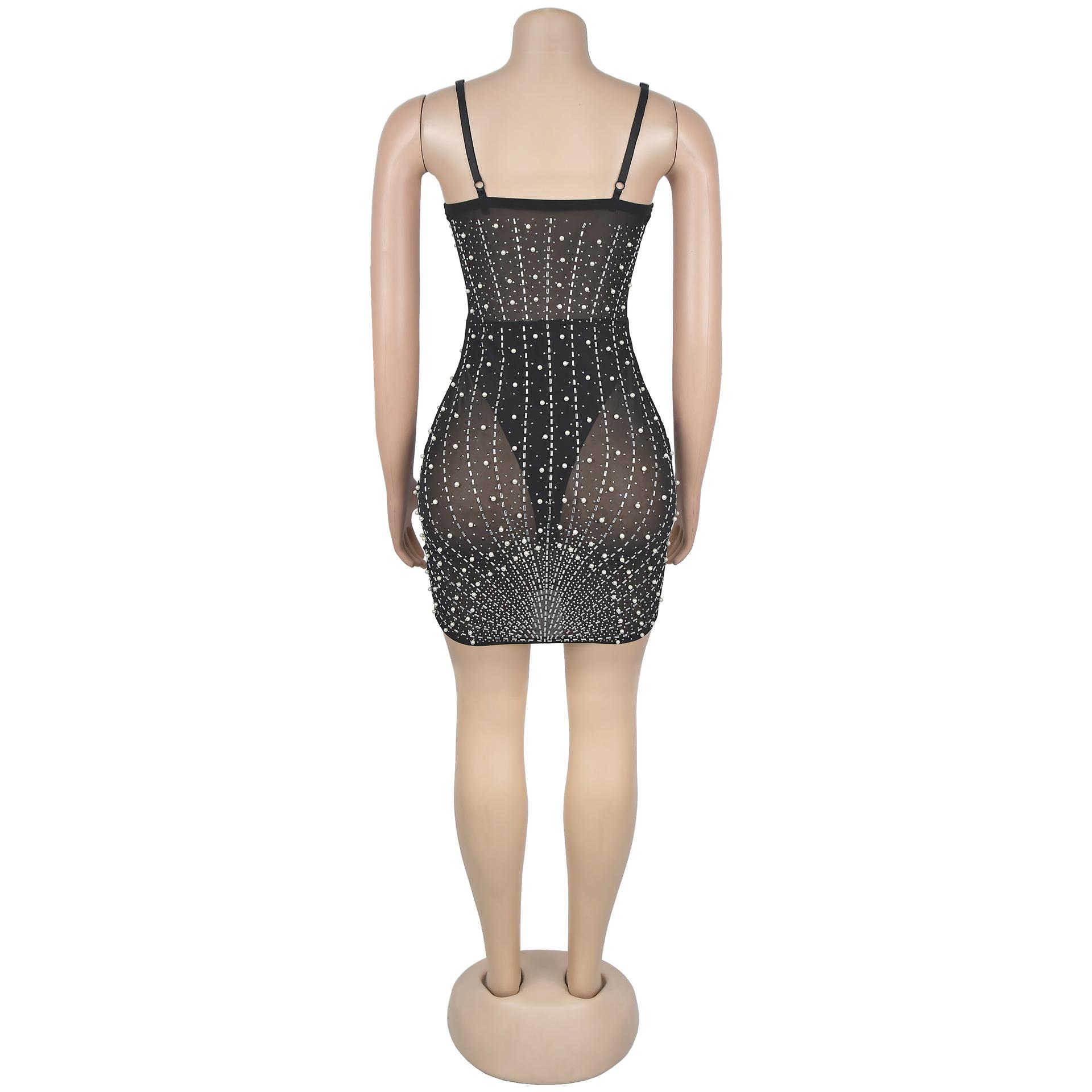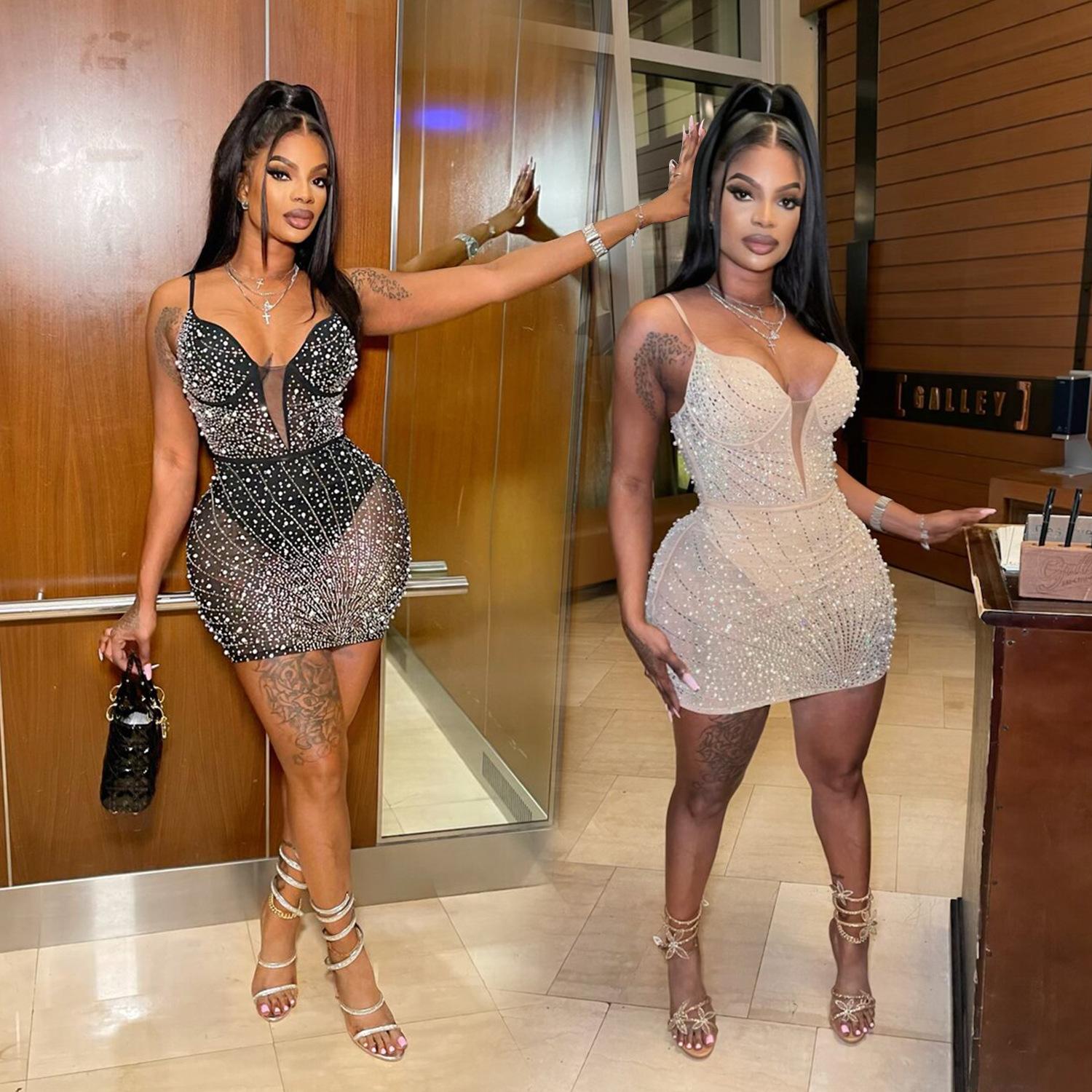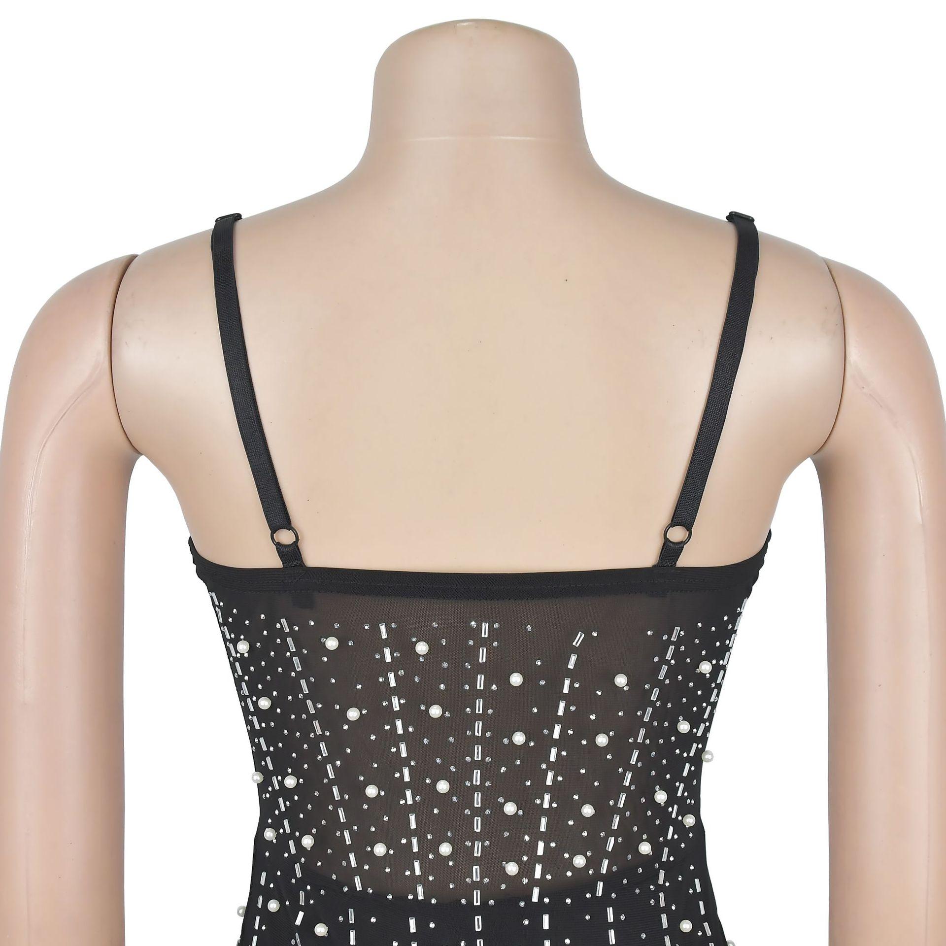 C6602 Aliexpress Amazon Moda Europea y Americana para Mujer Color Puro Diamantes de Imitación Malla Sin Mangas Tirantes Falda Vestido