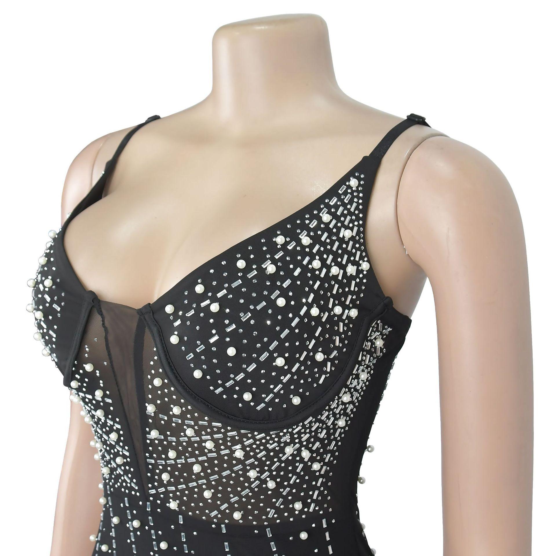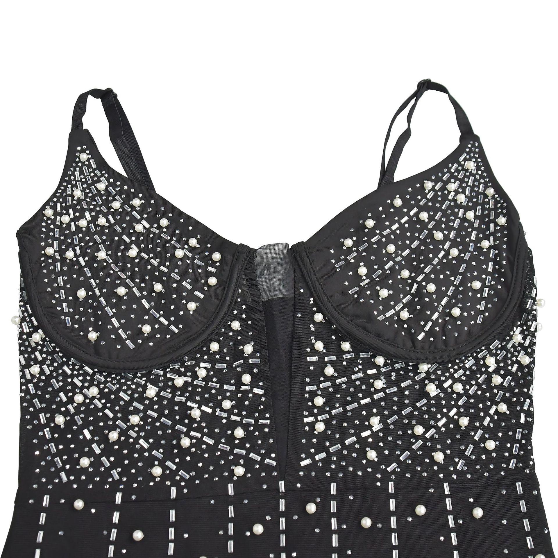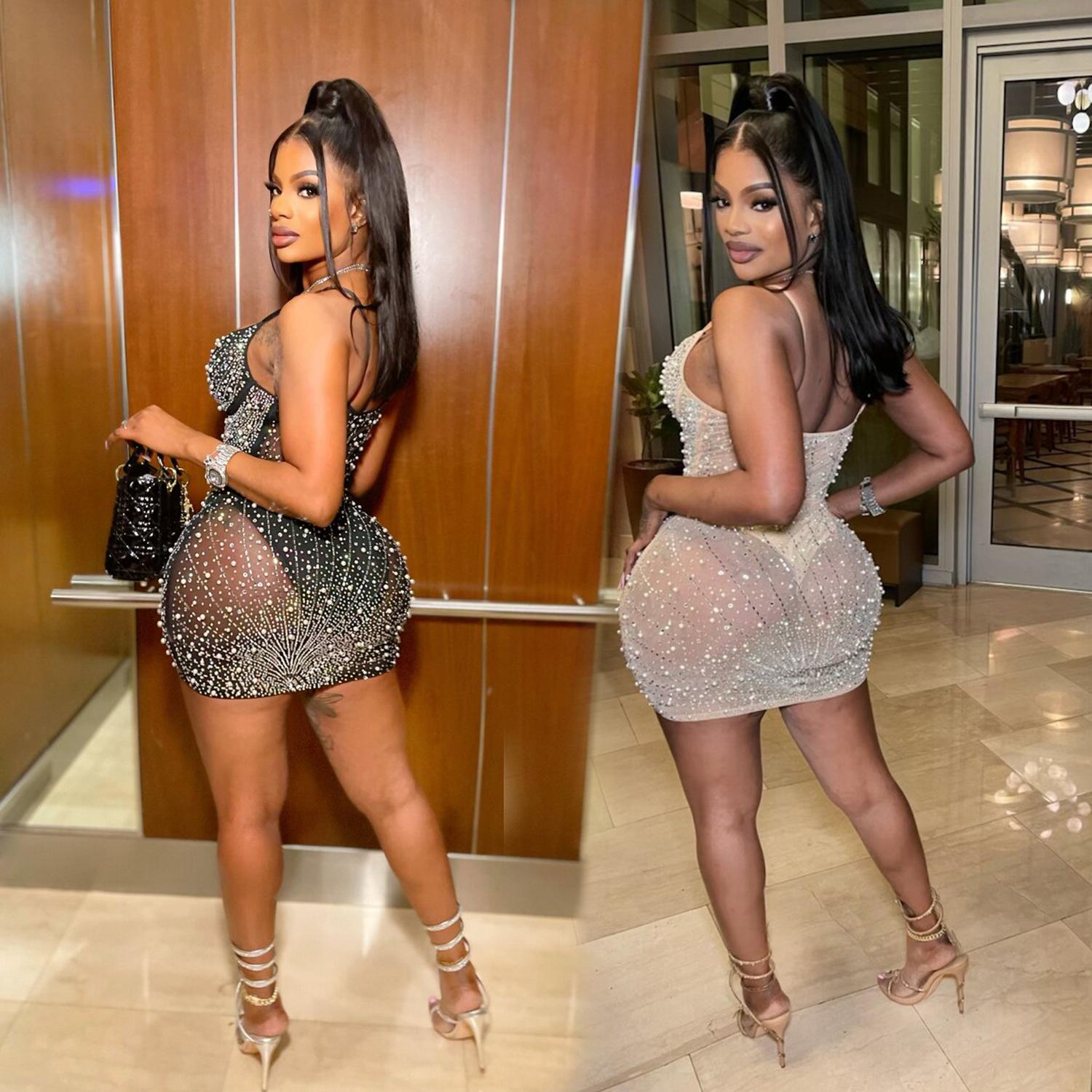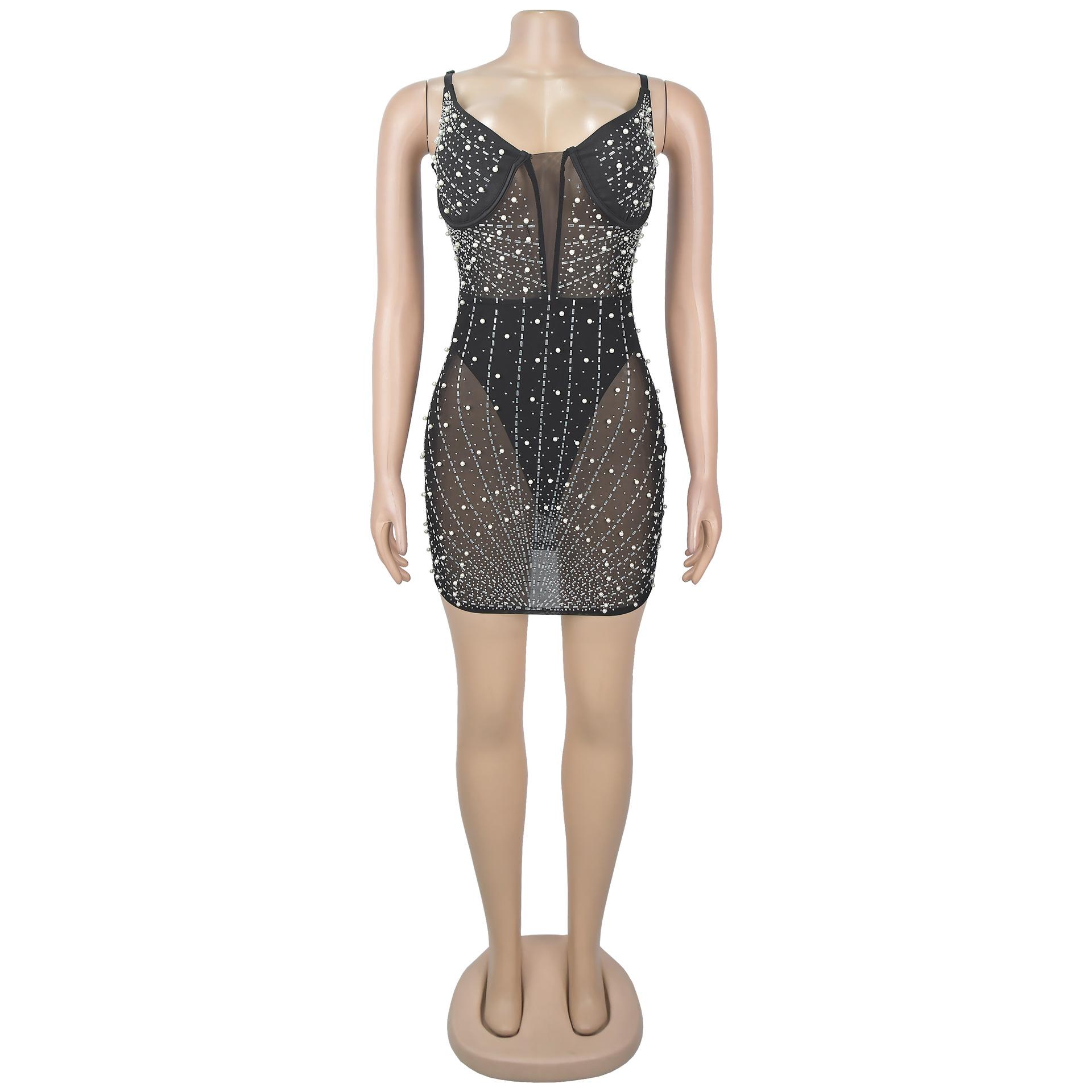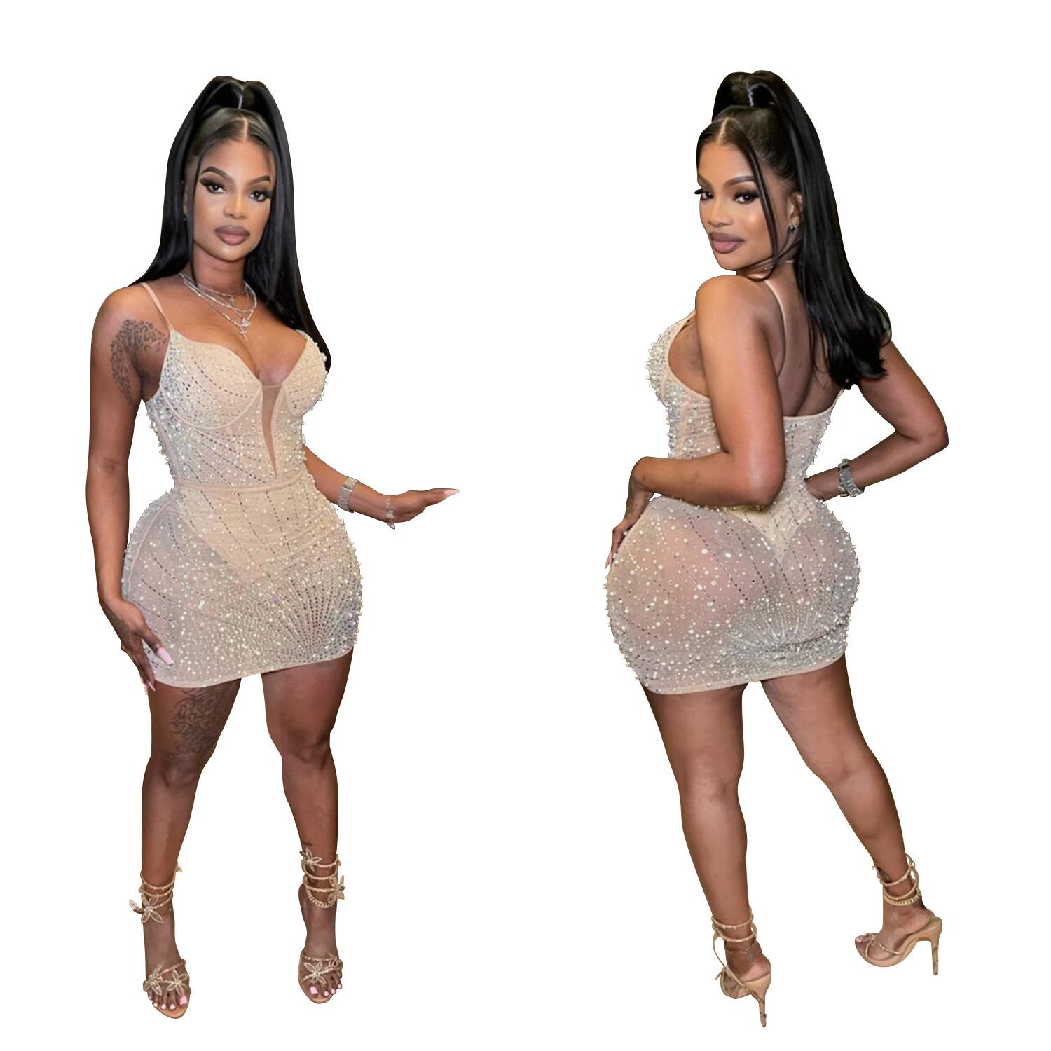 C6602 Aliexpress Amazon Moda Europea y Americana para Mujer Color Puro Diamantes de Imitación Malla Sin Mangas Tirantes Falda Vestido