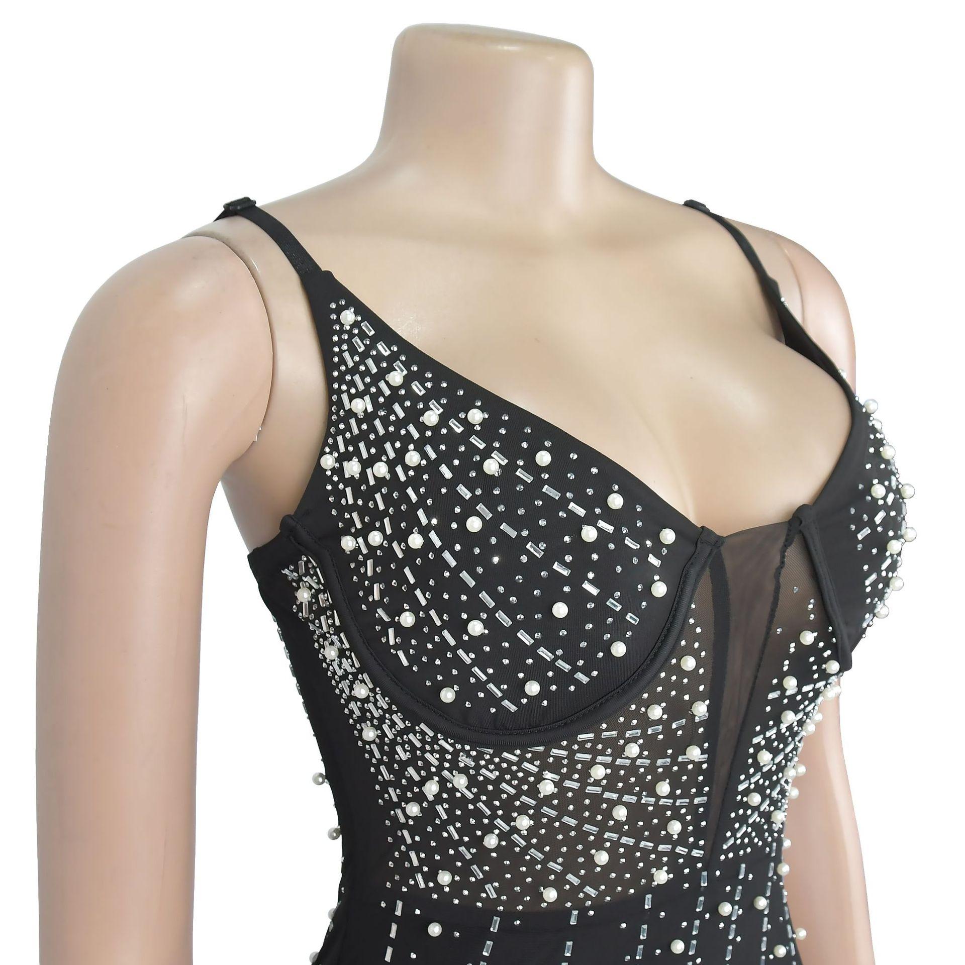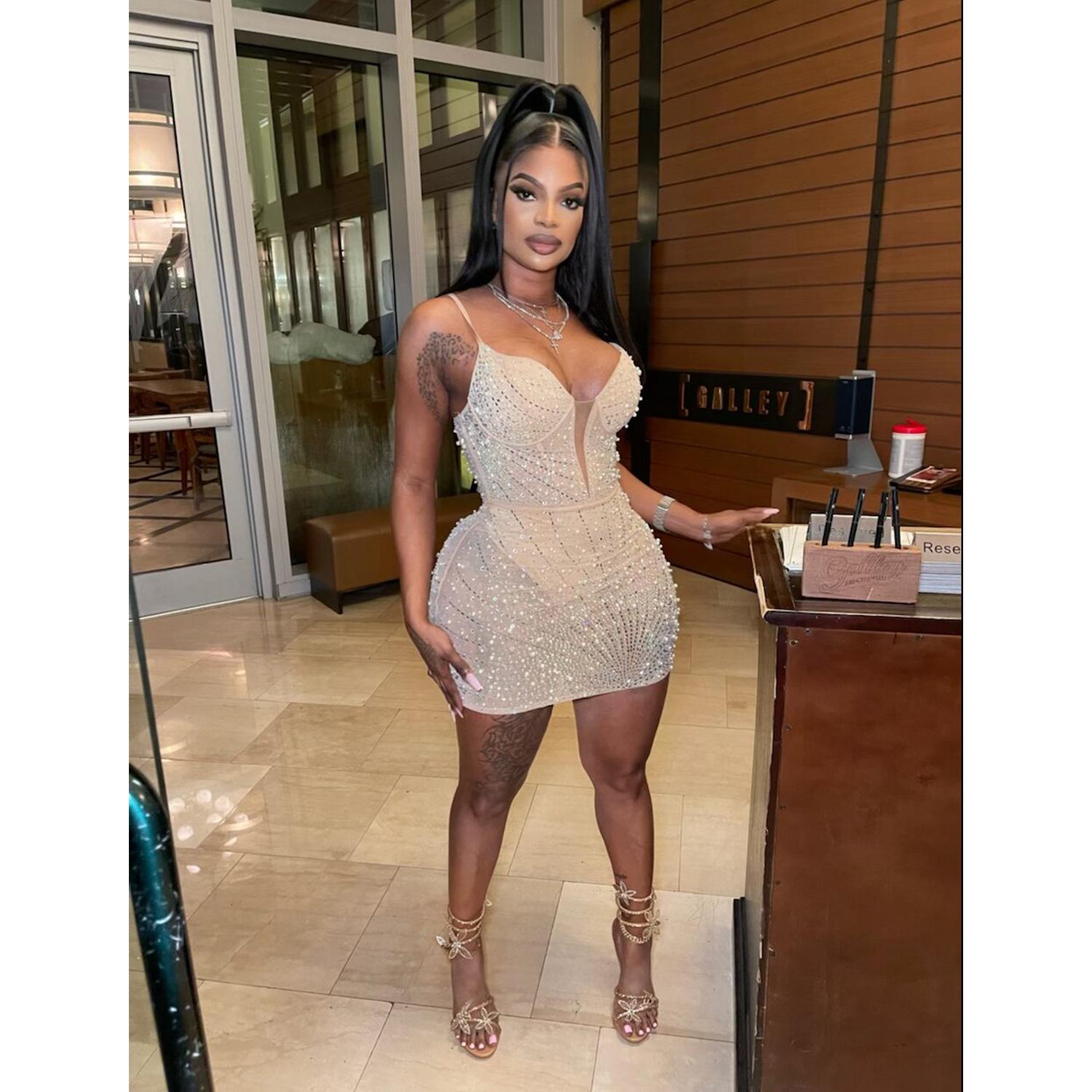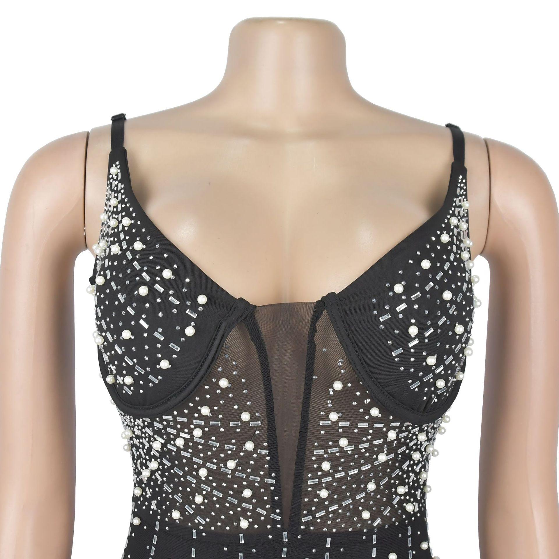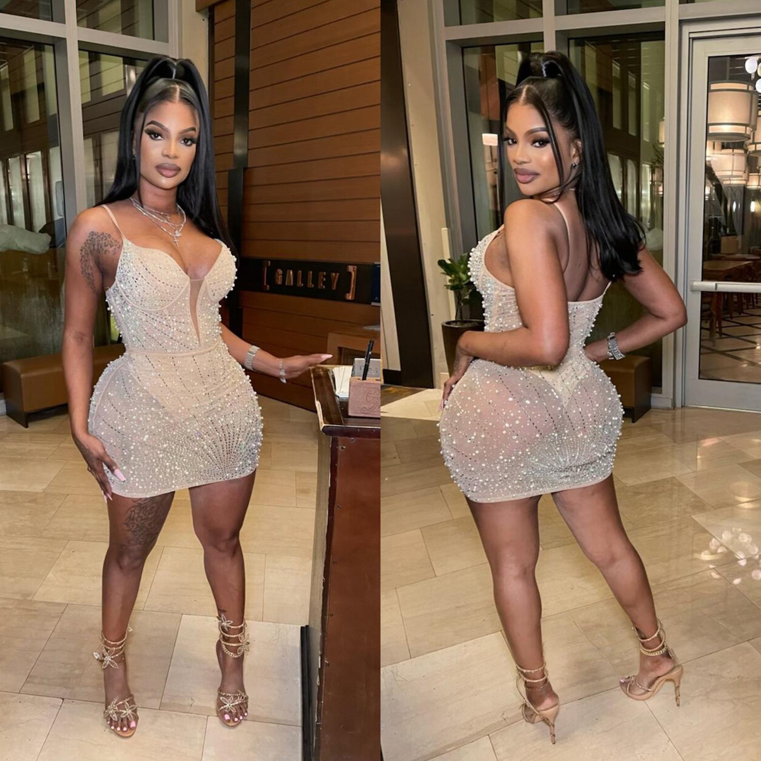C6602 Aliexpress Amazon Moda Europea y Americana para Mujer Color Puro Diamantes de Imitación Malla Sin Mangas Tirantes Falda Vestido