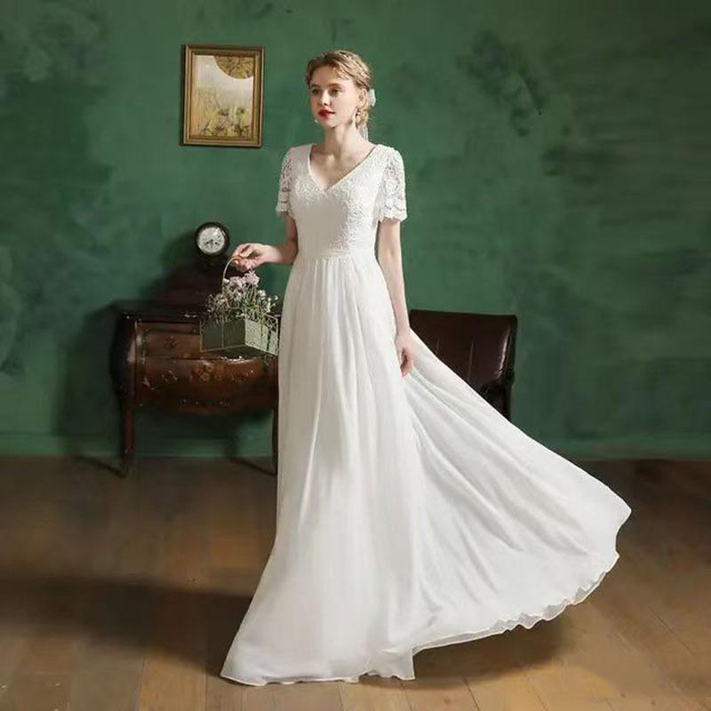 Vestido de Novia Ligero de Encaje Blanco Nuevo Estilo 2026 Adelgazante Largo Elegante Estilo Diosa Vestido de Fiesta Anual de Noche con Cola Grande para Otoño