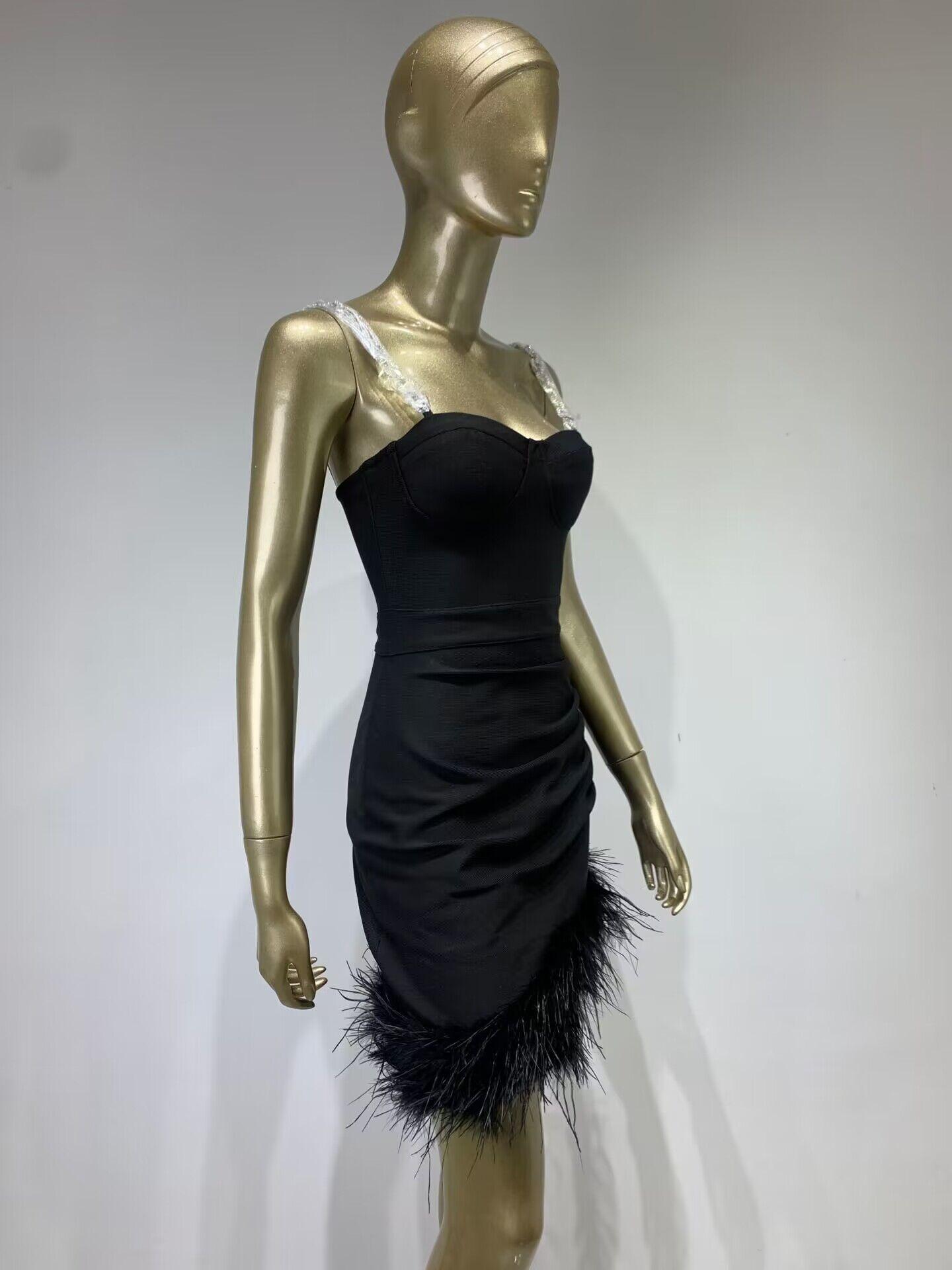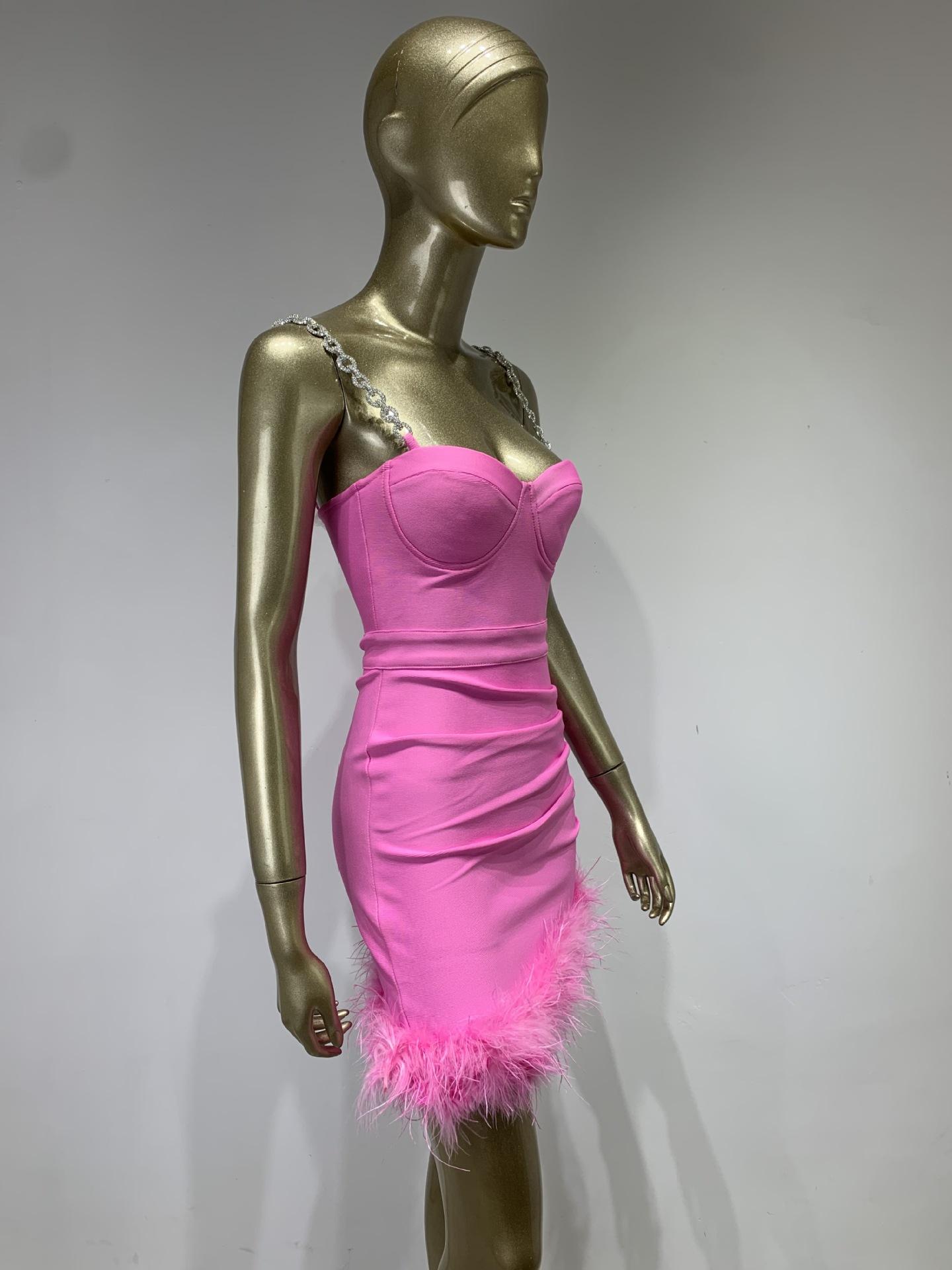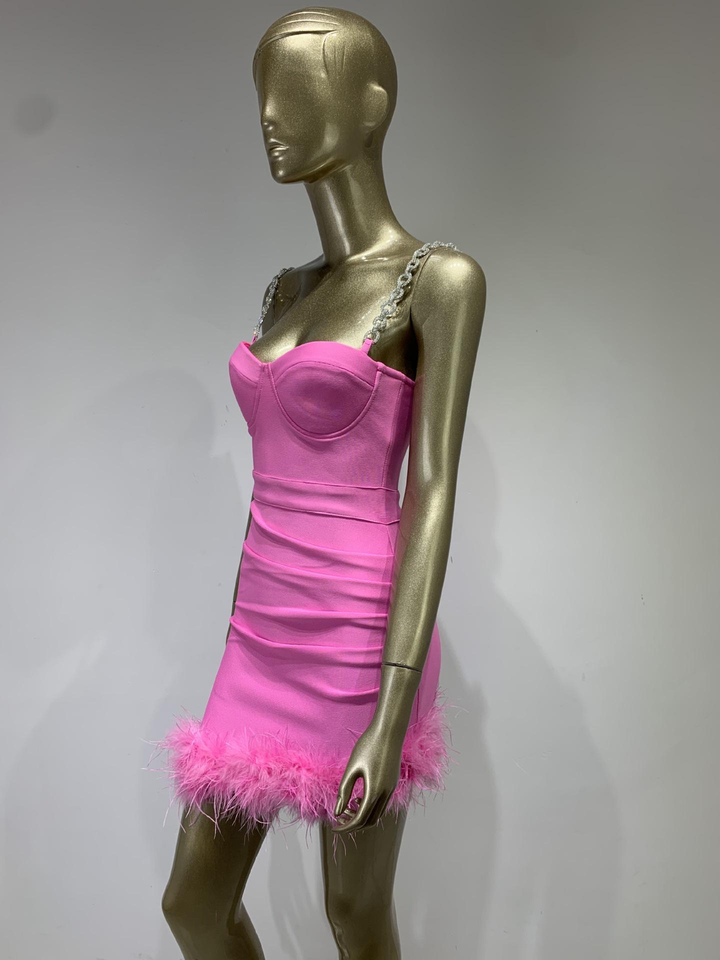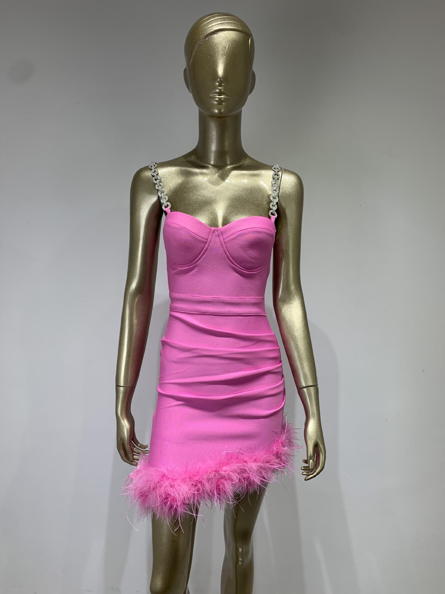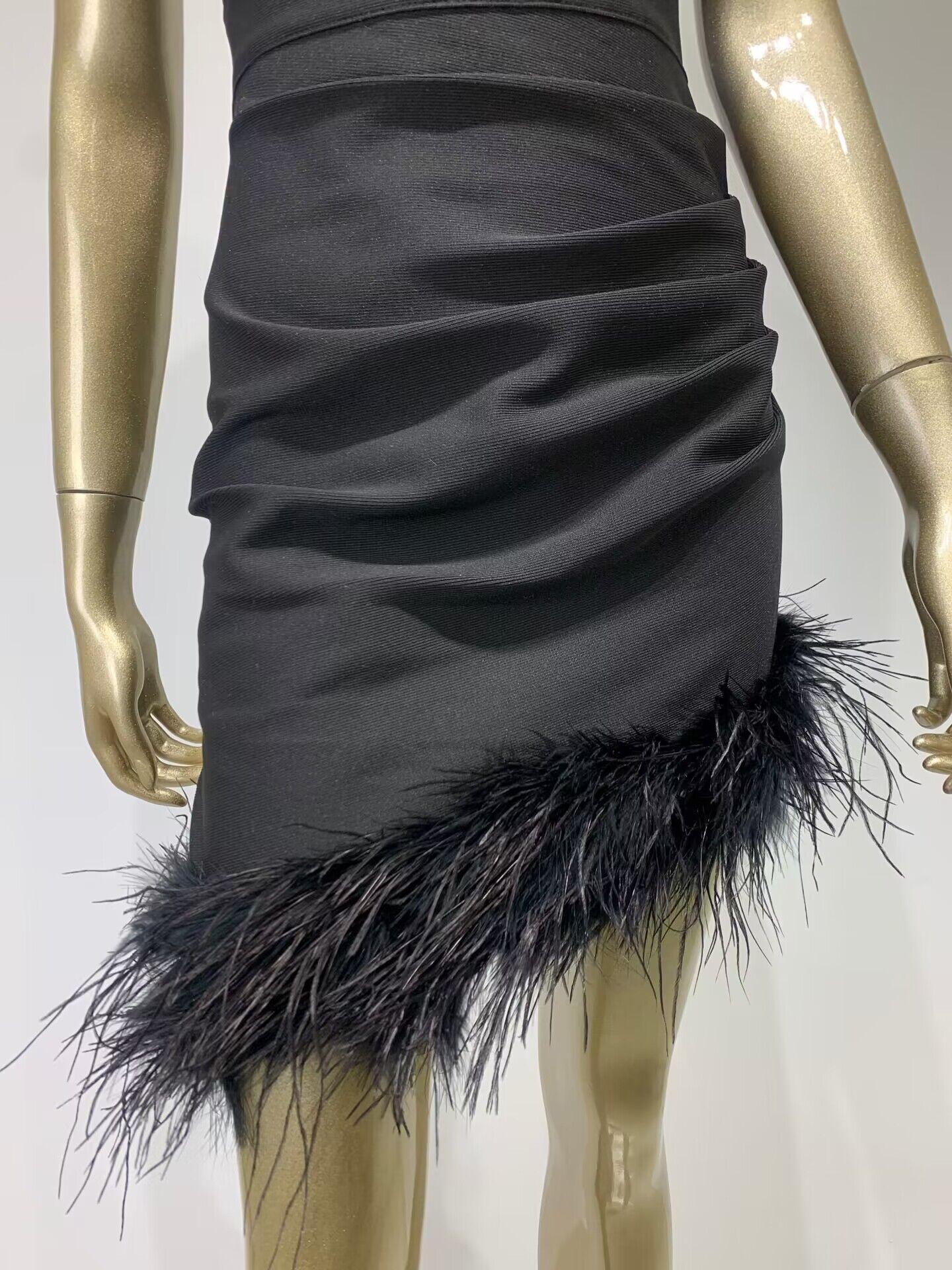 Vestido de vendaje transfronterizo nuevo 2023, gran oferta de Amazon, moda europea y americana, vestido ajustado con pliegues y costuras de plumas.