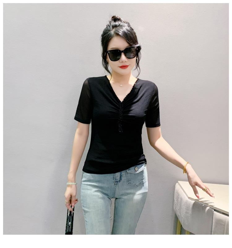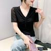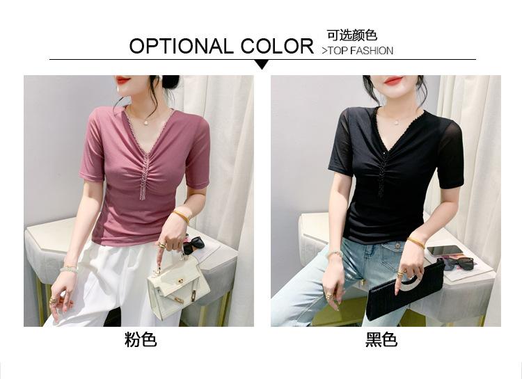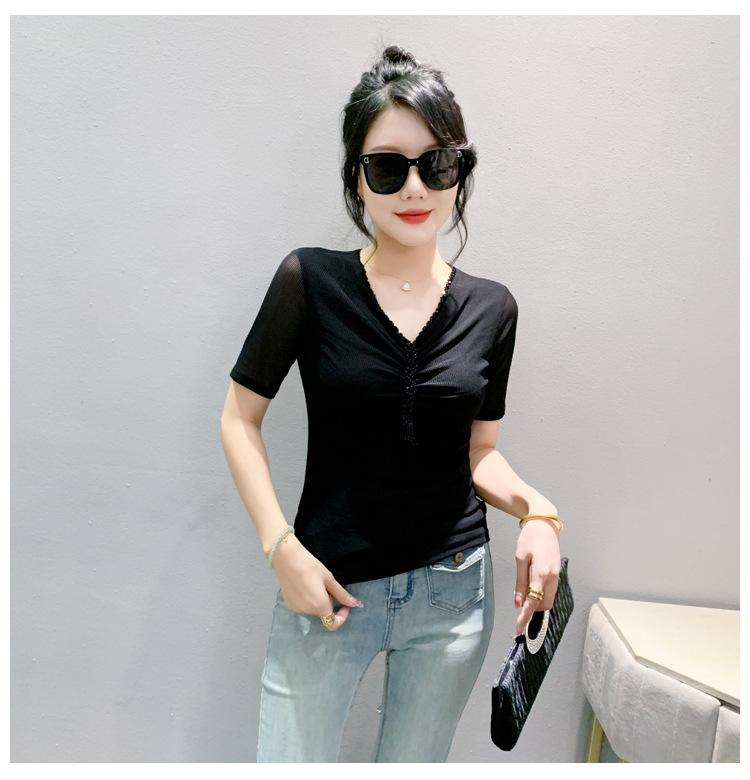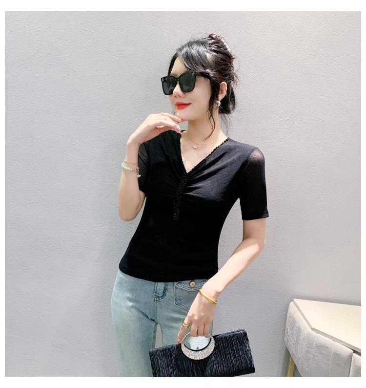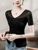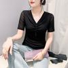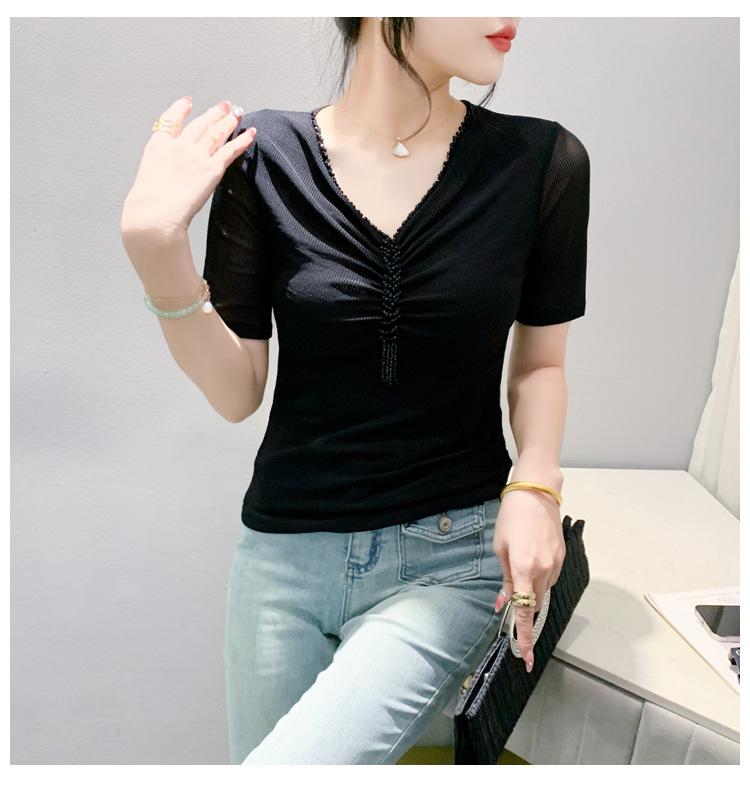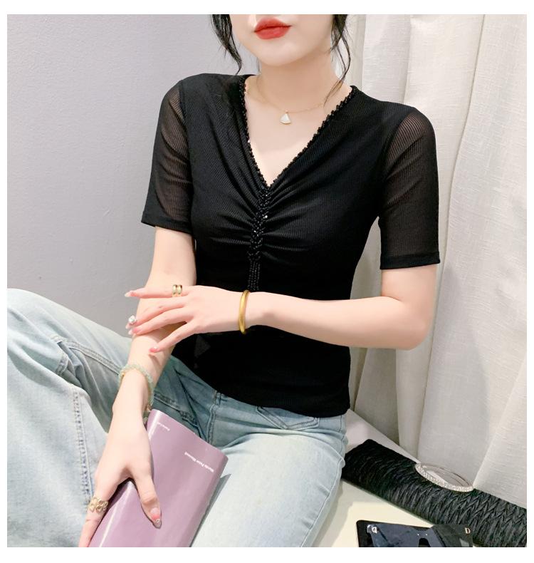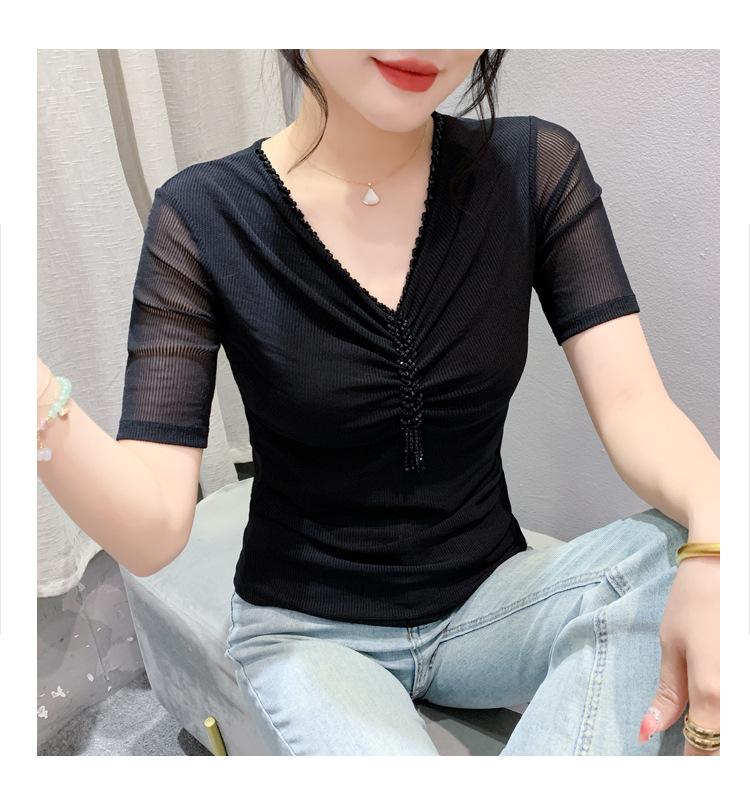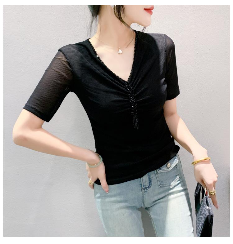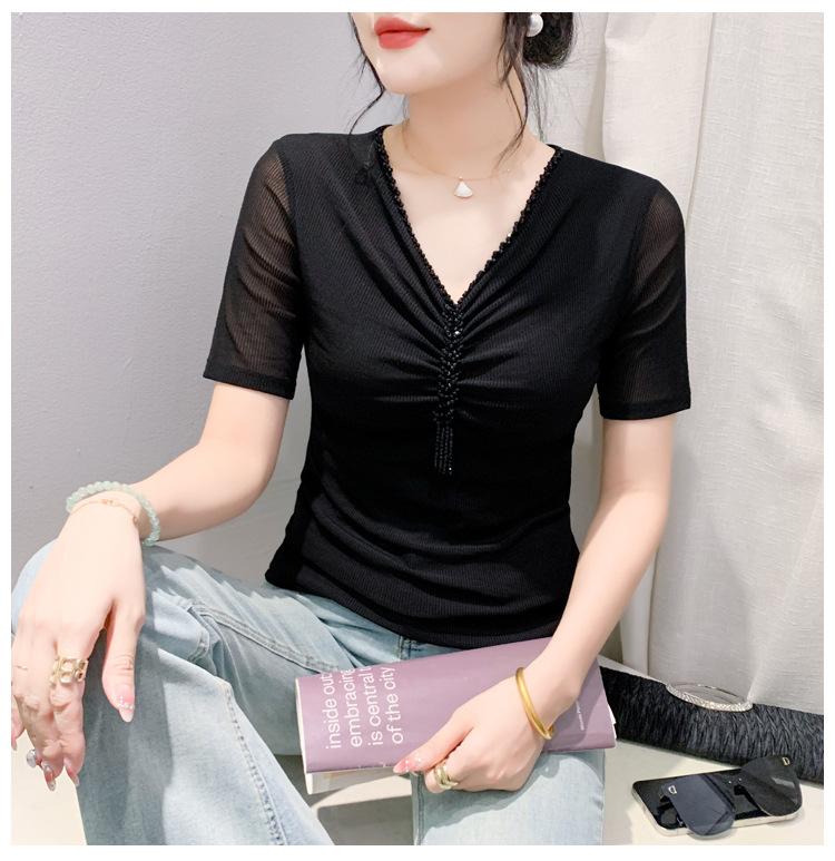 Playera Sexy de Malla con Cuello en V para Mujer, Manga Corta Verano Diseño Europeo, Top con Cuentas, Playera de Manga Media Moderna y Versátil