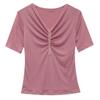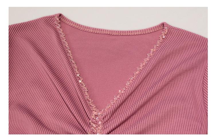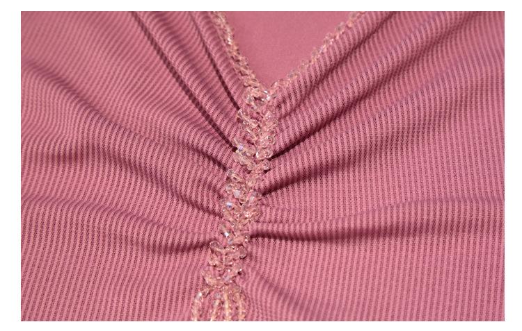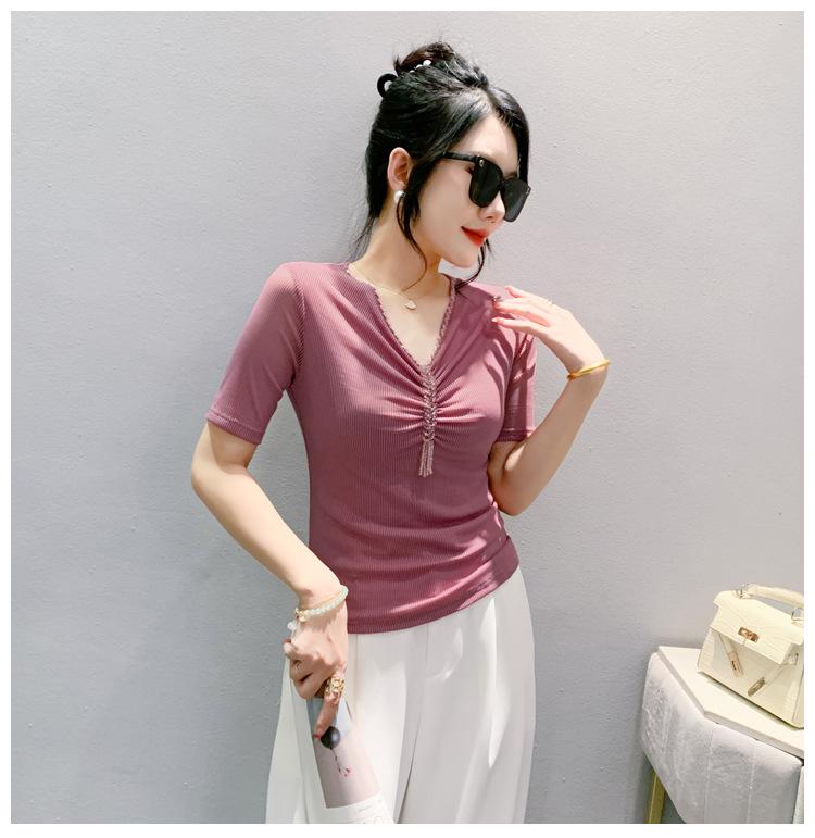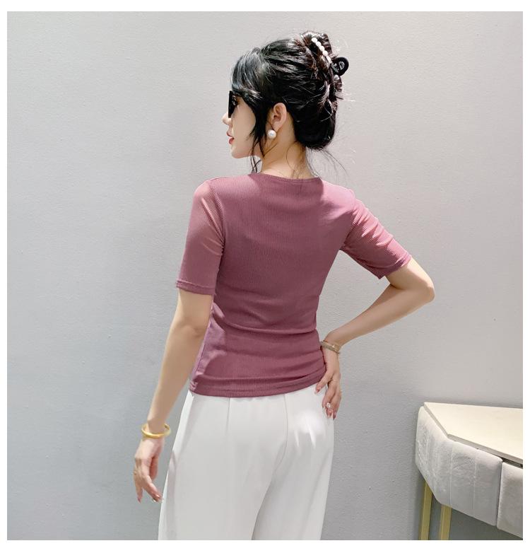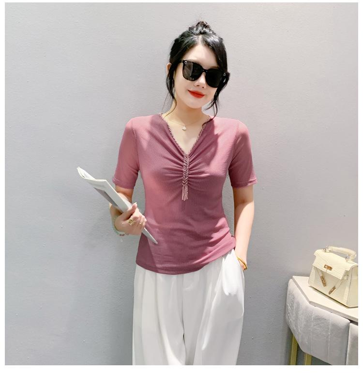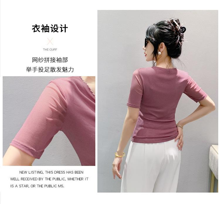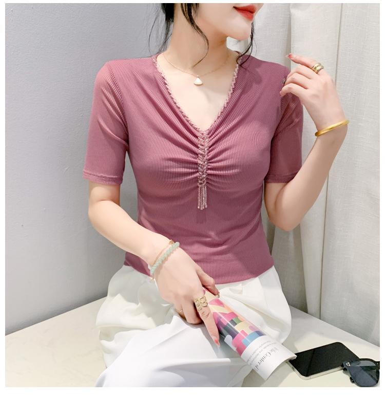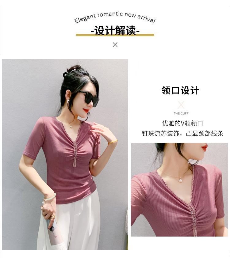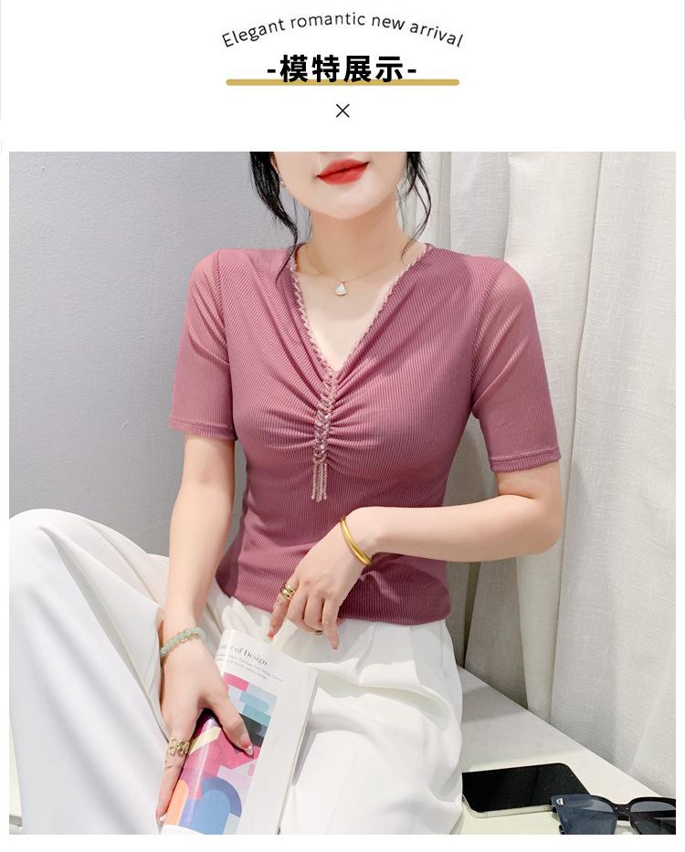 Playera Sexy de Malla con Cuello en V para Mujer, Manga Corta Verano Diseño Europeo, Top con Cuentas, Playera de Manga Media Moderna y Versátil