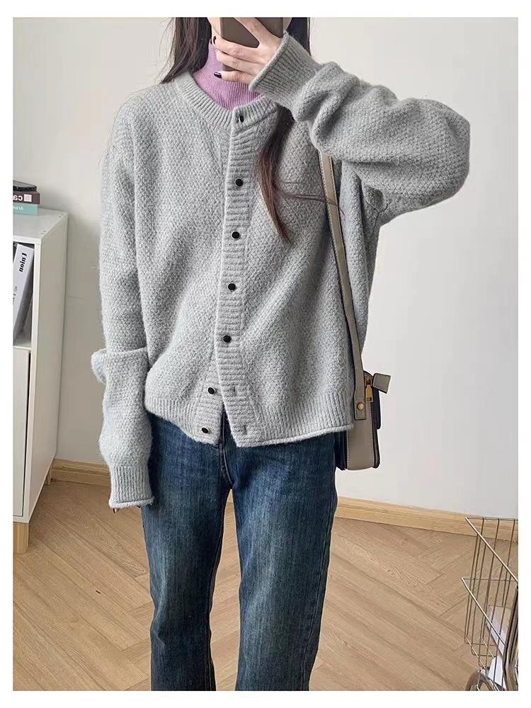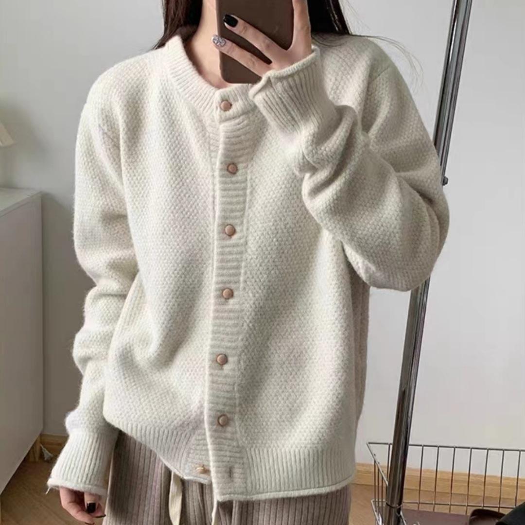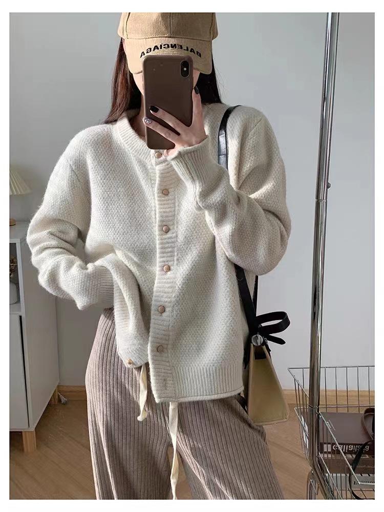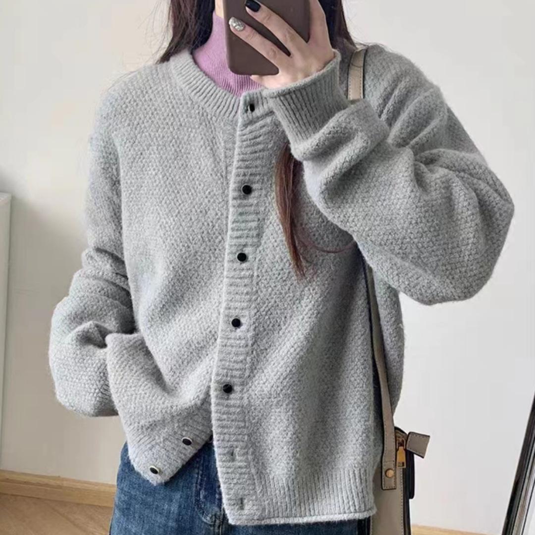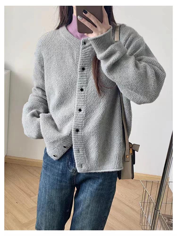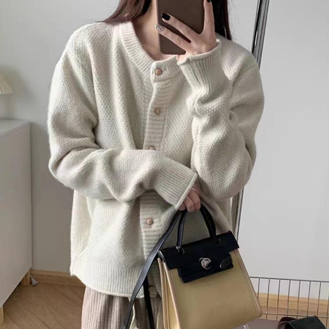 Suéter de punto con cuello redondo de estilo perezoso para mujer, diseño de primavera y otoño, cárdigan de punto de nicho con parte superior pequeña.