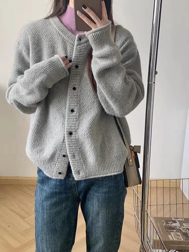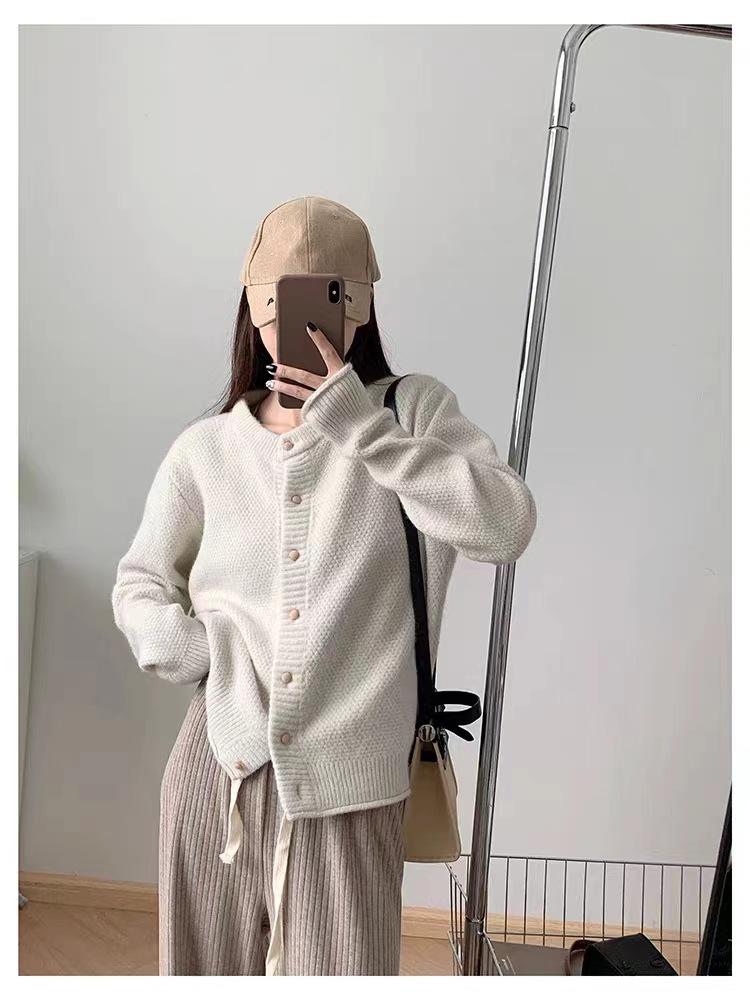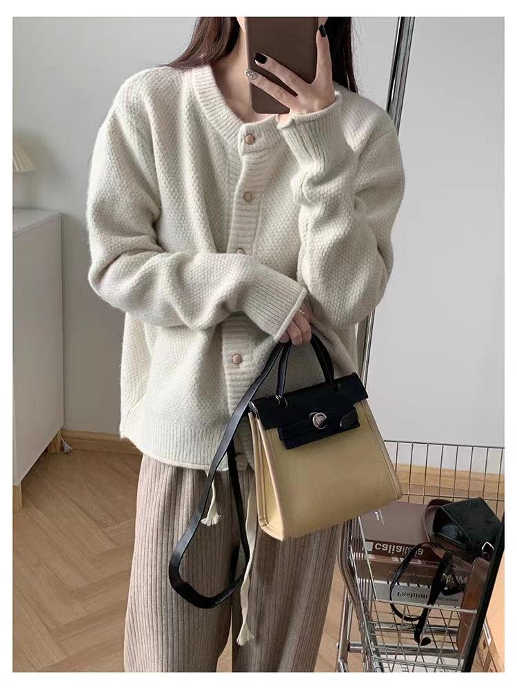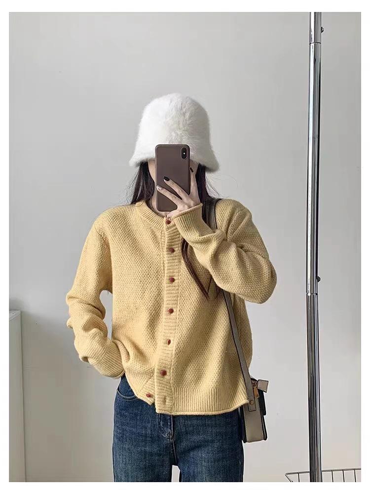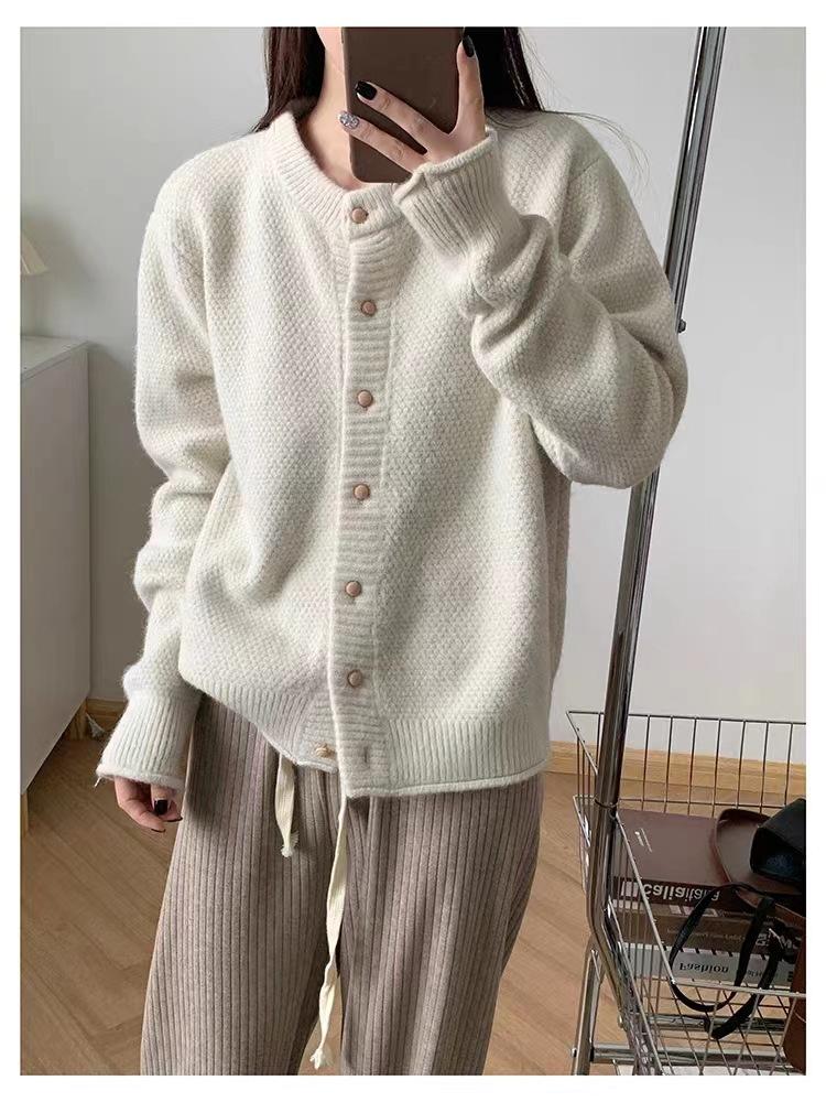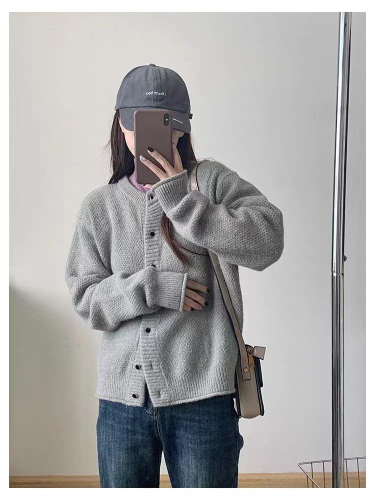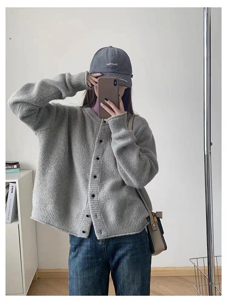 Suéter de punto con cuello redondo de estilo perezoso para mujer, diseño de primavera y otoño, cárdigan de punto de nicho con parte superior pequeña.