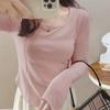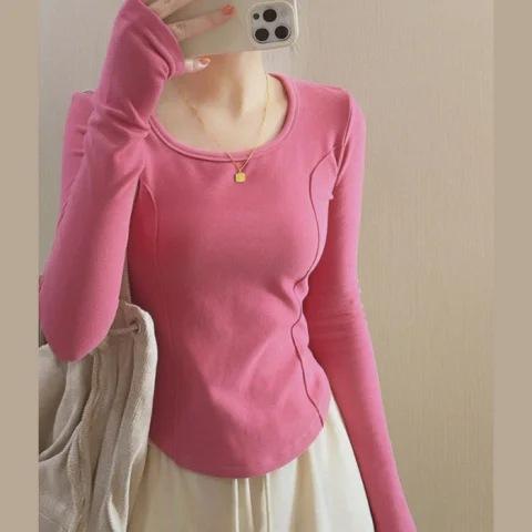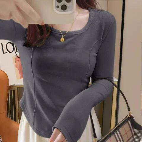 Camiseta de manga larga para mujer, otoño, nuevo diseño de estilo coreano, nicho de sentido, dobladillo en forma de U, top de niña, corte entallado, combina con todo, camisa de moda