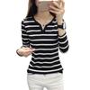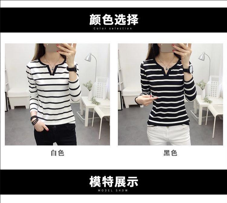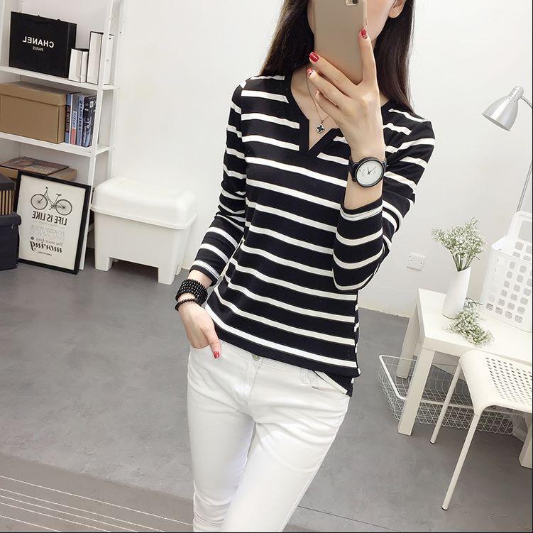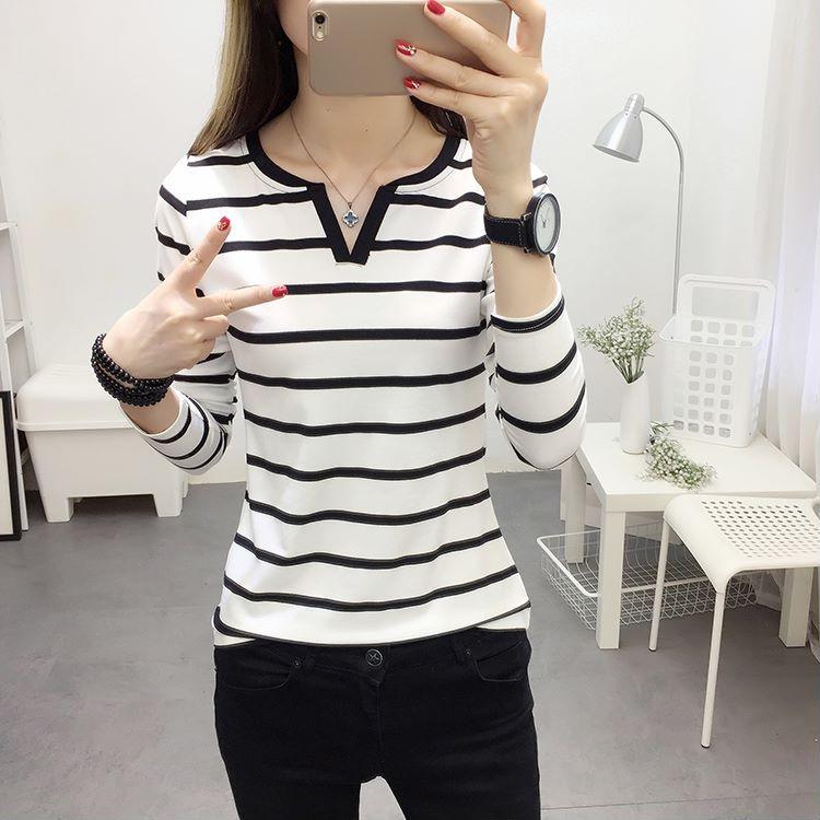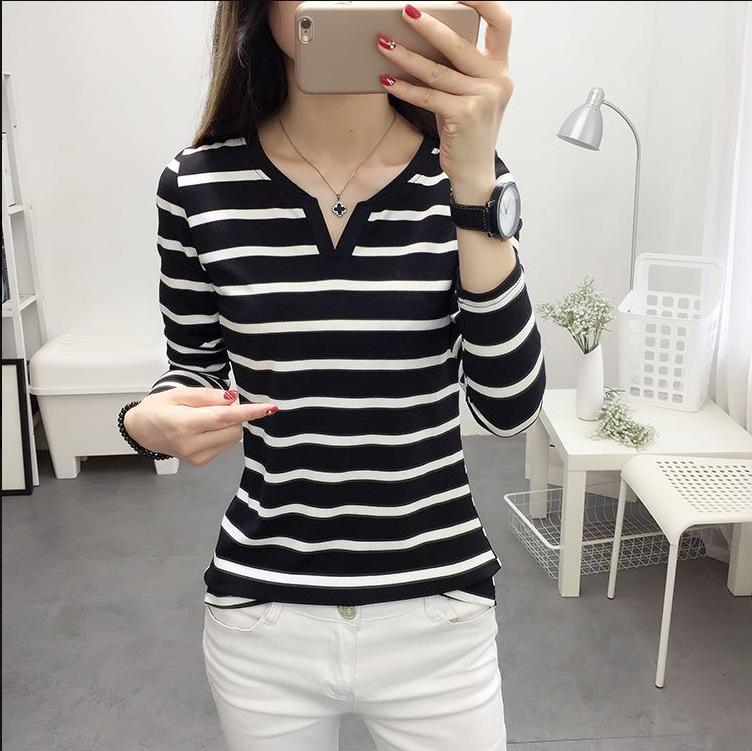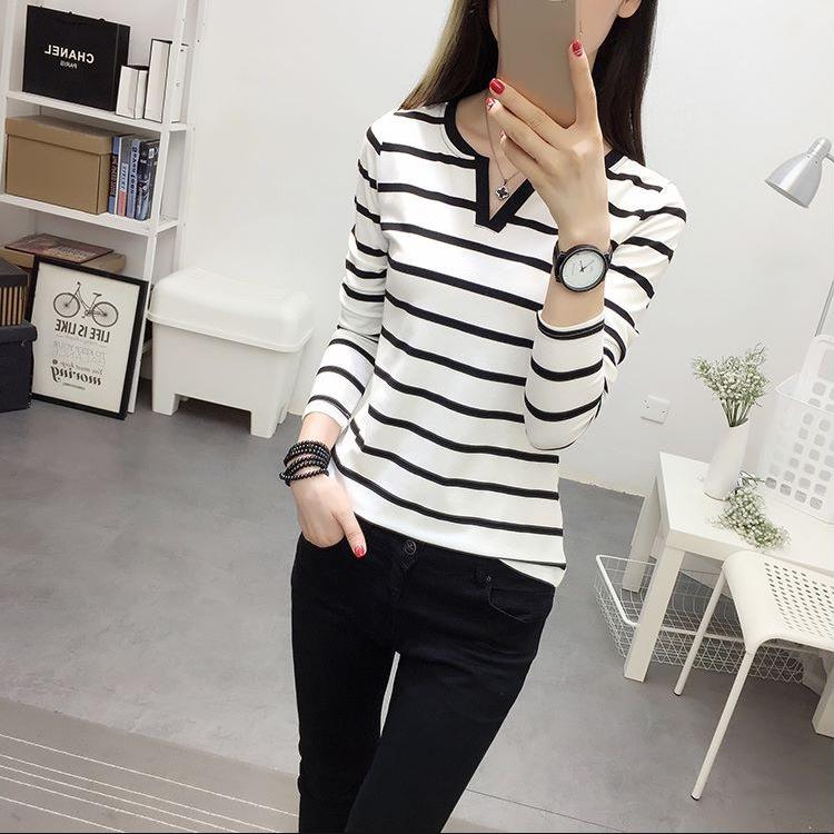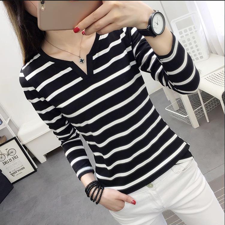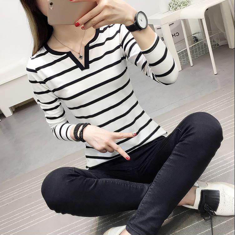 2023 Nuevo Otoño Estilo Coreano Ajustado Rayado Cuello en V Manga Larga Camiseta Tops para Estudiante Camiseta Básica Ins Trbottom