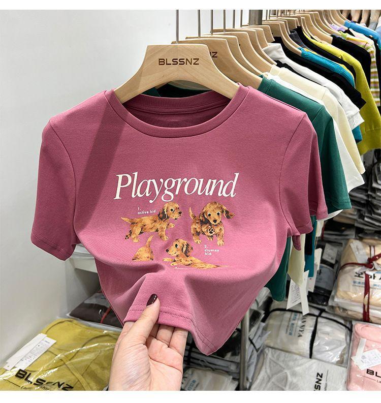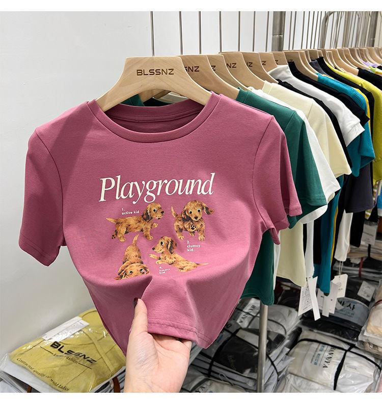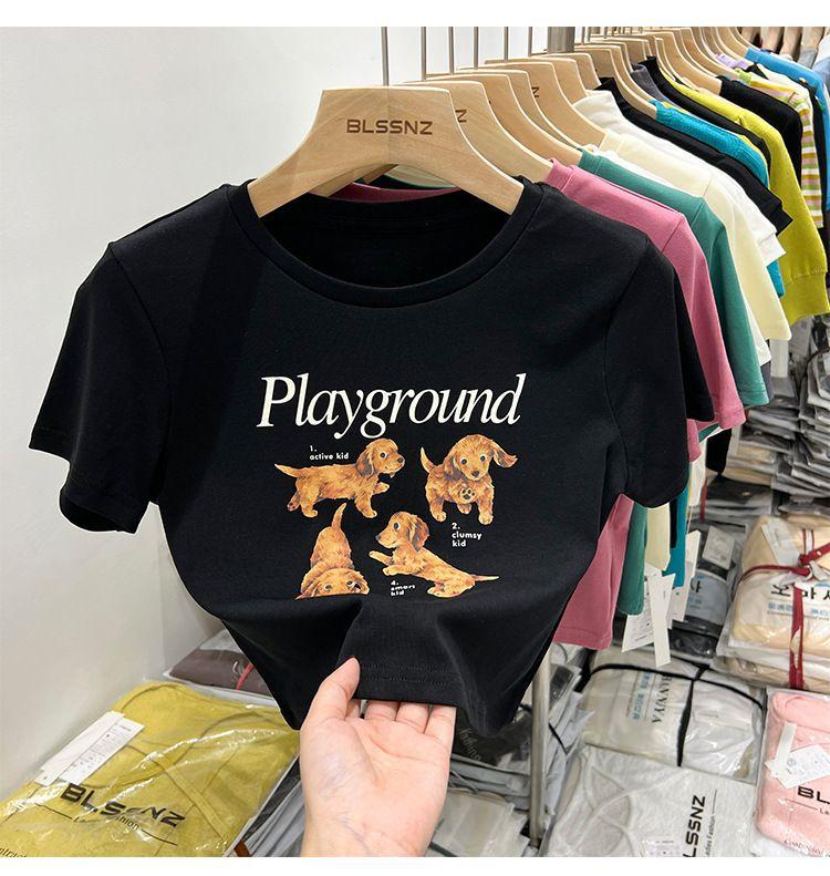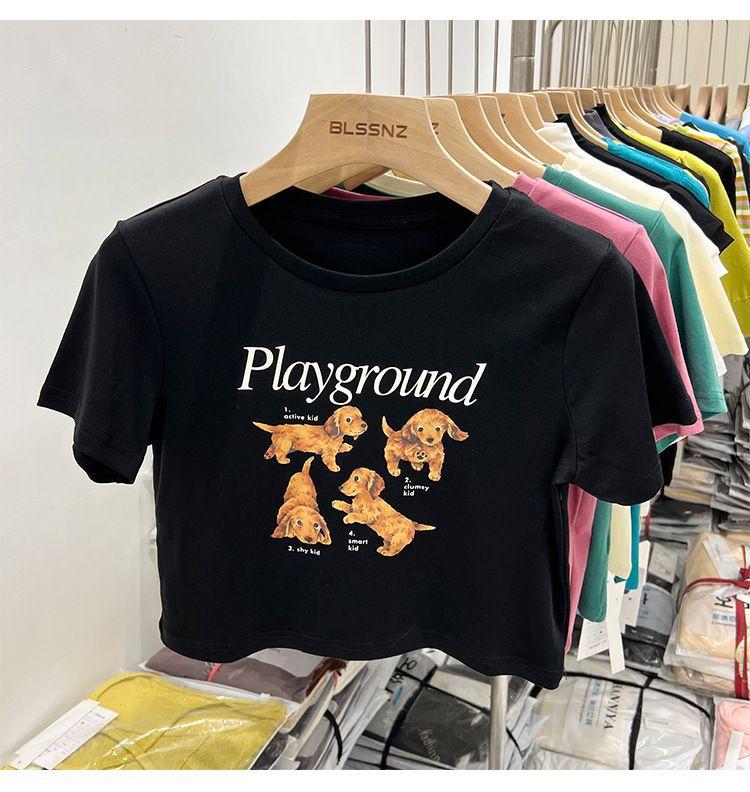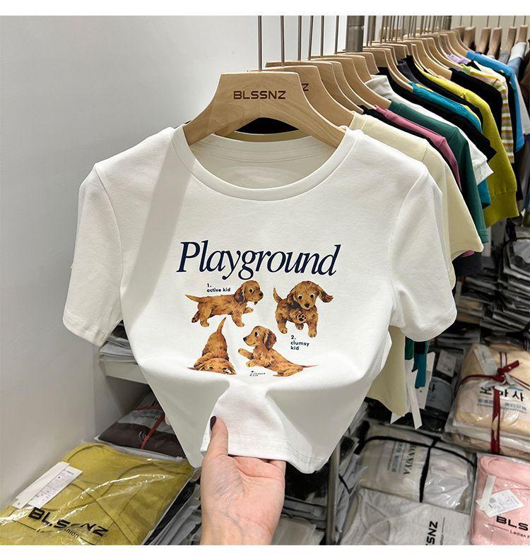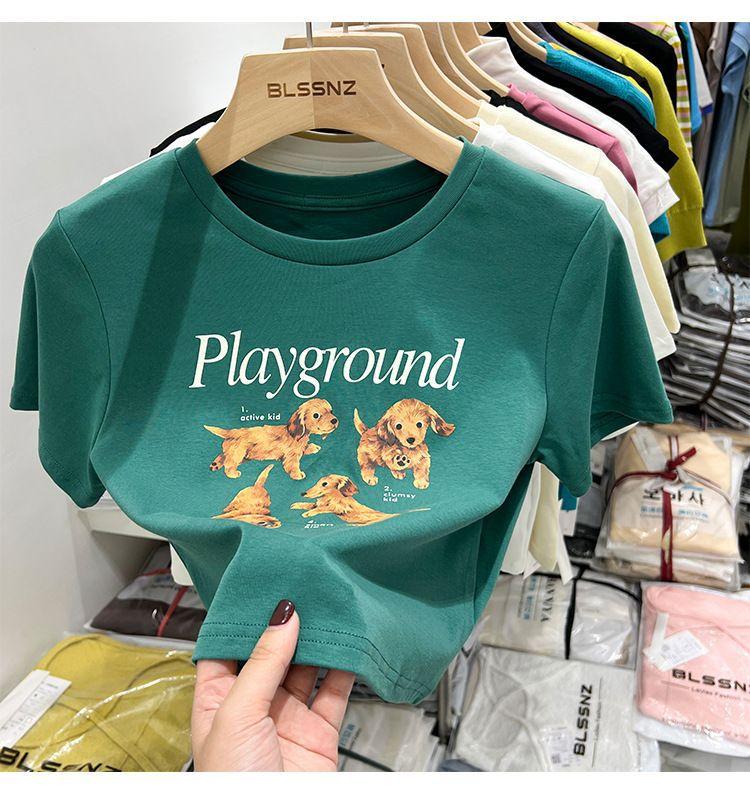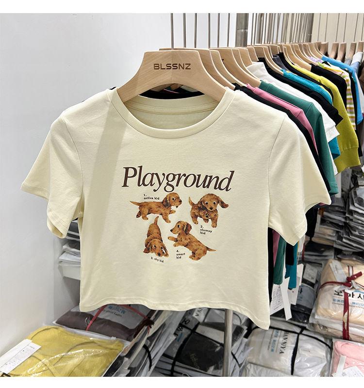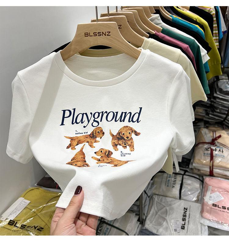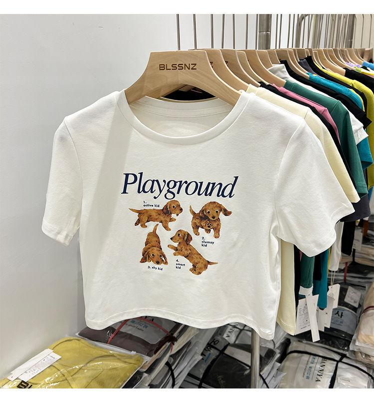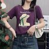 Camiseta de hombro estilo americano para mujer, de manga corta, de verano, nueva, estampada, única, elegante, moderna, adelgazante, camiseta corta