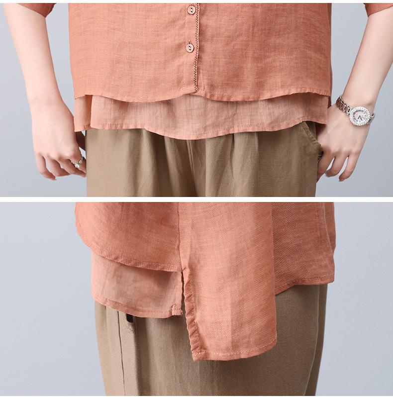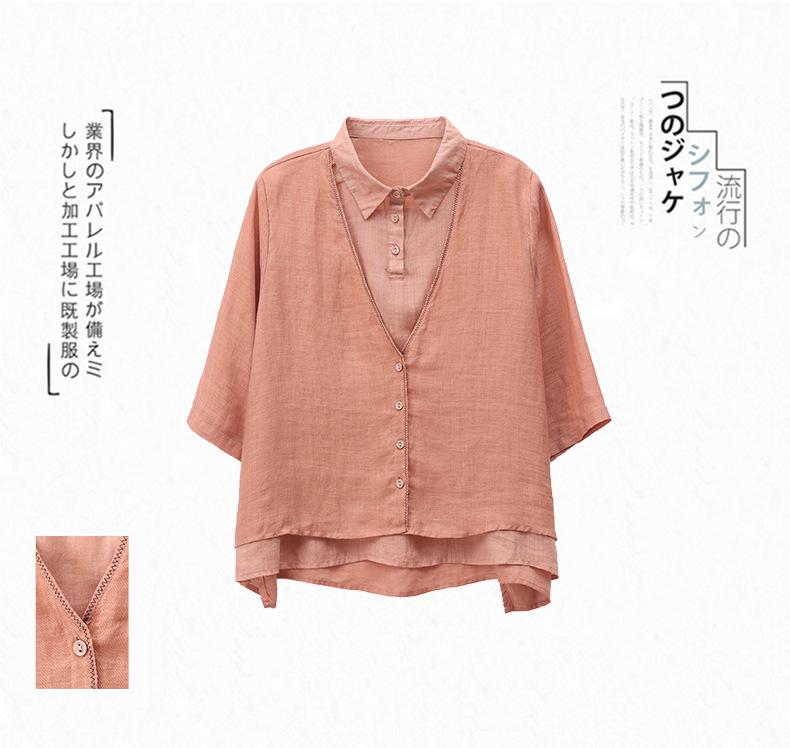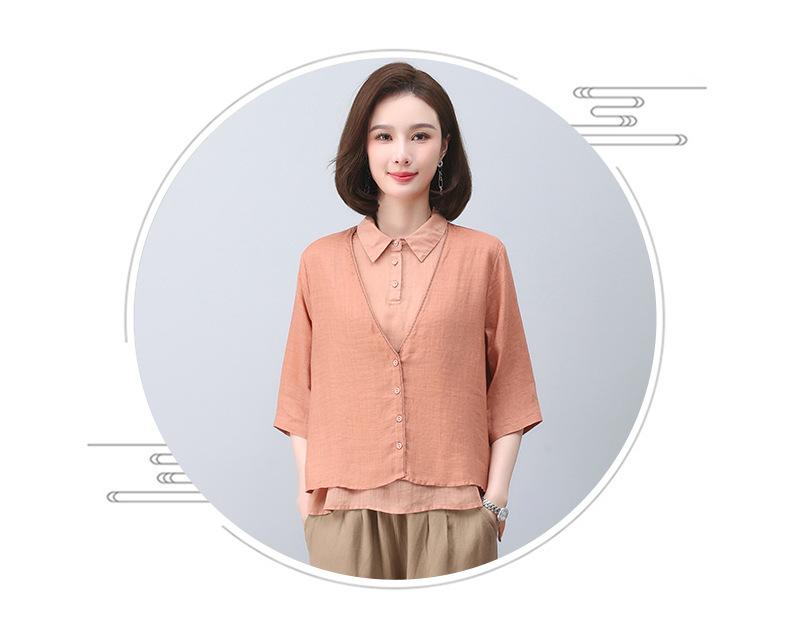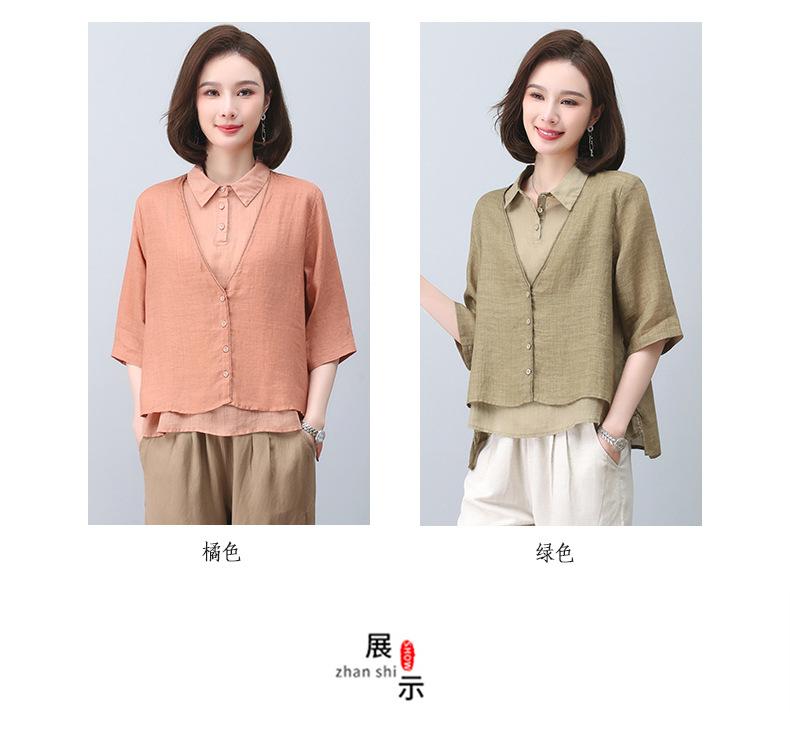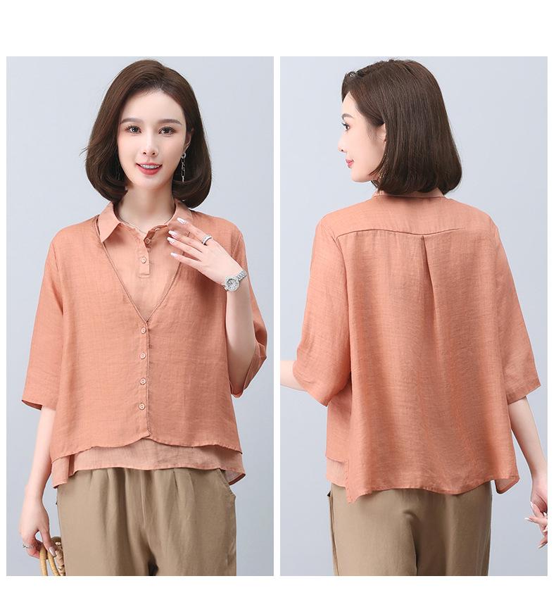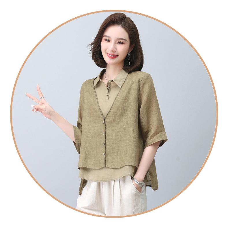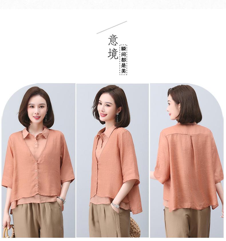 Camisa de ramio de alta gama para mujer, de manga corta, nueva, 2024, suelta, de verano, para madres de mediana edad, estilo occidental, falsa, de dos piezas.