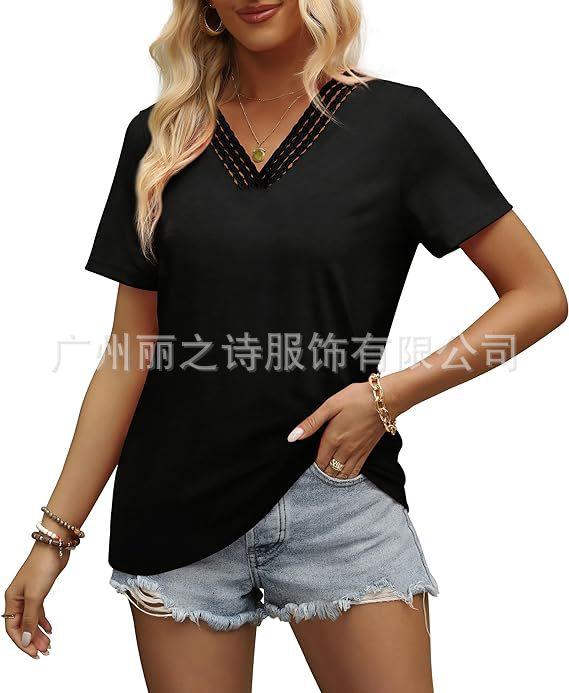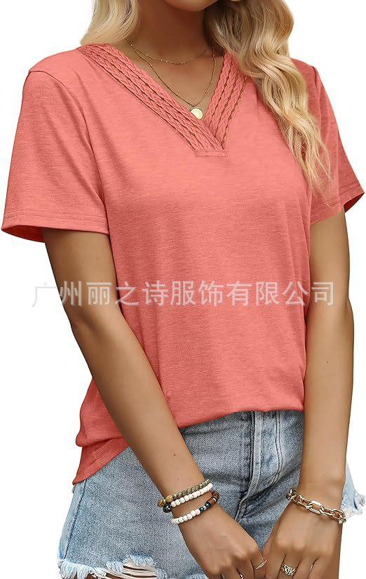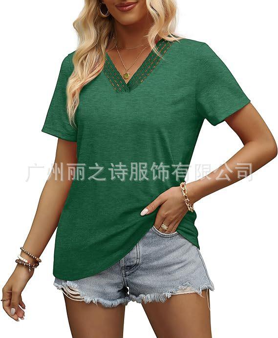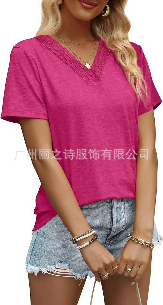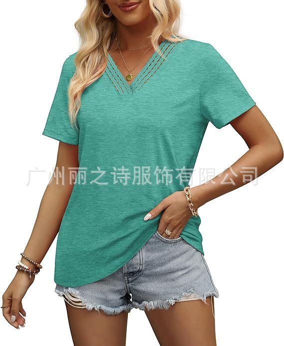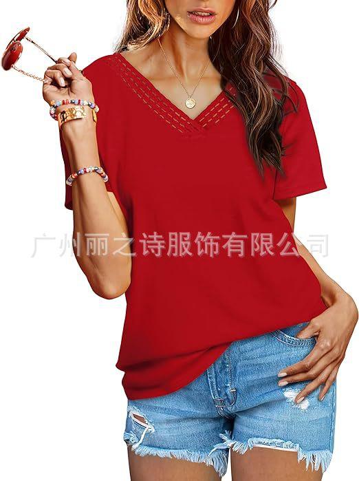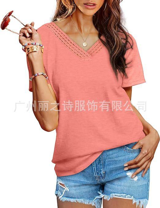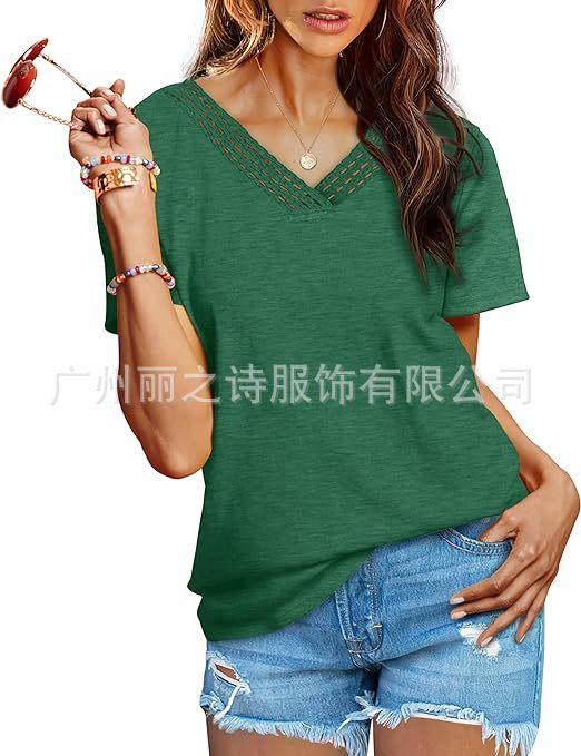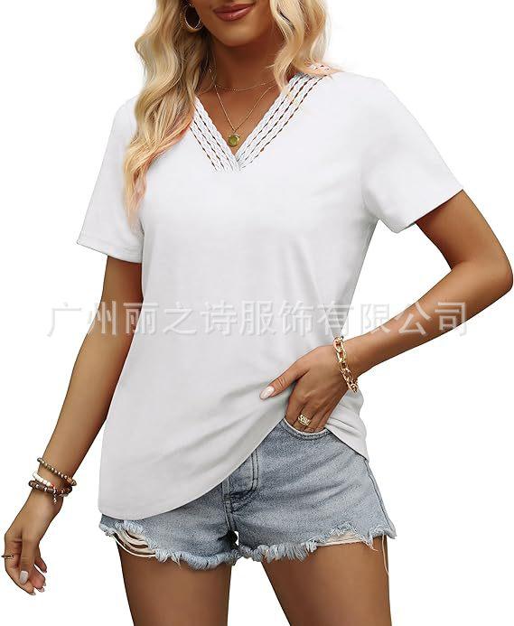Amazon 2024 Transfronterizo Europeo y Americano Verano Nuevo Casual Cuello en V Encaje Manga Corta Suelto Camiseta de Mujer