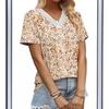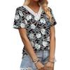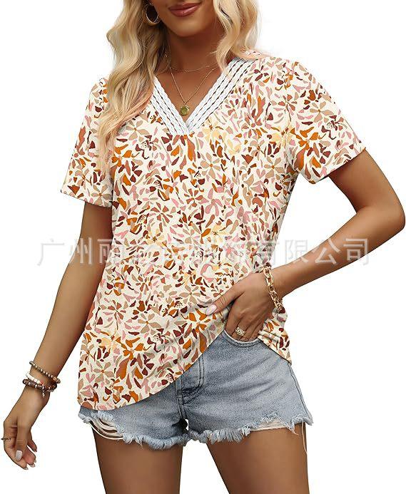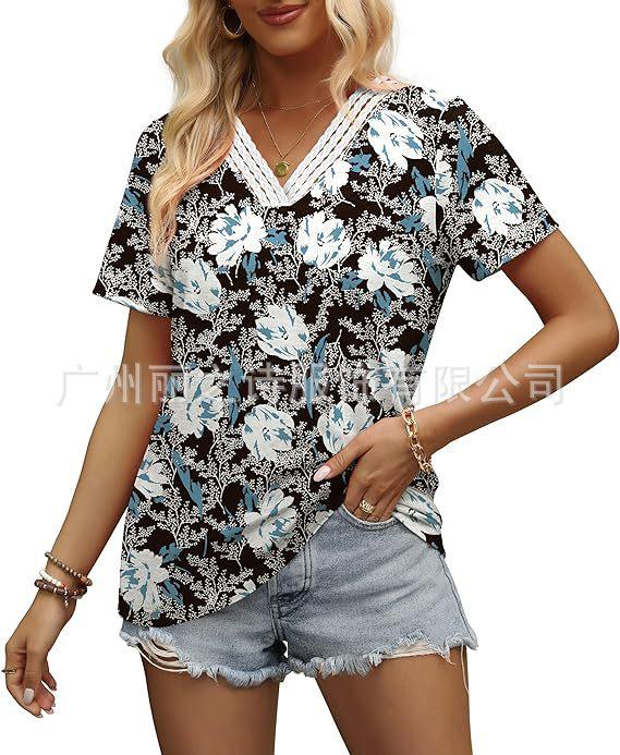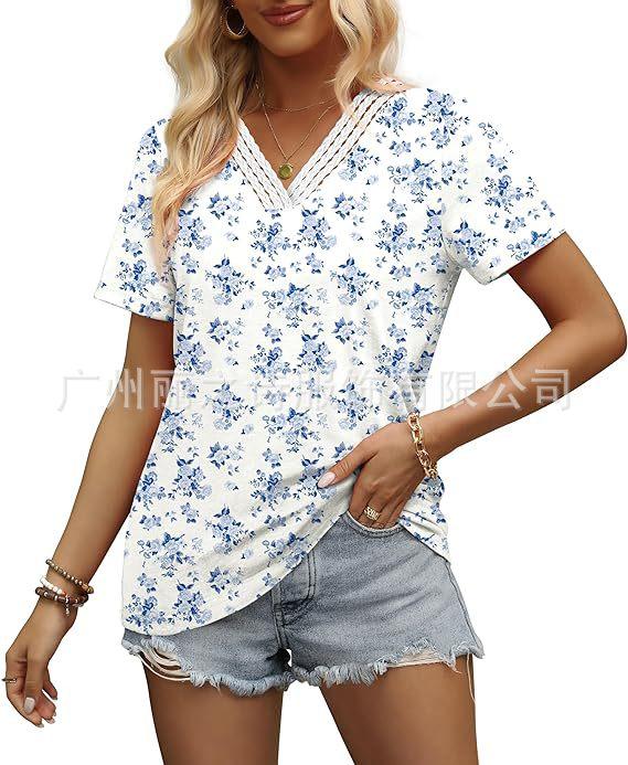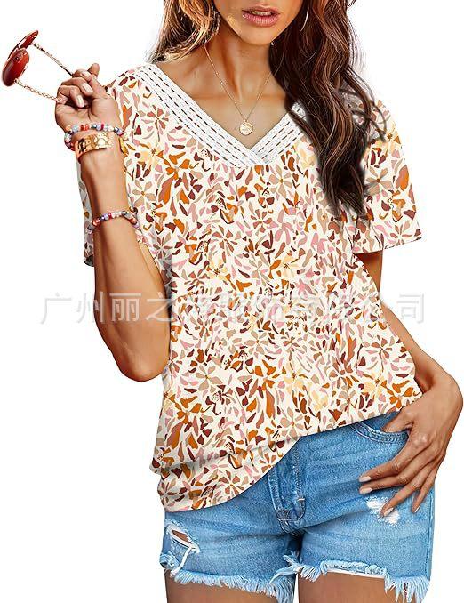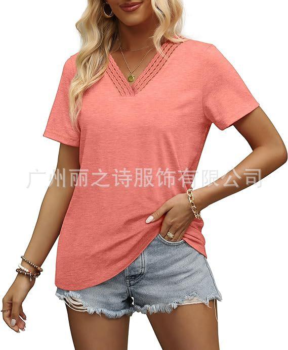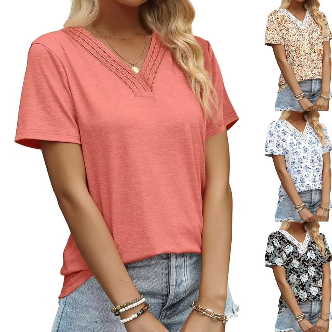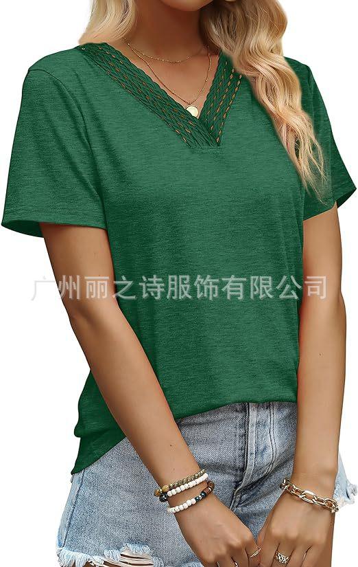 Amazon 2024 Transfronterizo Europeo y Americano Verano Nuevo Casual Cuello en V Encaje Manga Corta Suelto Camiseta de Mujer