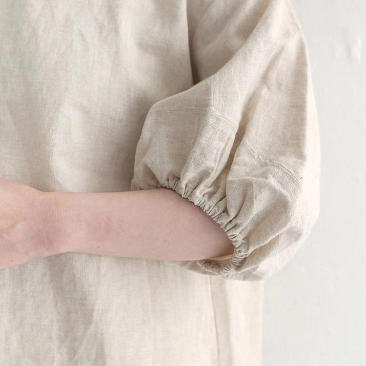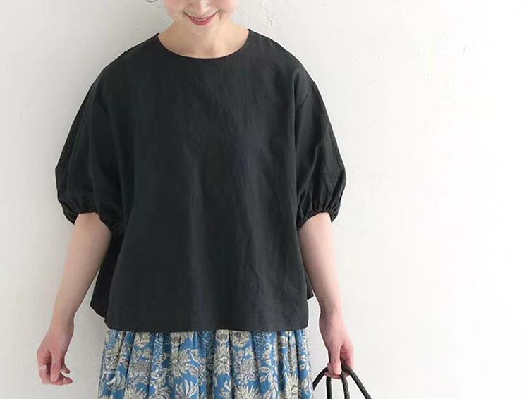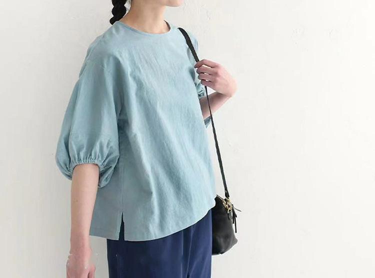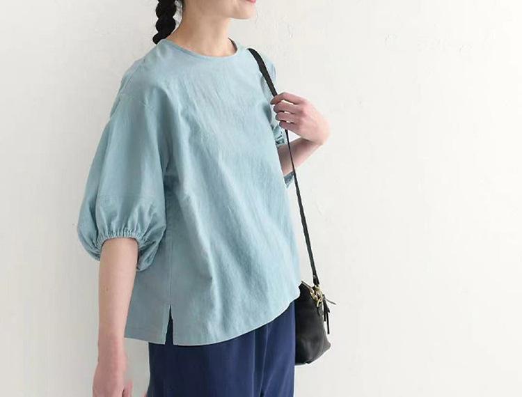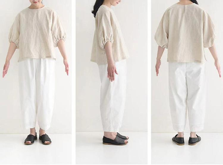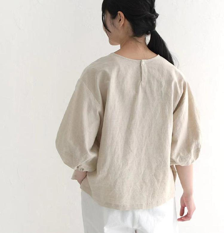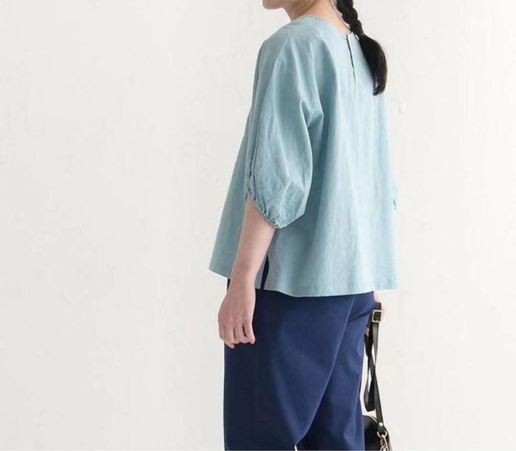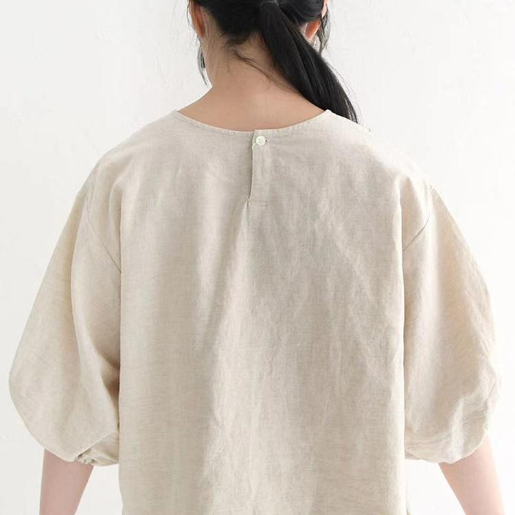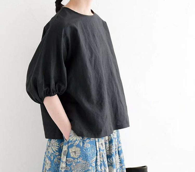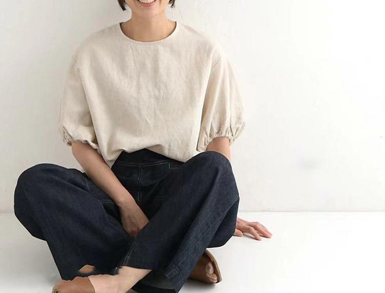 Camiseta de verano de algodón y lino de color liso para mujer, holgada, fresca, transpirable, con mangas abullonadas