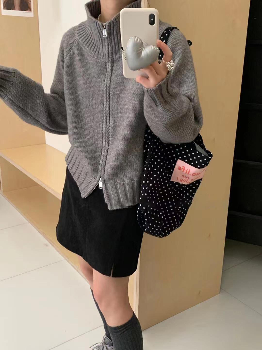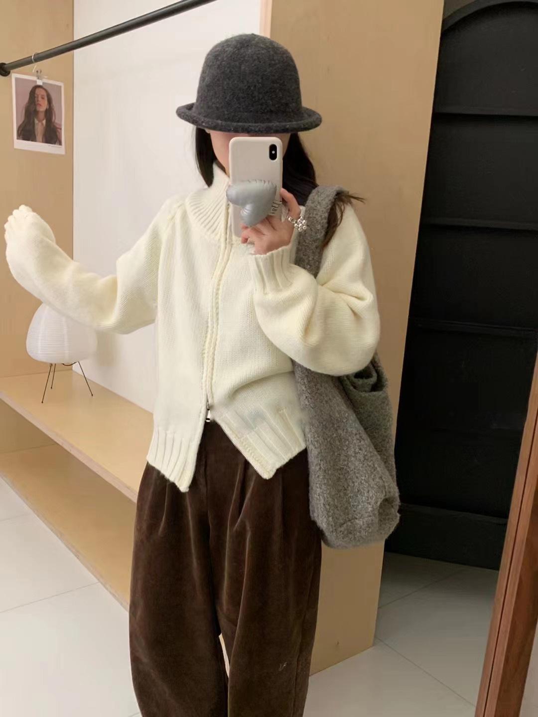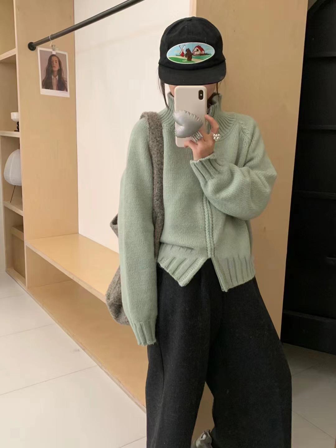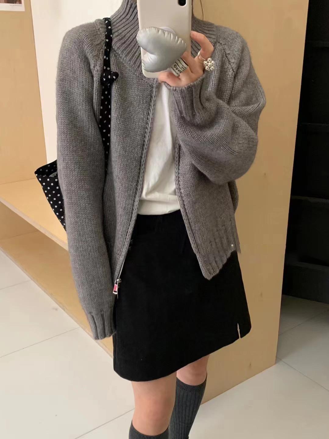 Primavera 2024 Nuevo estilo coreano, cárdigan de punto con cuello alto y cremallera de color sólido, abrigo informal holgado y adelgazante para mujer