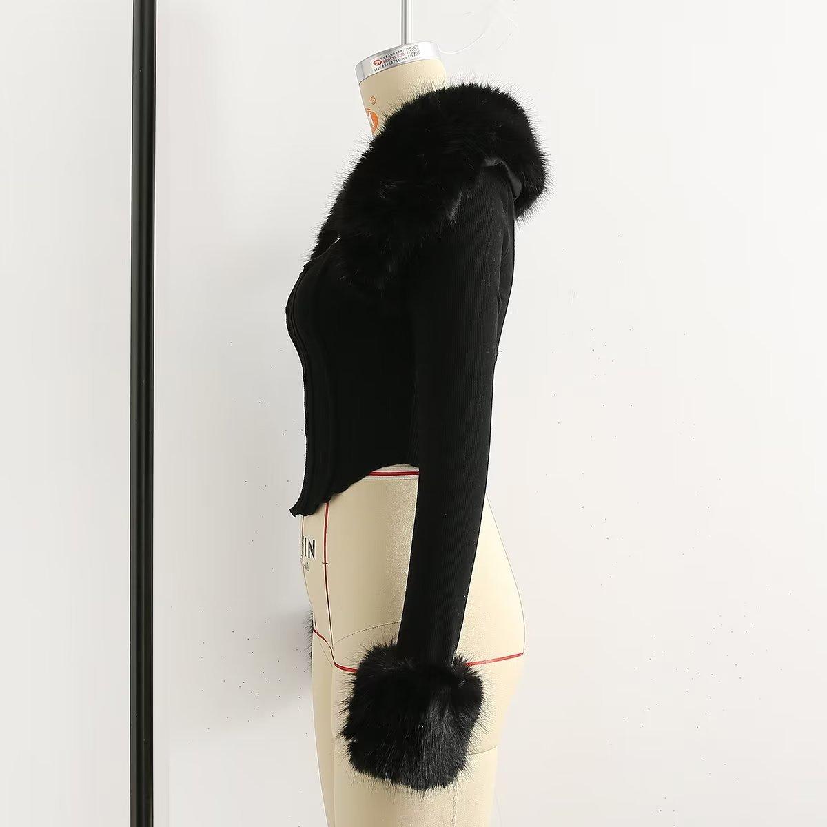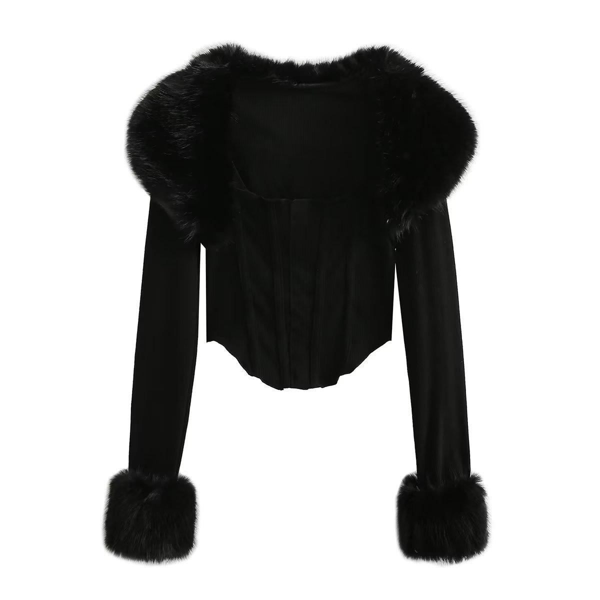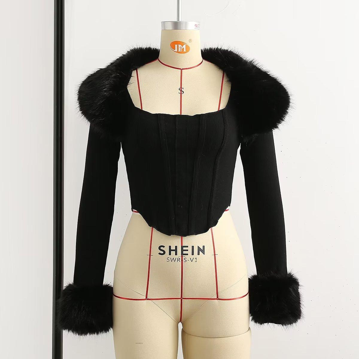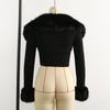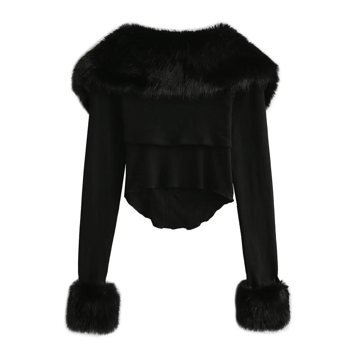 Otoño e invierno nuevo estilo europeo y americano para mujer, top corto de dos piezas con cuello de piel sintética entallado W4512