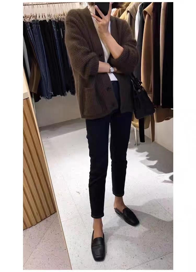 Cárdigan de Lana Estilo Europeo Nuevo para Mujer Cuello en V Largo Medio Suelto Grueso Holgazán Talla Grande Chaqueta Suéter de Punto de Lana