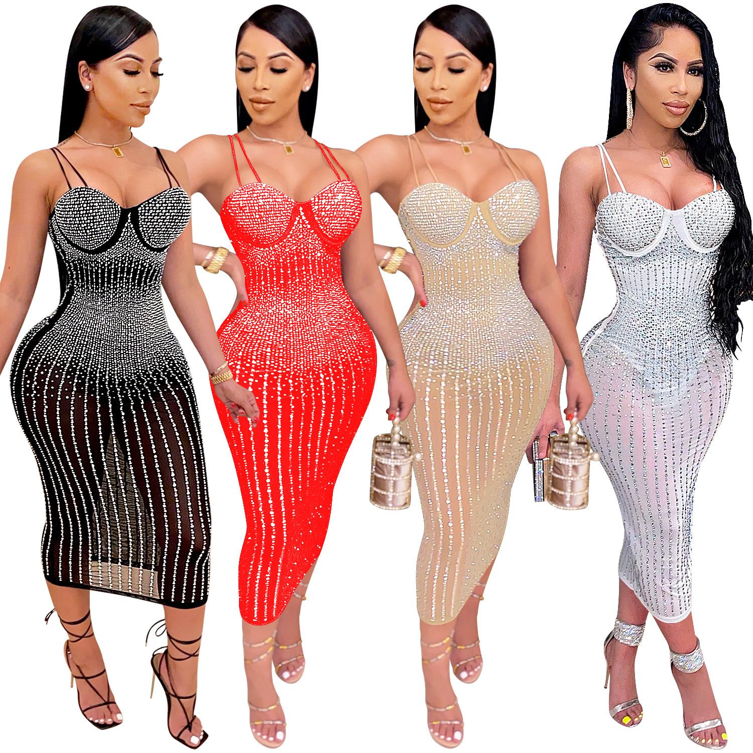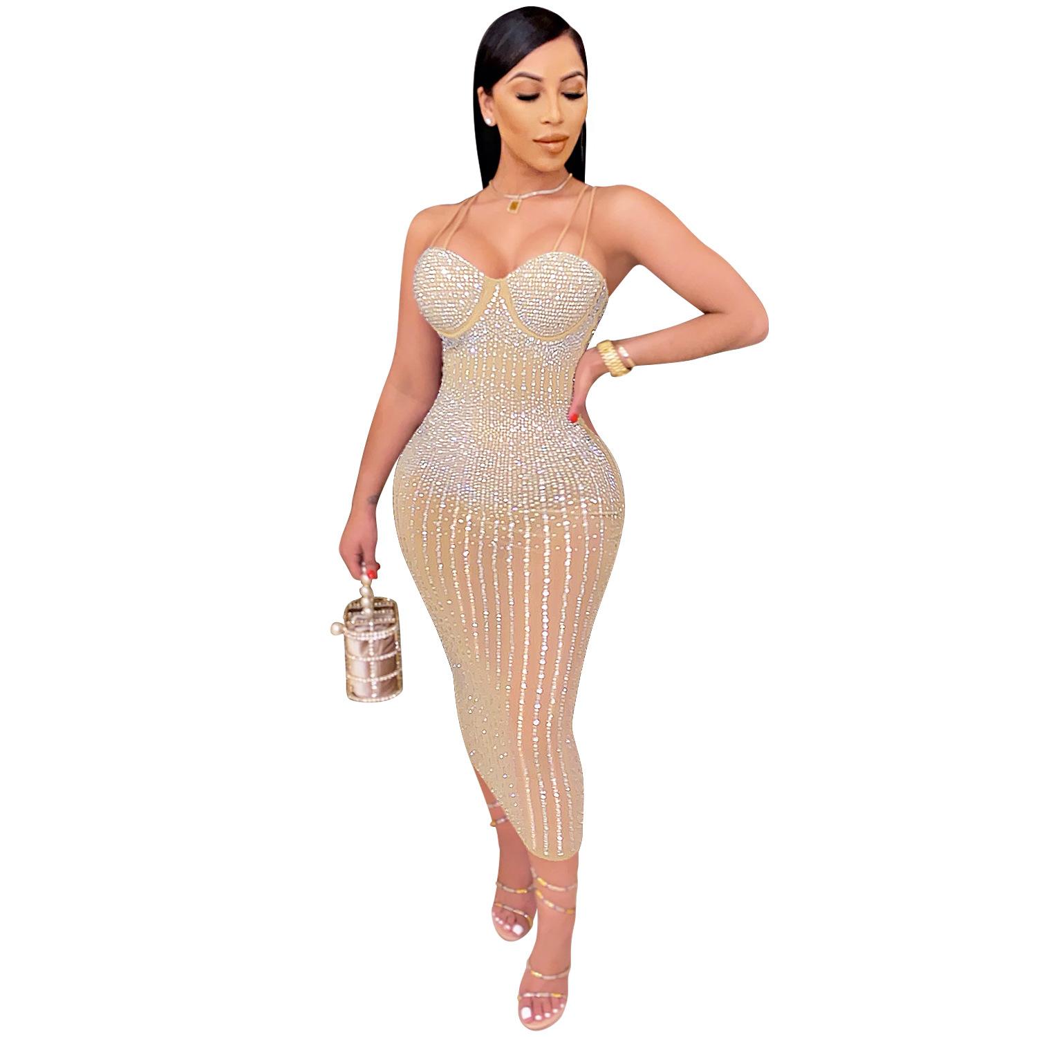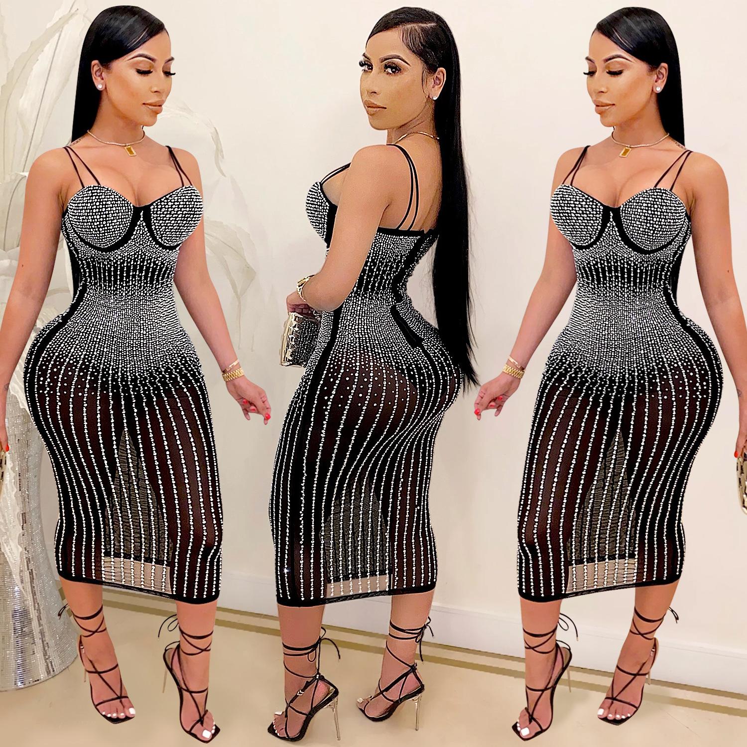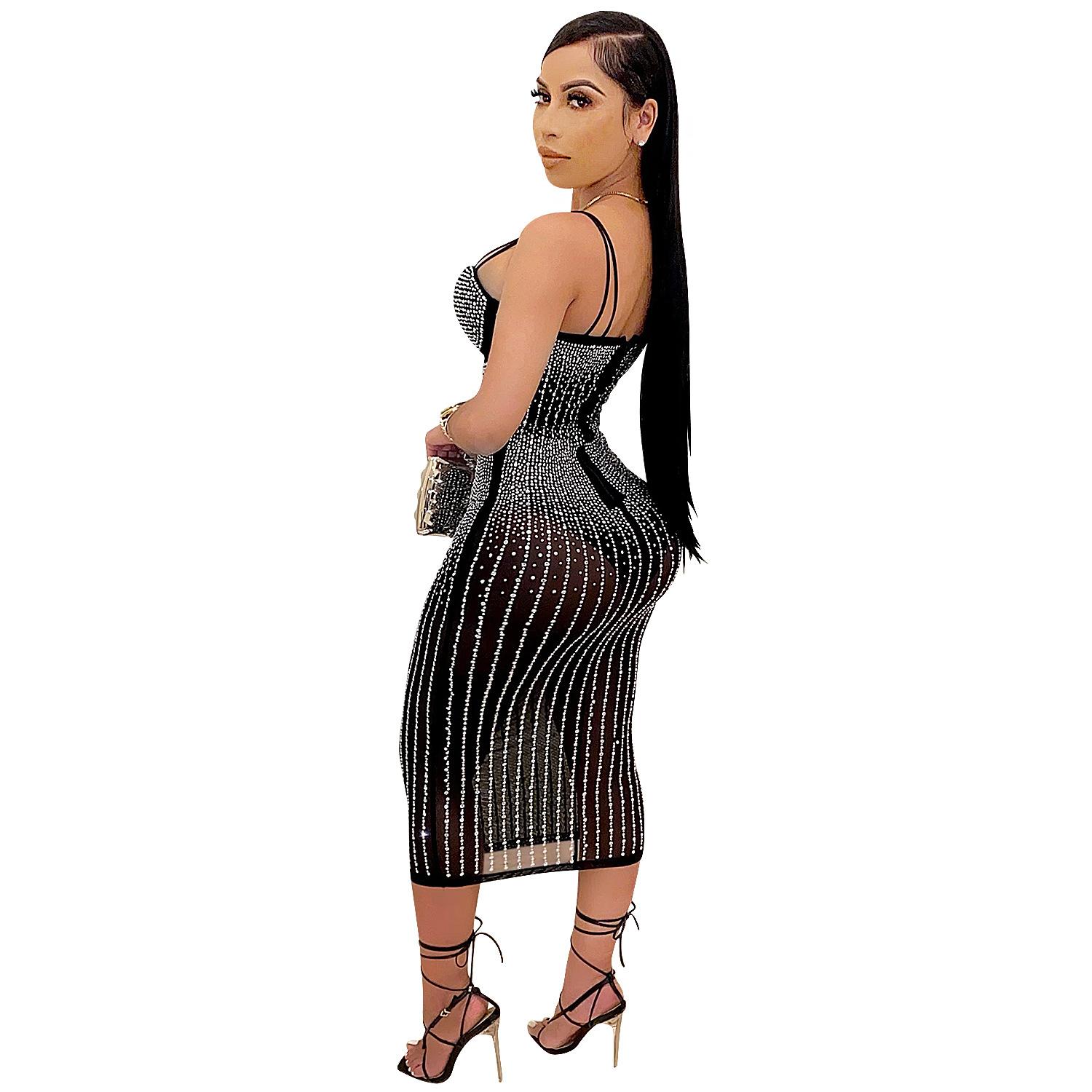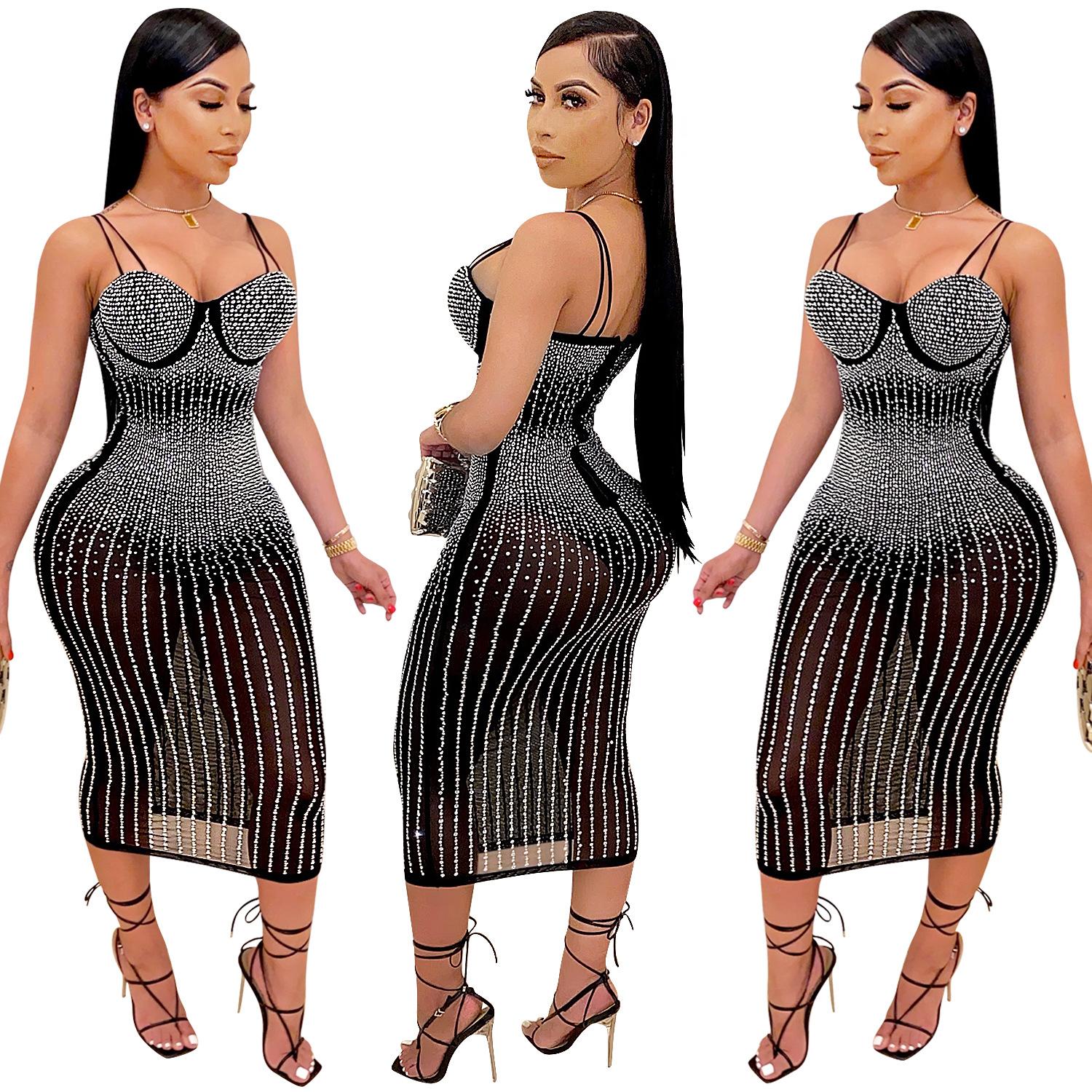 X3805 nuevo transfronterizo moda europea y americana ropa de mujer Fiesta club nocturno malla transparencia pedrería Diamante tirantes vestido