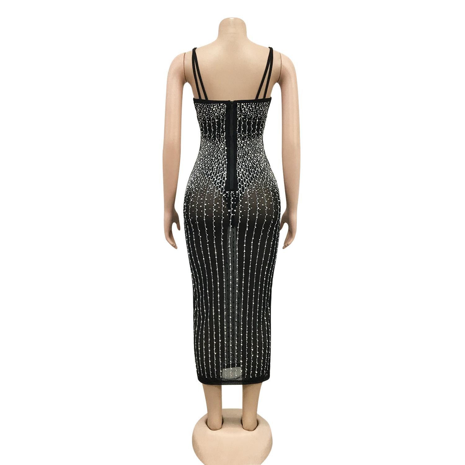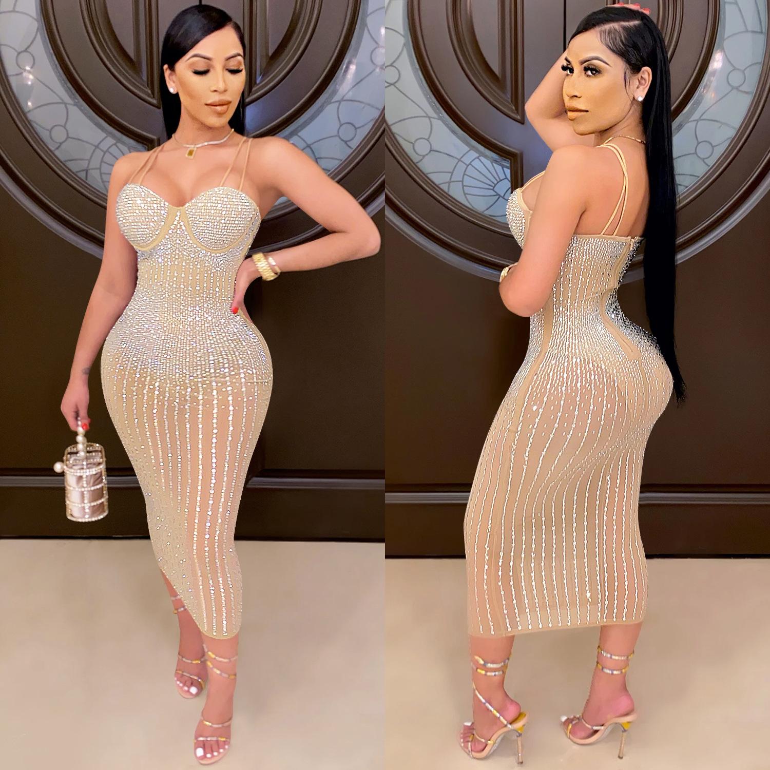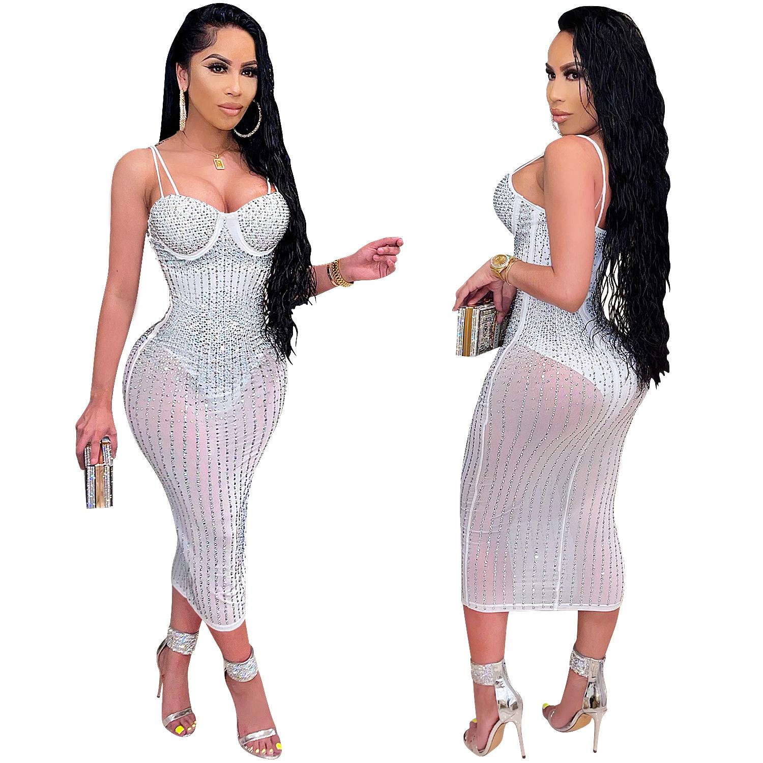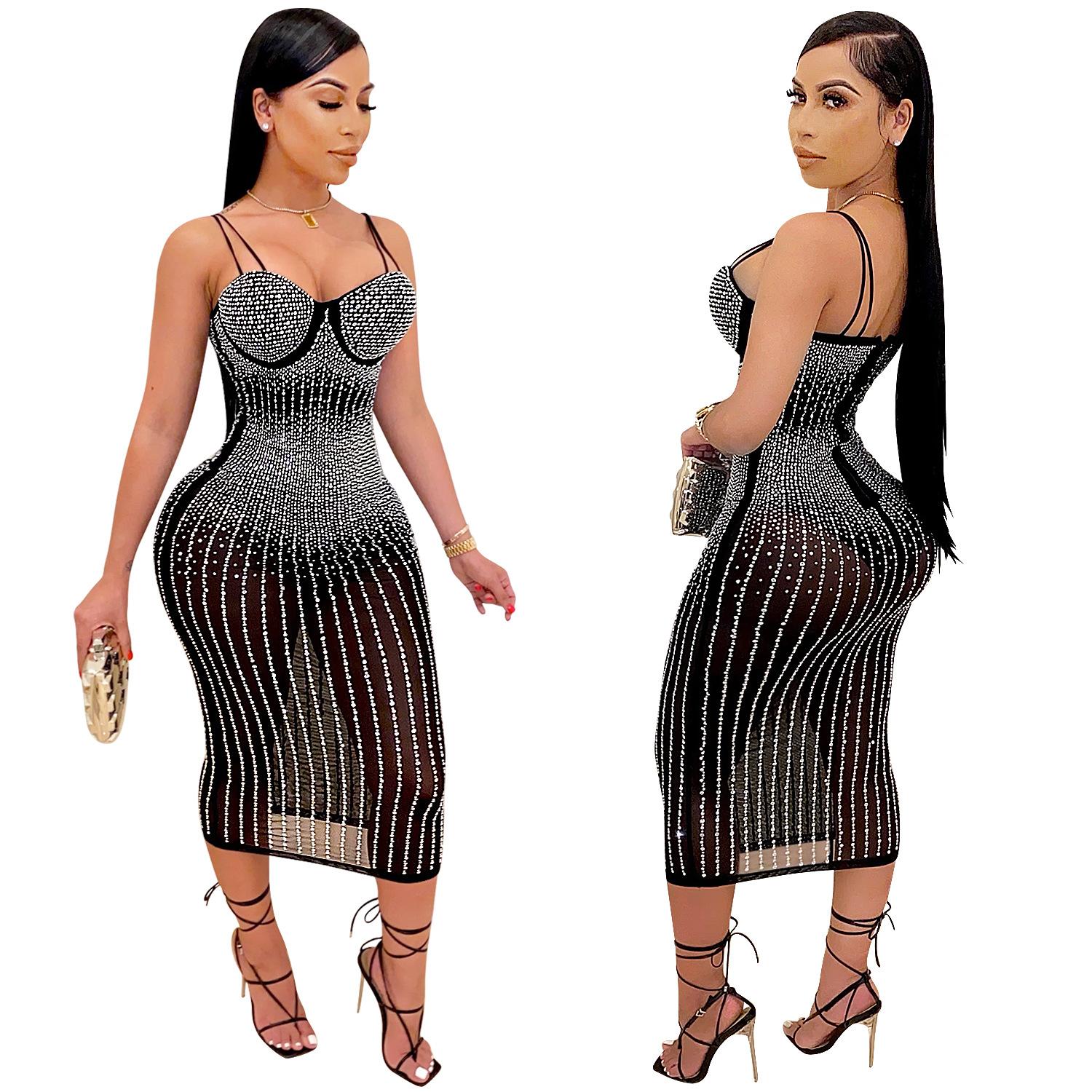 X3805 nuevo transfronterizo moda europea y americana ropa de mujer Fiesta club nocturno malla transparencia pedrería Diamante tirantes vestido